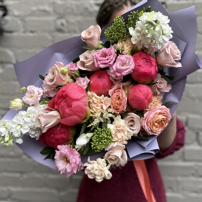 Авторский букет Коралловый риф оправдывает свое название своей яркостью и фактурностью. Стильный букет можно прислать в качестве подарка женщине или молодой девушке. В состав этого прекрасного букета входят коралловые пионы. Раскрытие и уникальность этого пиона поражает. В бутоне этого цветка много лепестков, но несмотря на это, внутри он не махровый, вместо стандартного помпона там ярко желтые тычинки. Когда пион постоит несколько дней в воде он начинает менять цвет от ярко-розового почти до белого. Также в этом букете присутствует ароматная маттиола и фрезия.