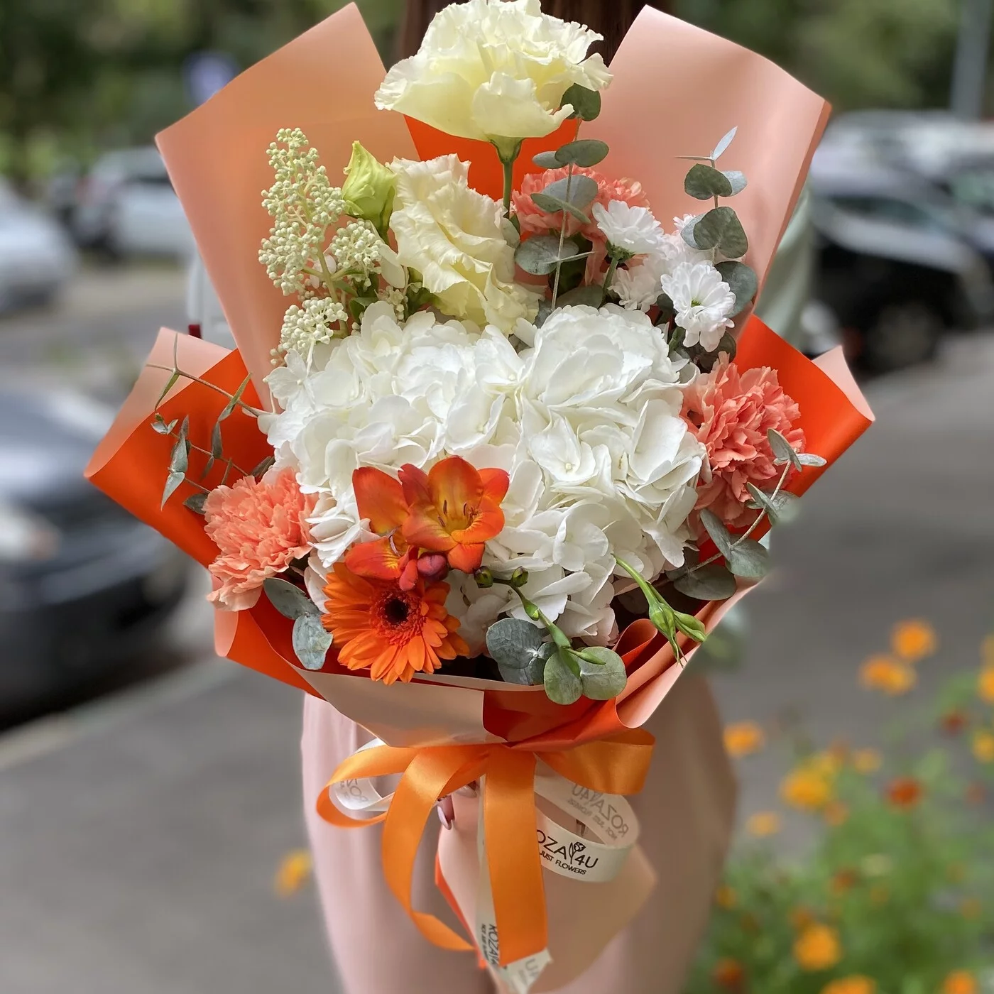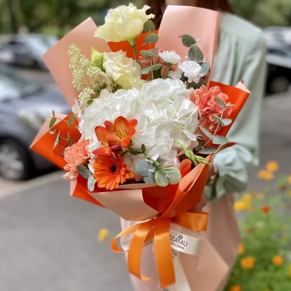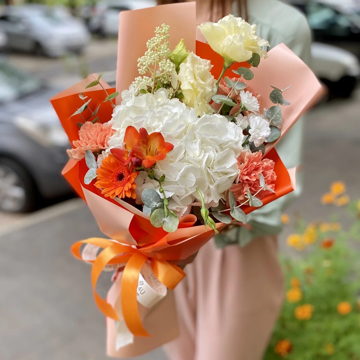 Каскадный букет в бело-оранжевой гамме. В состав букета входит пушистая гортензия и ароматная фрезия. Букет упакован в стильную корейскую пленку.