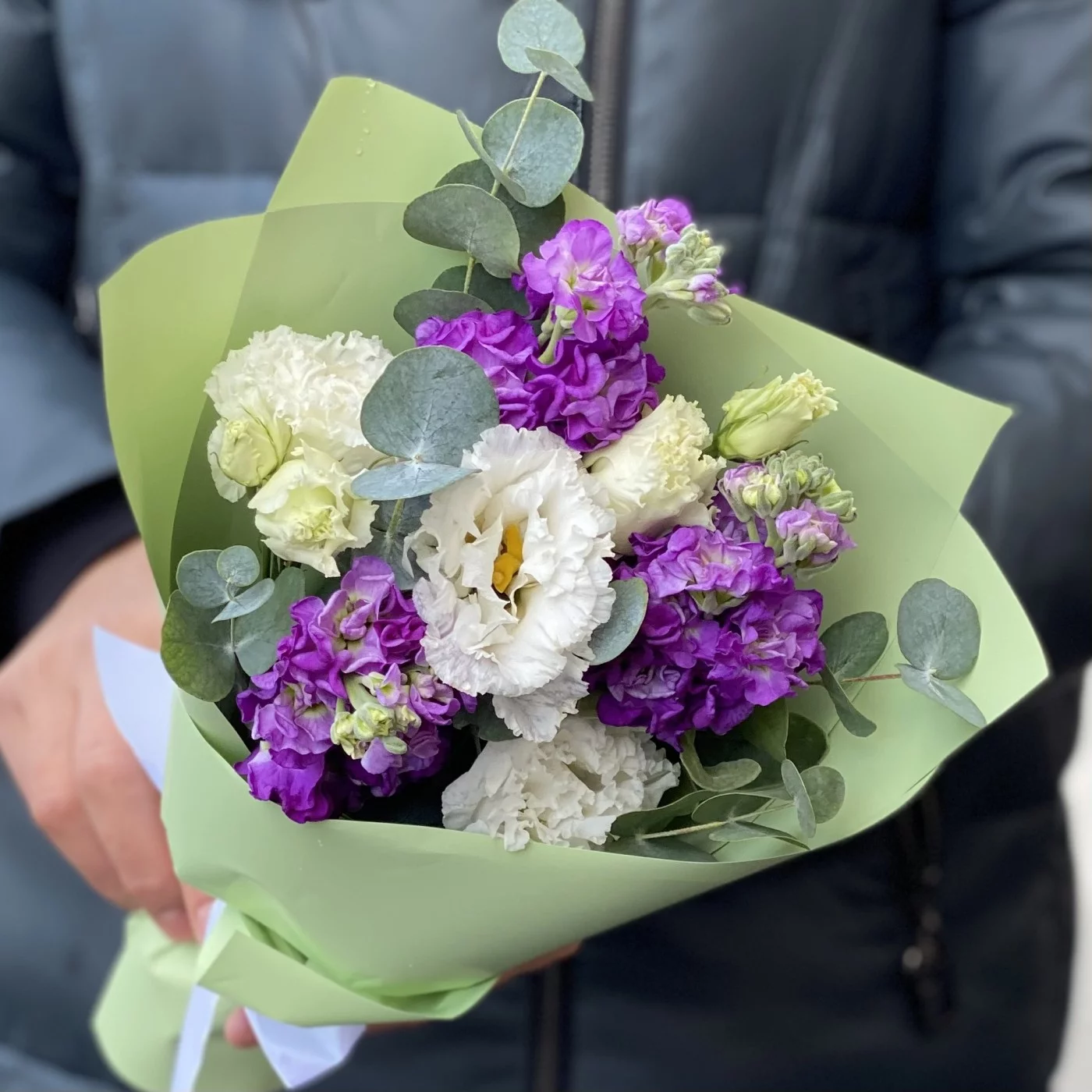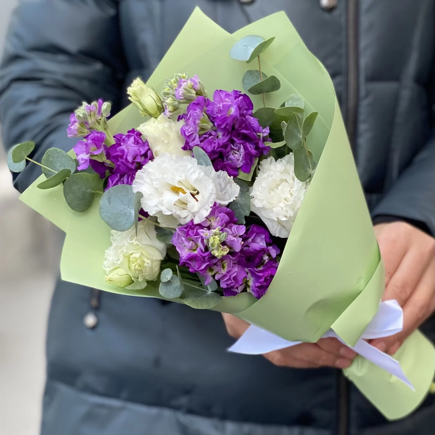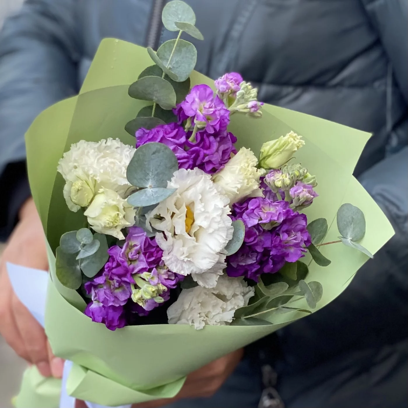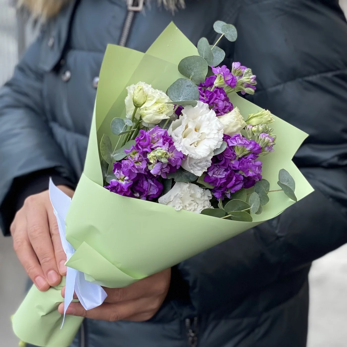 Воздушный, компактный и обворожительный дуэт маттиолы и эустомы с веточкой эвкалипта - нескучный вариант для комплимента или корпоративного поздравления.