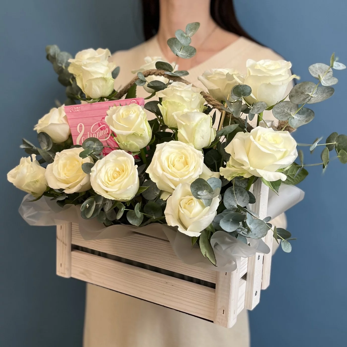 Эта изысканная композиция из 15 белых роз, оформленная в стильном деревянном ящике, станет идеальным подарком для вашей мамы.