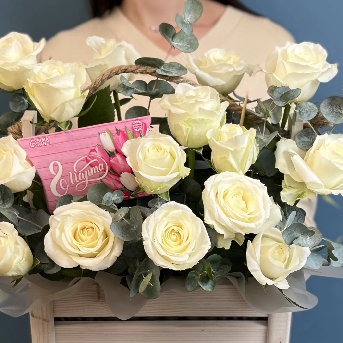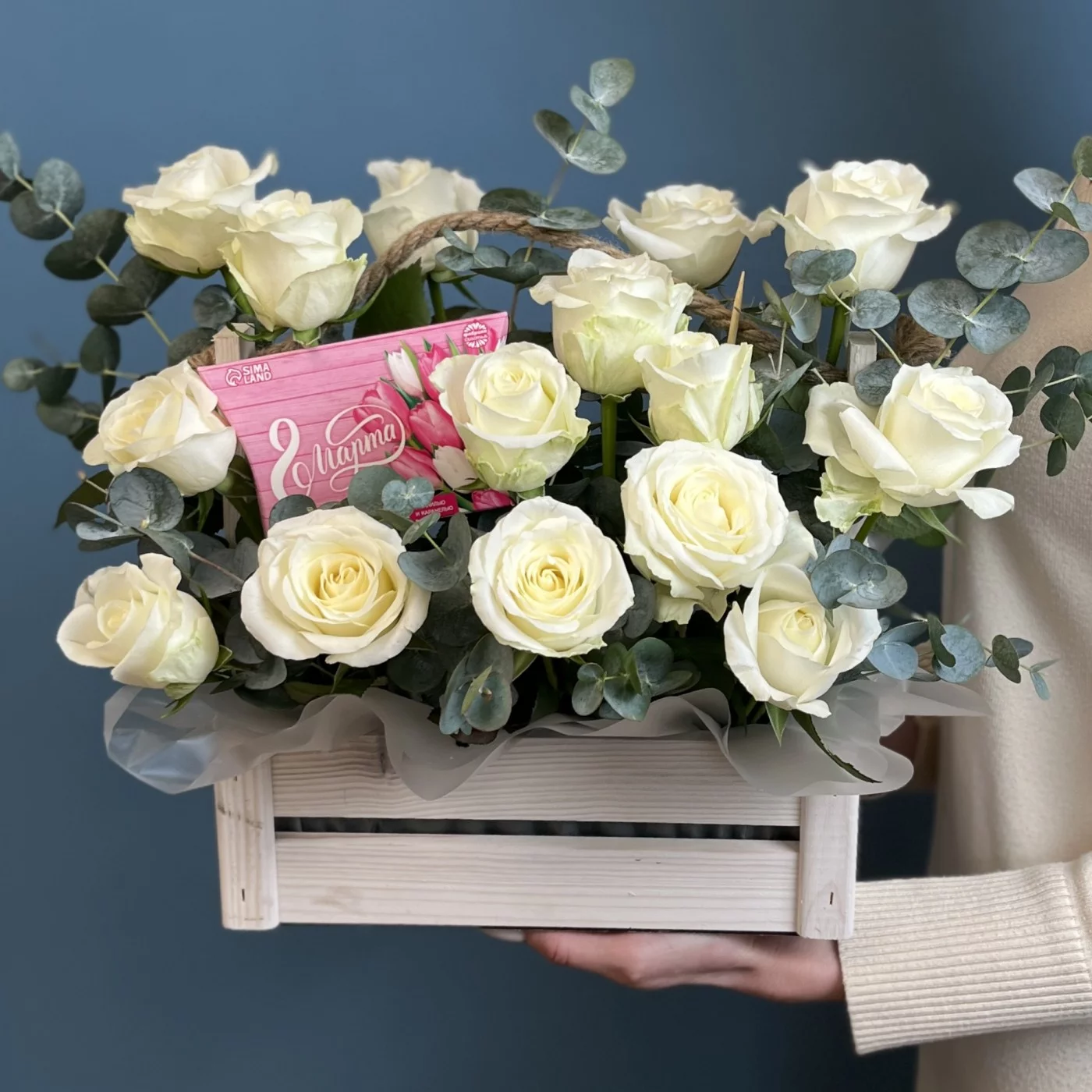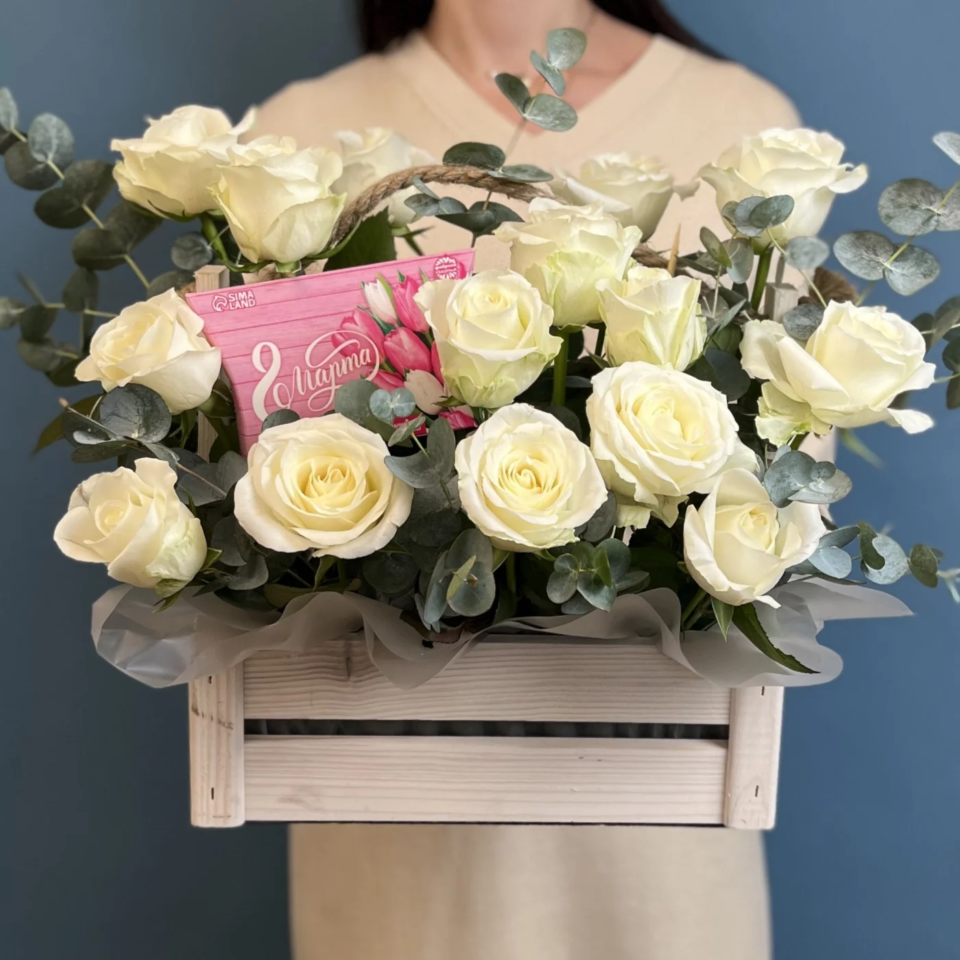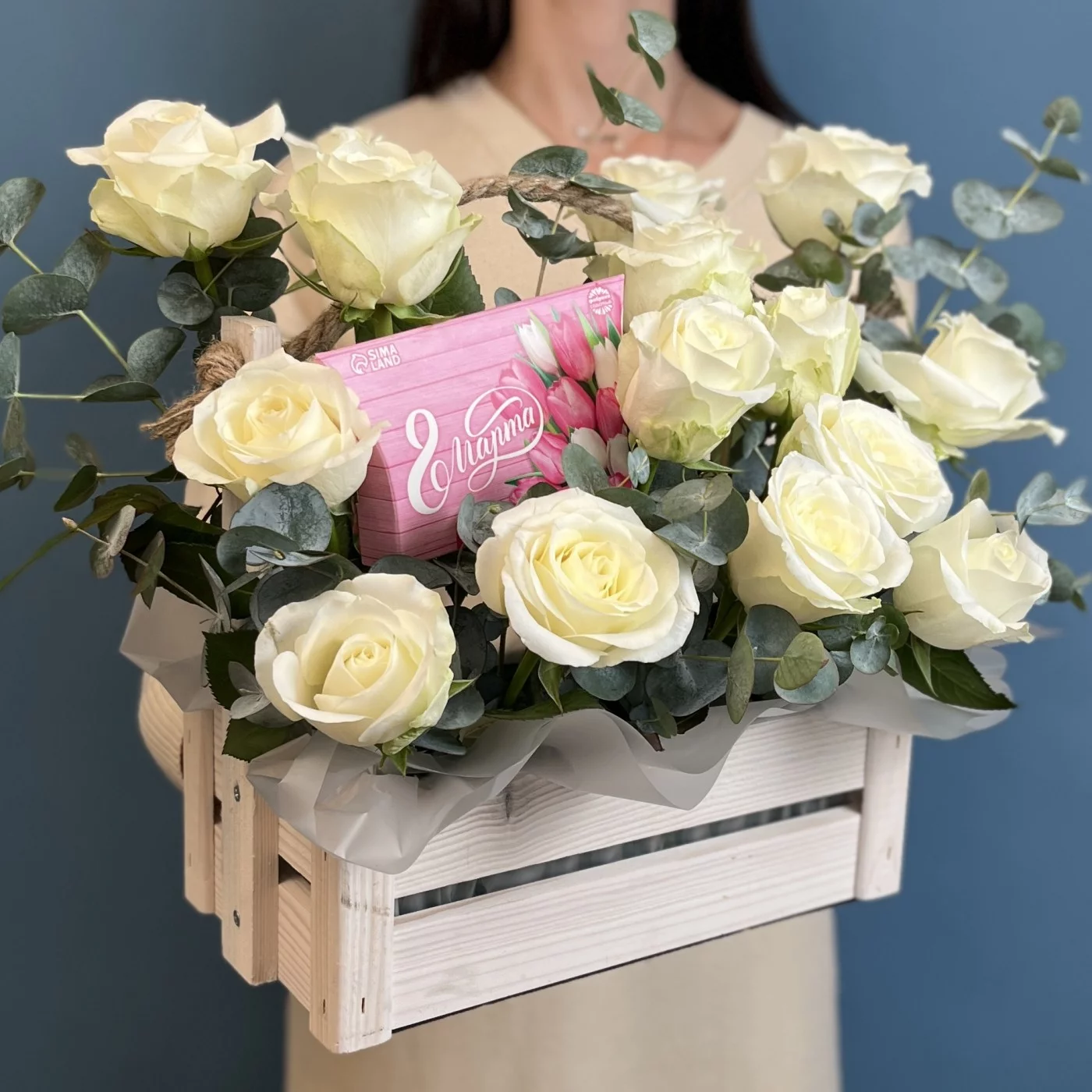 Белые розы в деревянном ящике с 8 марта
