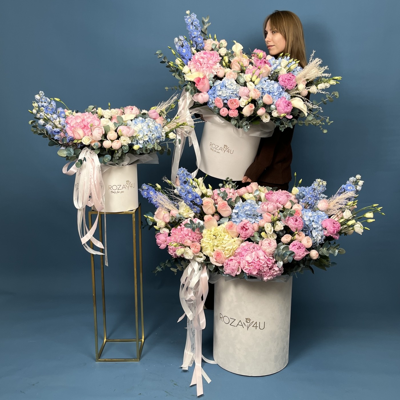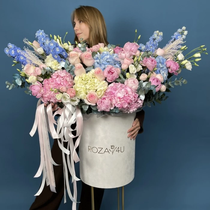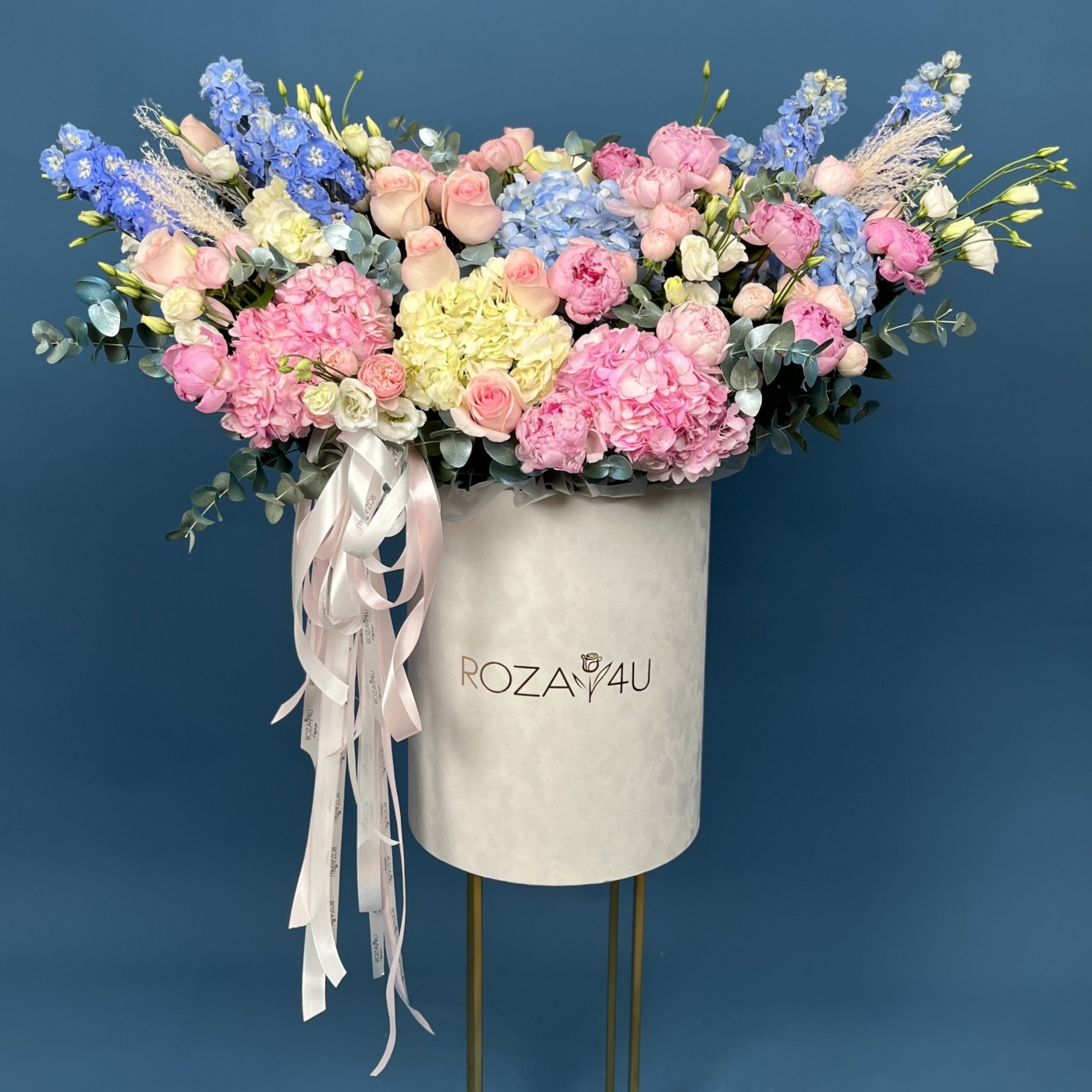 Мы тщательно отобрали самые свежие и благоухающие цветы, чтобы создать эту воздушную и деликатную композицию. Мягкие, пастельные оттенки голубого и розового переплетаются в завораживающем танце, создавая ощущение легкости и безмятежности. Каждый цветок, будь то трепетная роза, изящный пион или воздушная гортензия, излучает свою неповторимую прелесть, гармонично дополняя общую картину.