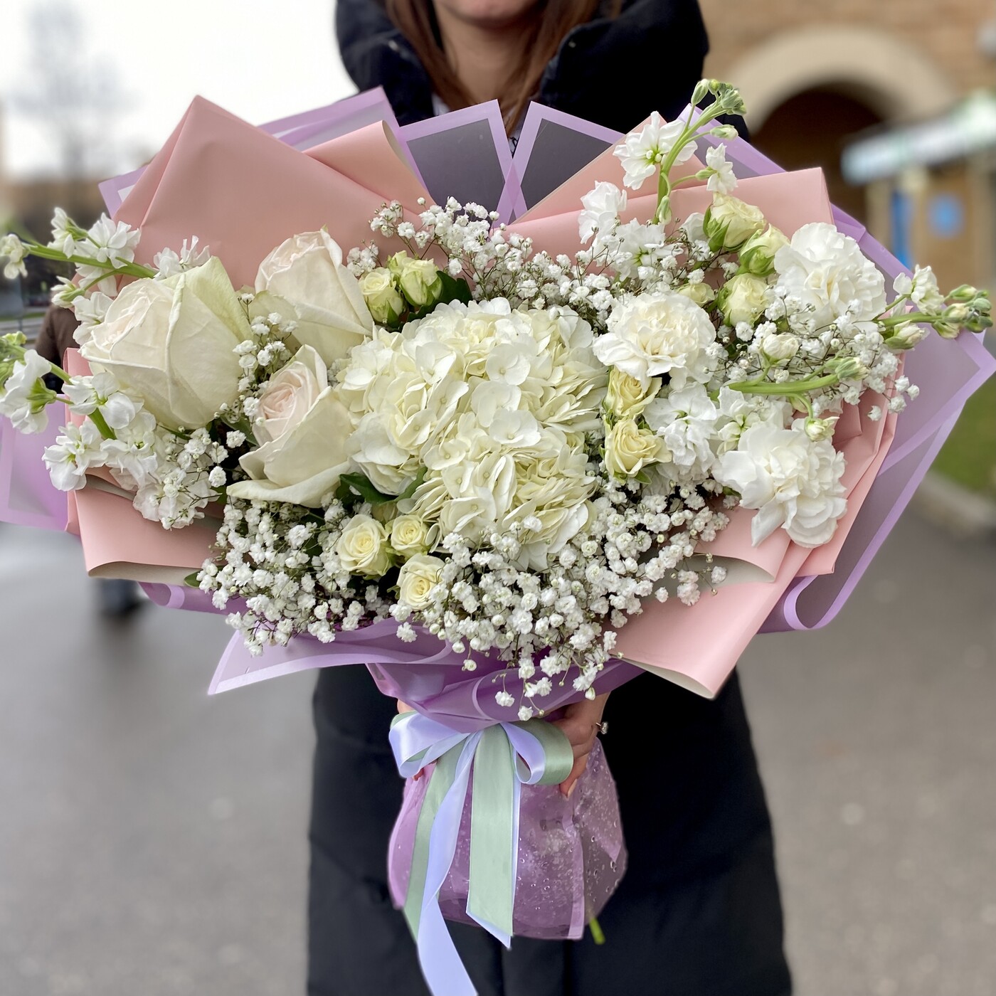 Нежный букет на день рождения, маме или любимой. В состав букета входят белая гортензия, ароматная пионовидная роза и маттиола – сочетание этих ароматов делает этот букет незабываемым.