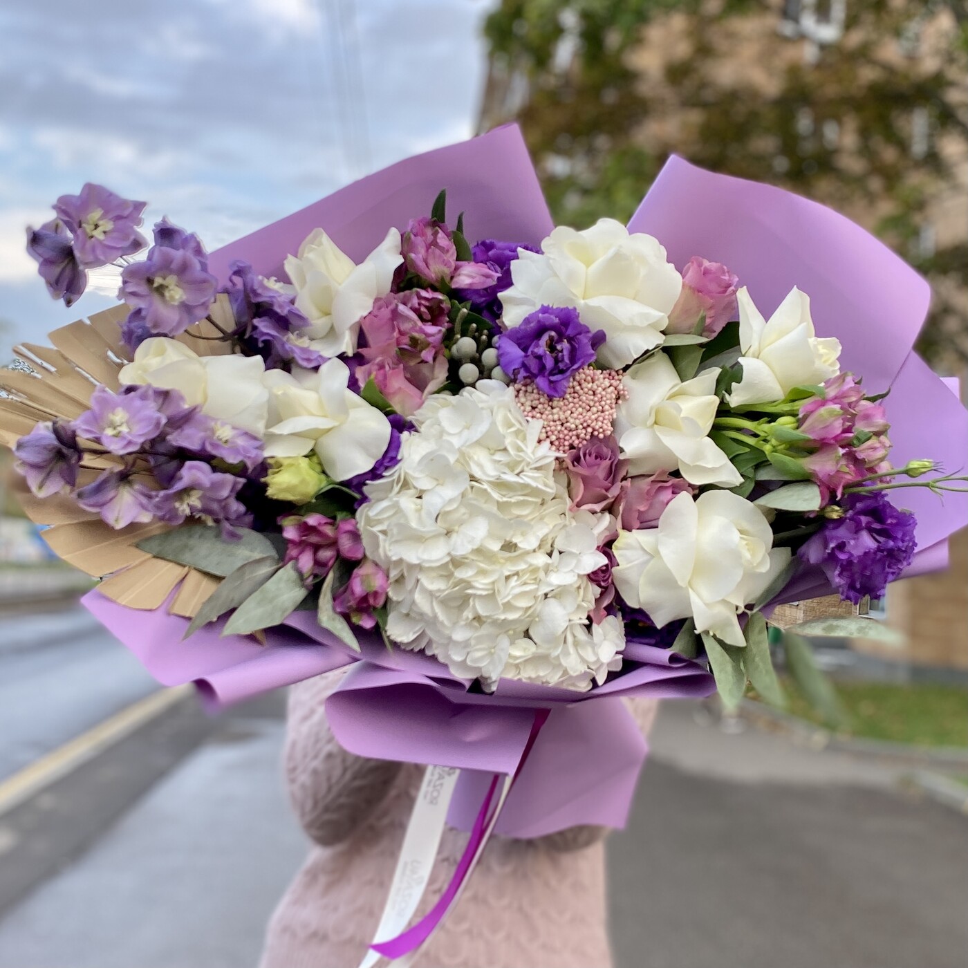 дельфиниум – 2, роза – 14, эустома – 2, сухоцвет пальма – 1, альстромерия – 3, бруния – 1, озотамнус – 1, эвкалипт – 1, рускус, упаковка.