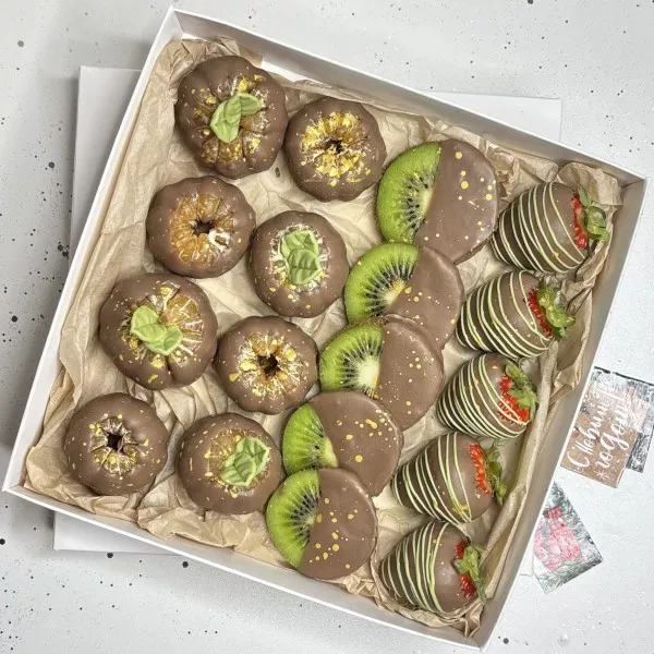Ароматные и сочный ягоды с фруктами в молочном шоколаде. Безумно вкусный и красивый подарочный набор для любителей сладенького.