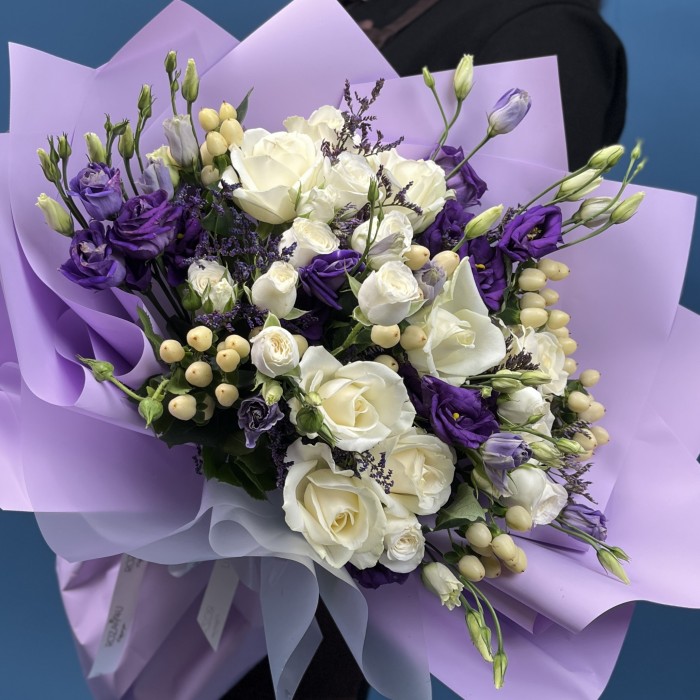Этот изысканный цветочный ансамбль создан для того, чтобы подарить ощущение спокойствия, гармонии и восхищения. Сочетание глубоких фиолетовых оттенков и чистого белого цвета создает завораживающий контраст, который притягивает взгляд и наполняет пространство особой атмосферой.