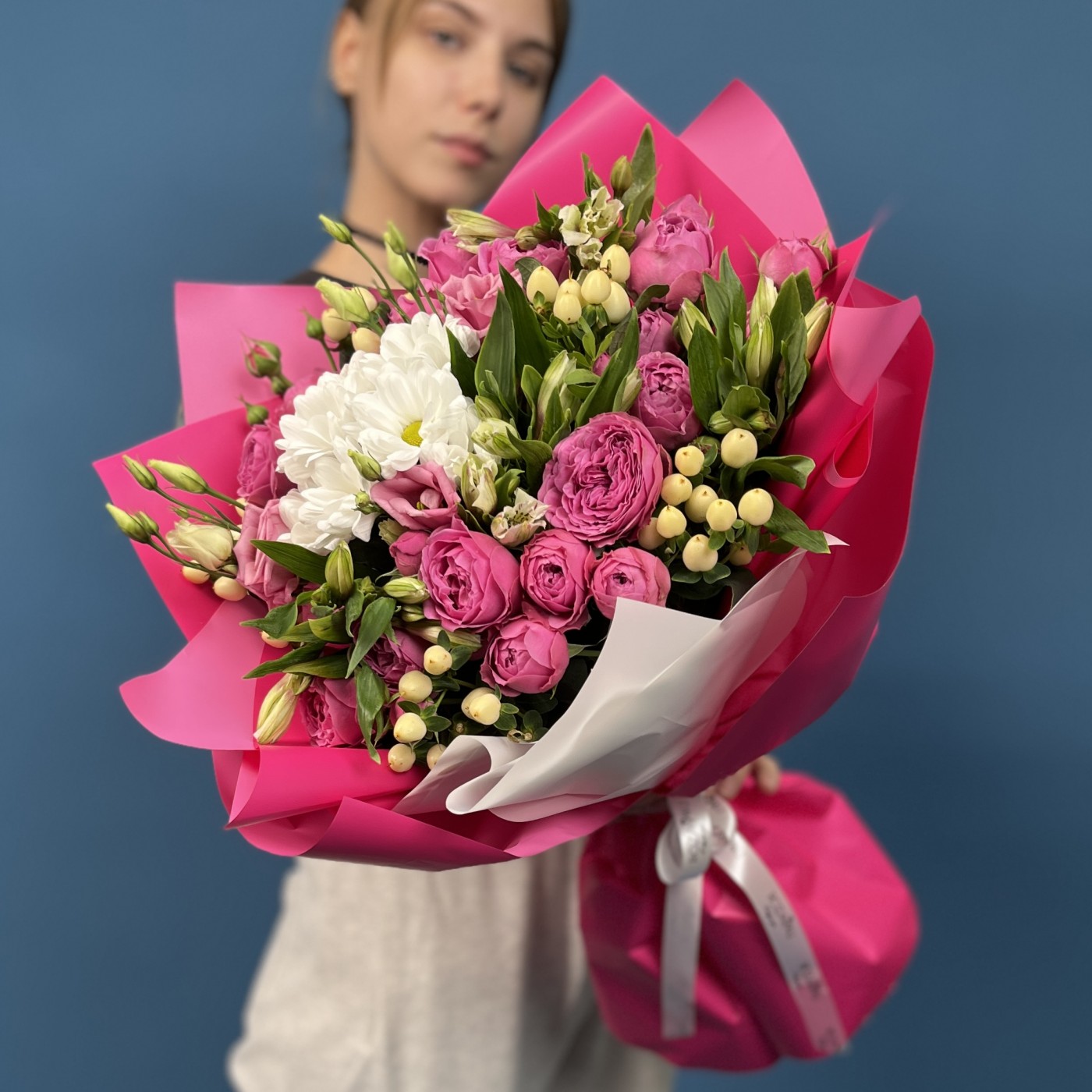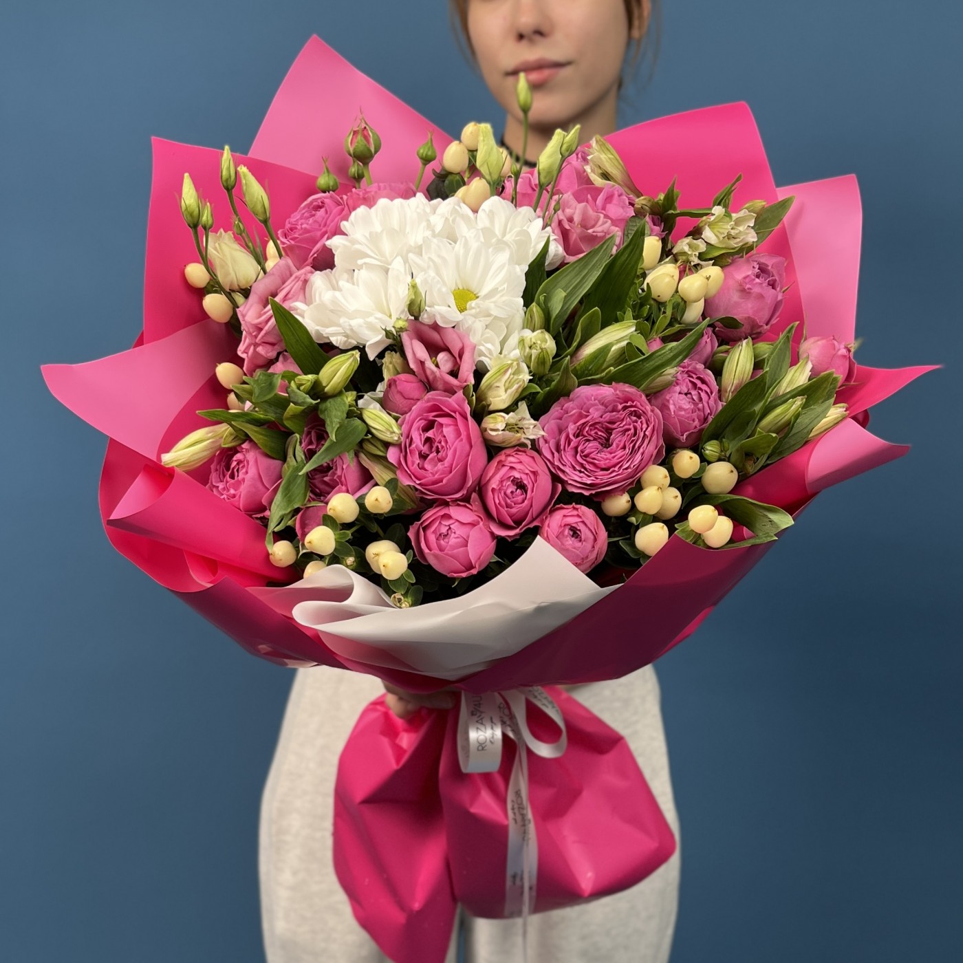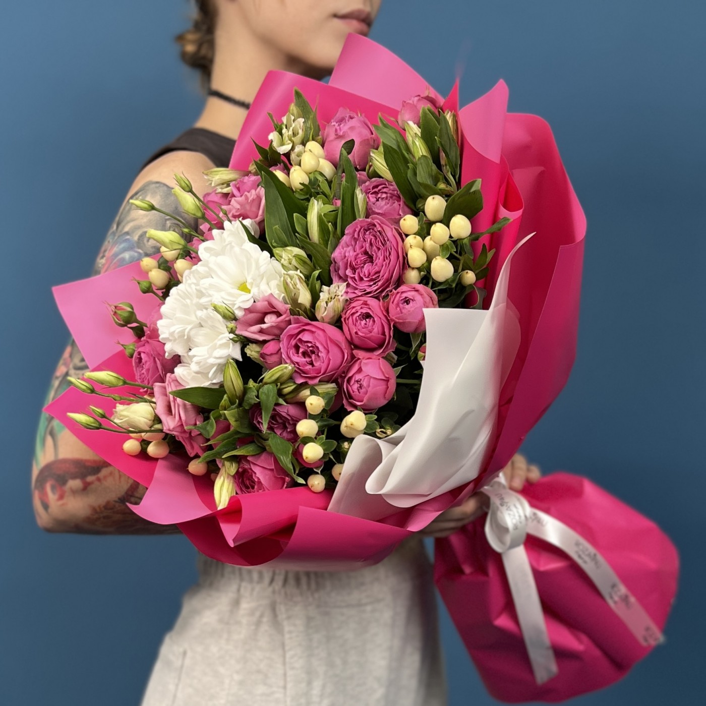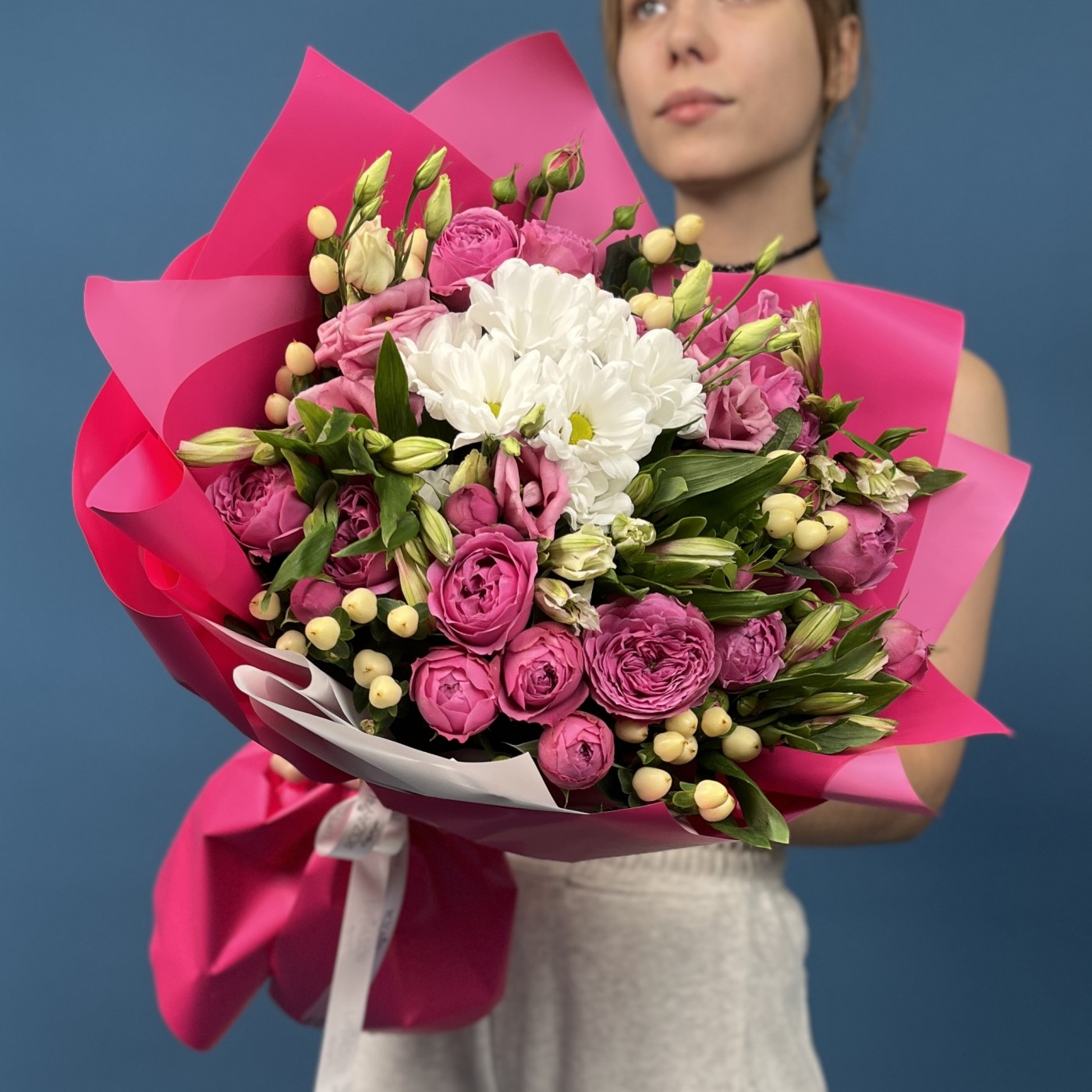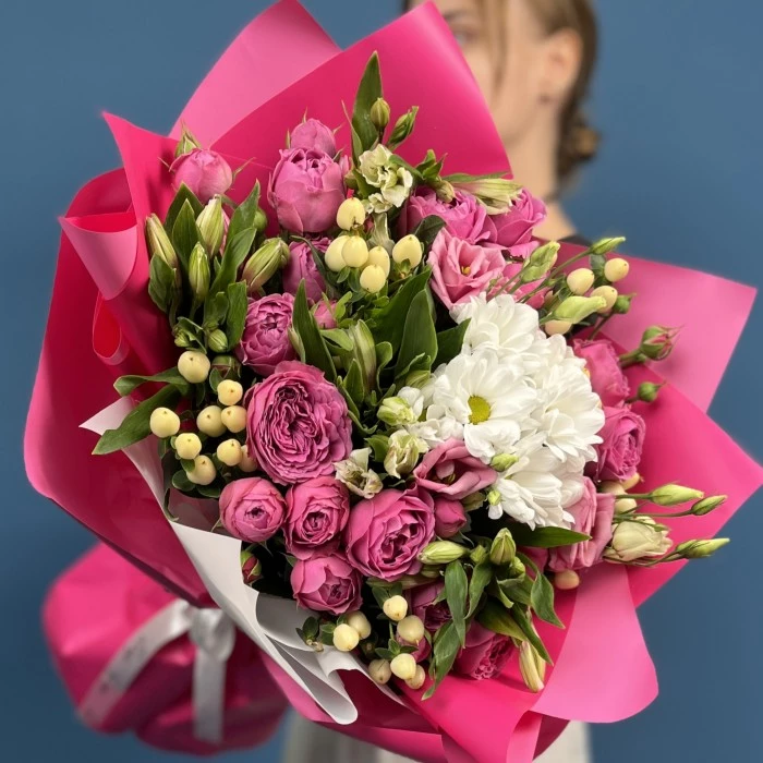 "Подарите взрыв эмоций с букетом "Розовый восторг"! Насыщенные розовые кустовые розы и эустомы, дополненные белоснежными ромашками, создают феерию красок и позитива. Этот букет обязательно поднимет настроение и подарит улыбку!"