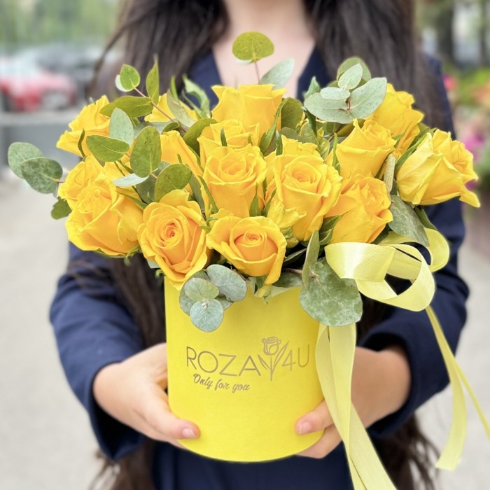 25 ярких желтеньких розочек в миниатюрной шляпной коробке, такая композиция отлично подойдет в качестве подарка подруге, коллеге или школьному учителю.