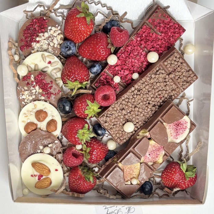 150грБольшой и красивый набор с молочный и белыйм шоколадом ручной работы со свежей клубникой.