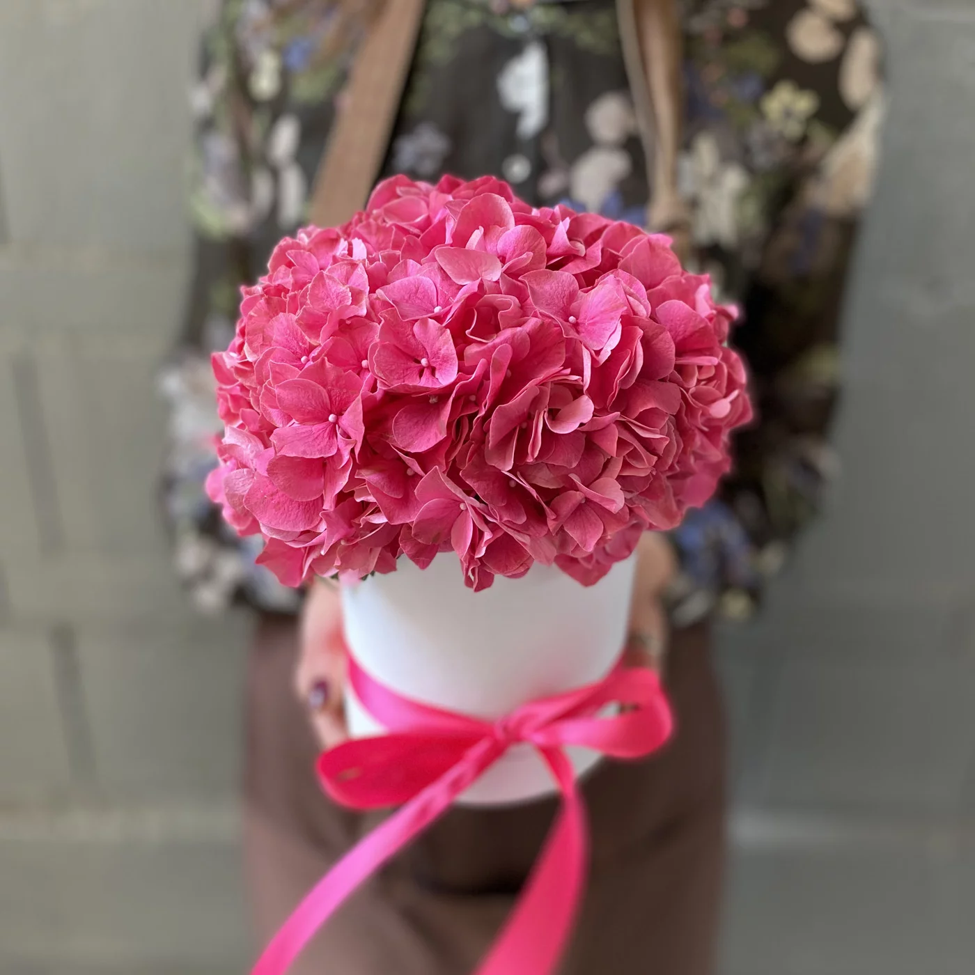 Милейшая композиция из бархатистой гортензии в шляпной коробке приведет в восторг самых маленьких девочек, а также станет прекрасным комплиментом для молодой девушки на день рождения или для молодоженов на свадьбу.