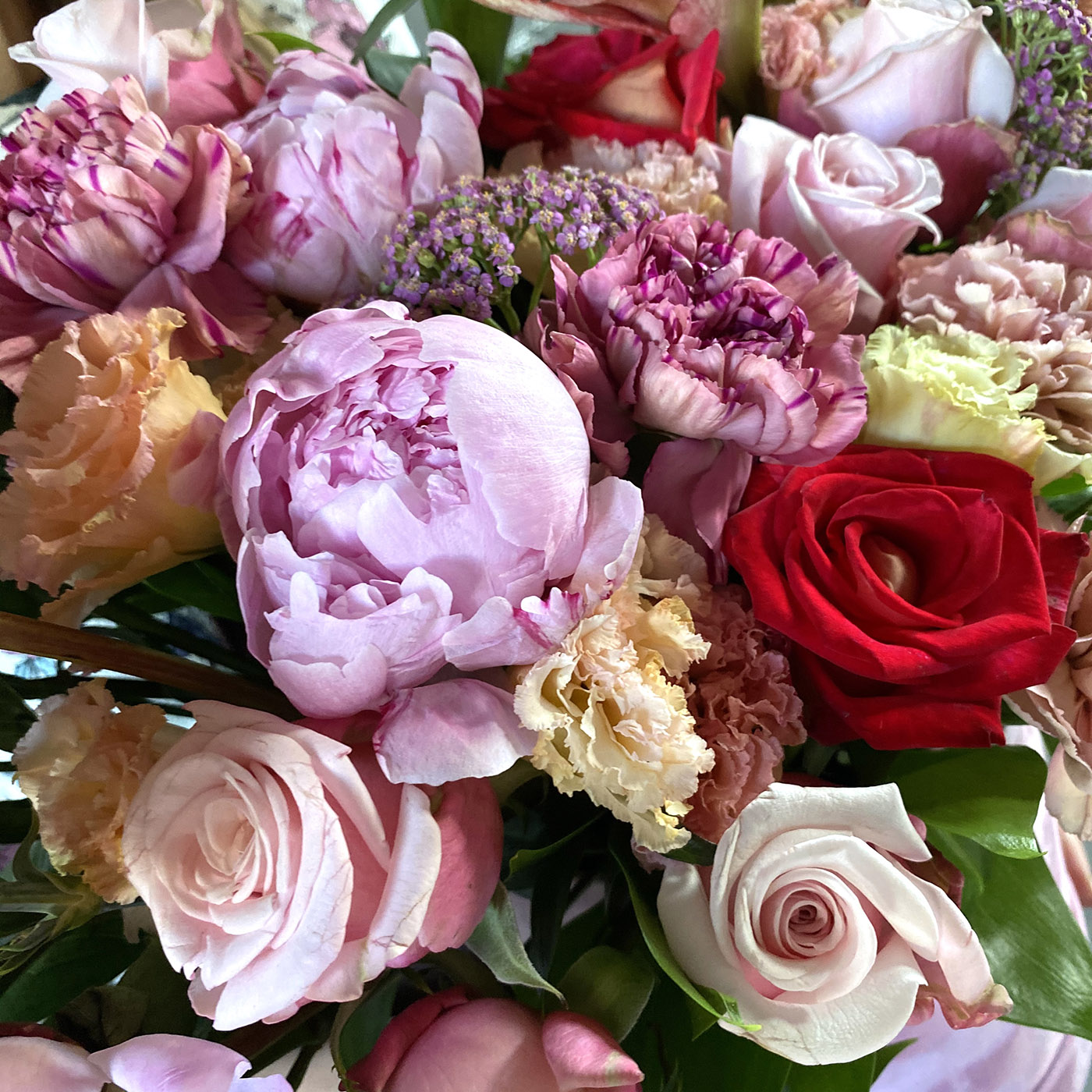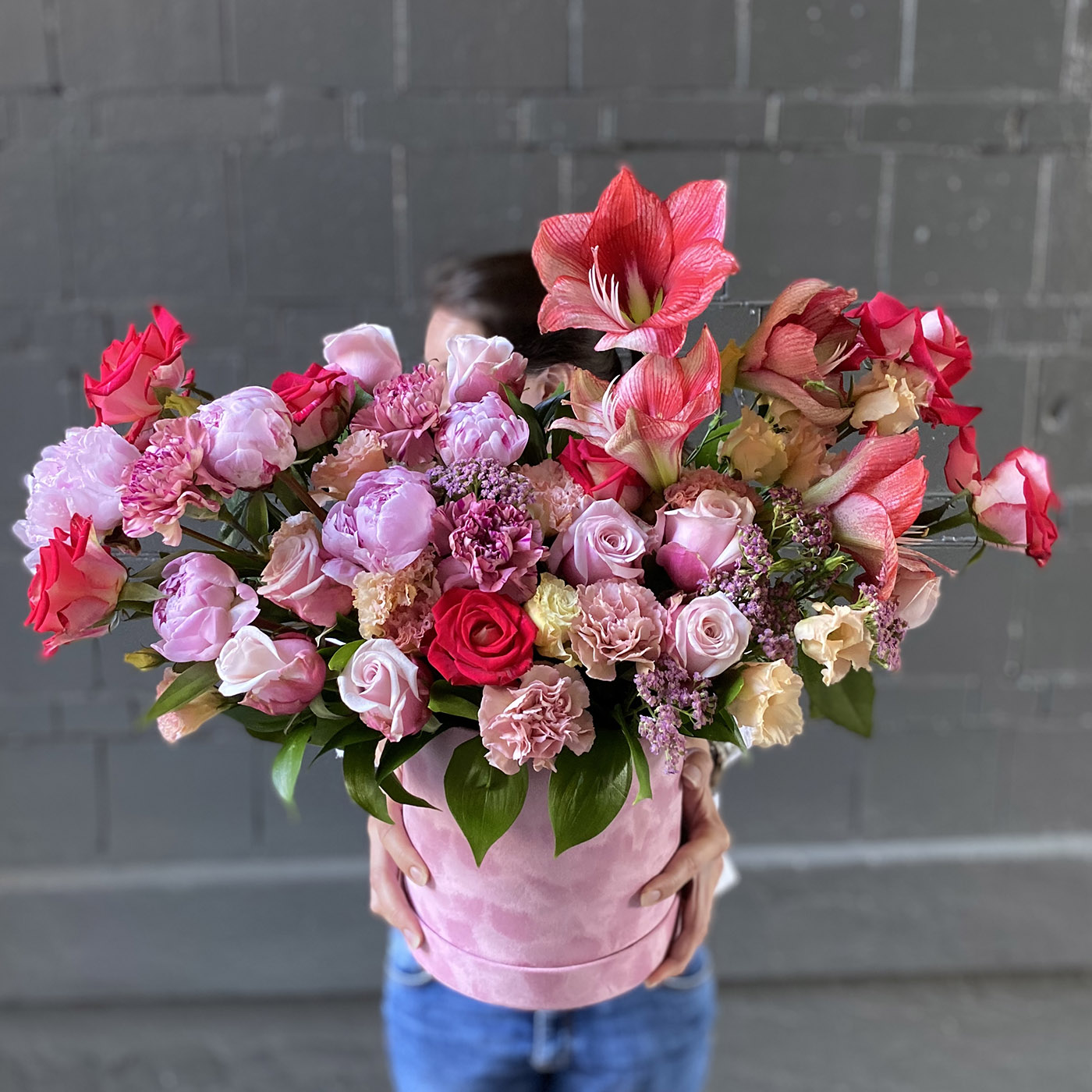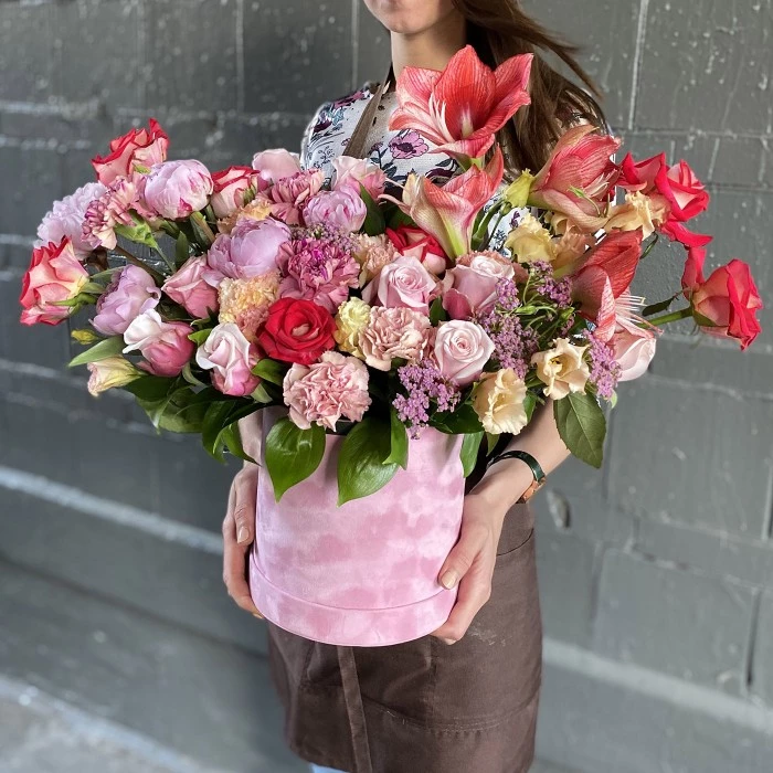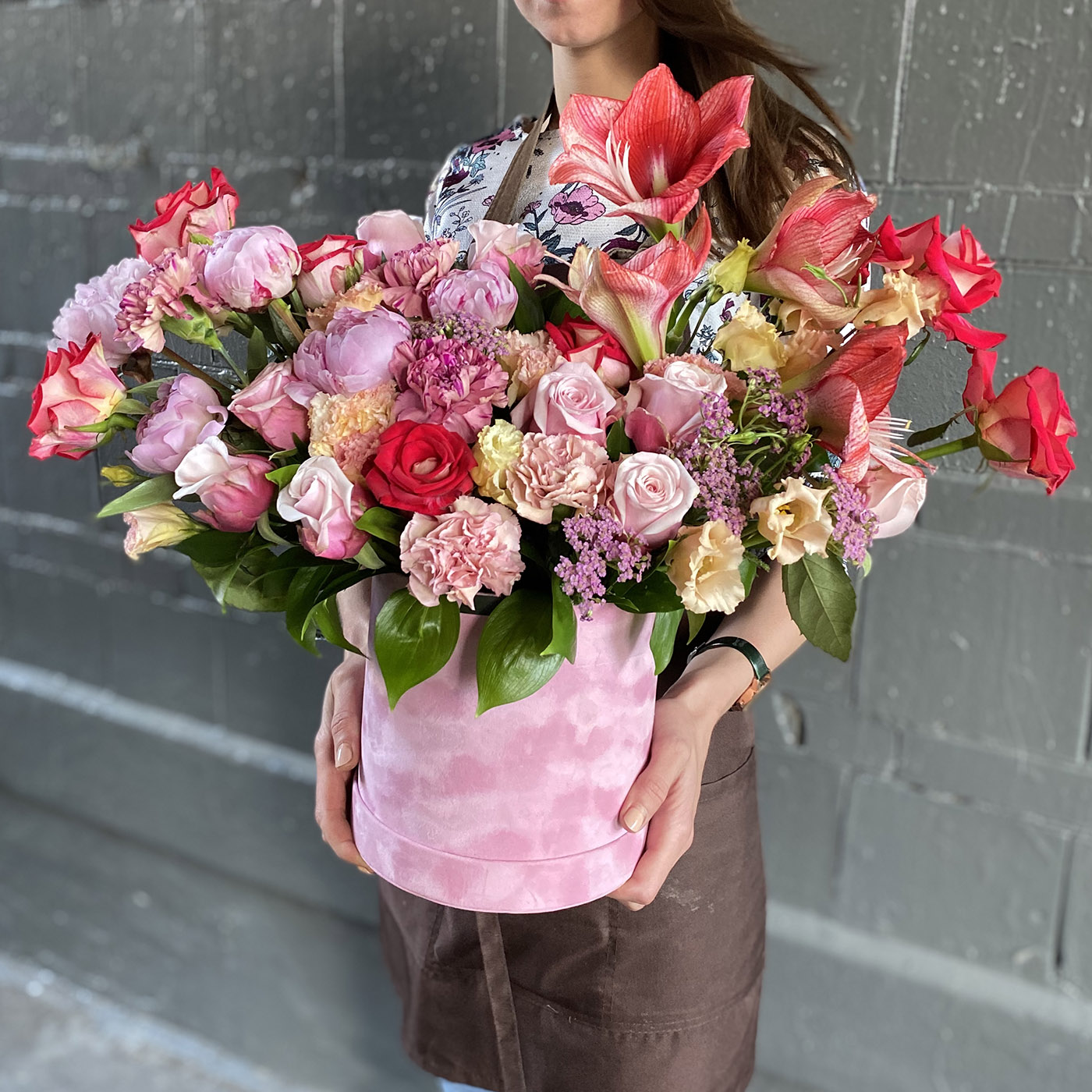 Яркая, насыщенная цветочная композиция в коробке Розовая мечта станет прекрасным способом выразить благодарность и любовь важному для Вас человеку. Сочетание нежных ароматных роз, пионов с воздушной эустомой и гвоздикой удивляет и впечатляет с первого взгляда. Композиция наполнит дом тонким приятным ароматом и создаст изысканную атмосферу. Шляпная коробка с цветами станет незабываемым сюрпризом для любимой, украсит торжественное мероприятие, будет уместна в качестве подарка маме, сестре или подруге.
