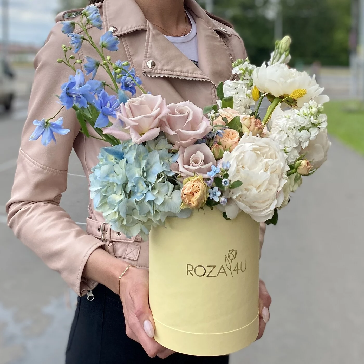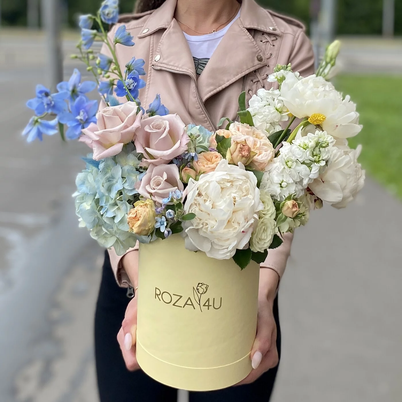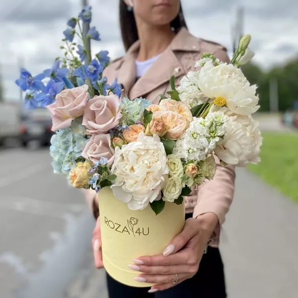 Нежная и ароматная коробка с цветами. Постановка цветка в этой коробке дает ощущения цветочного взрыва. Такую коробку можно преподнести в качестве подарка на любой праздник. В состав коробки входят ароматные пионы и маттиола. Интересную форму и цвет придает яркий синий дельфиниум и нежно-голубая гортензия.