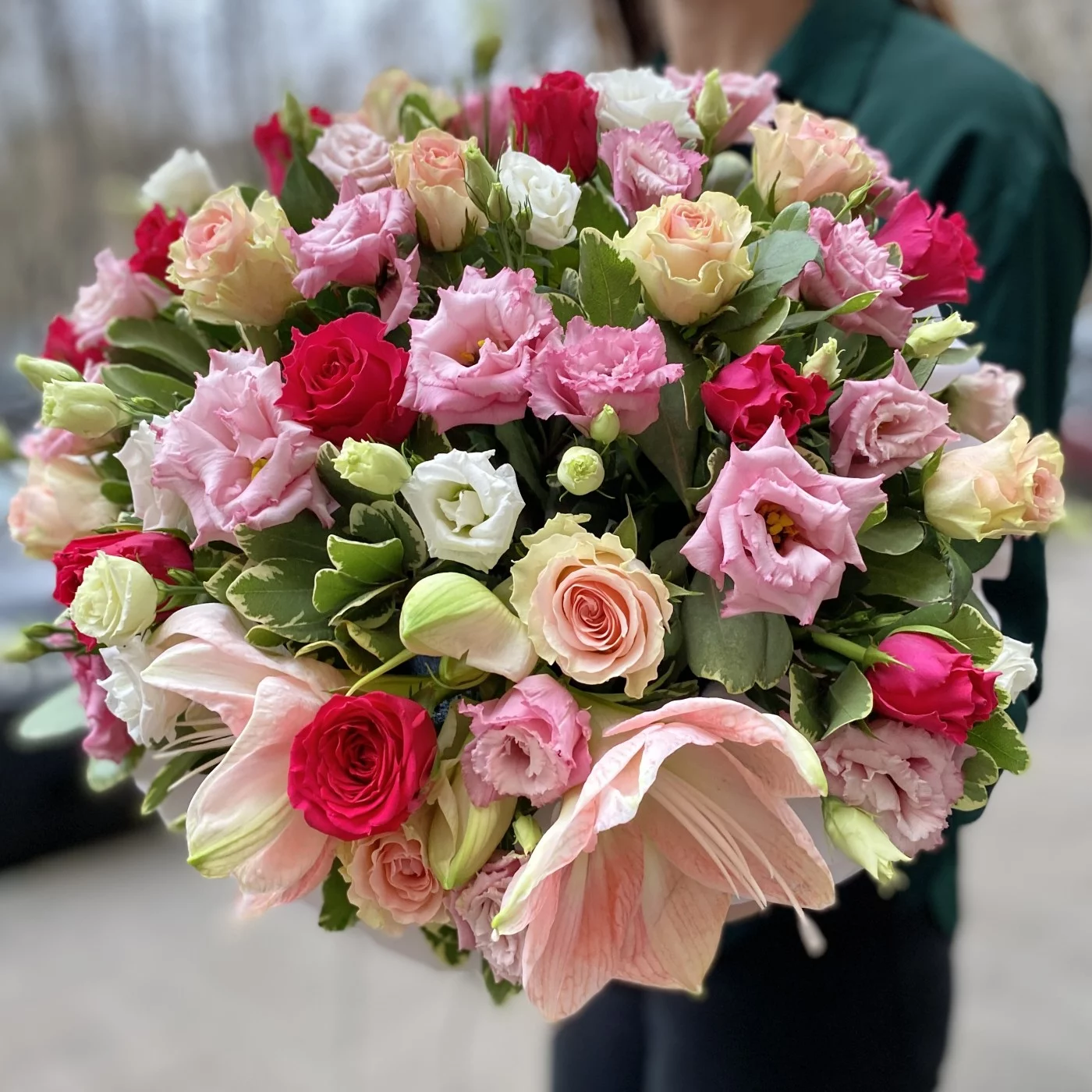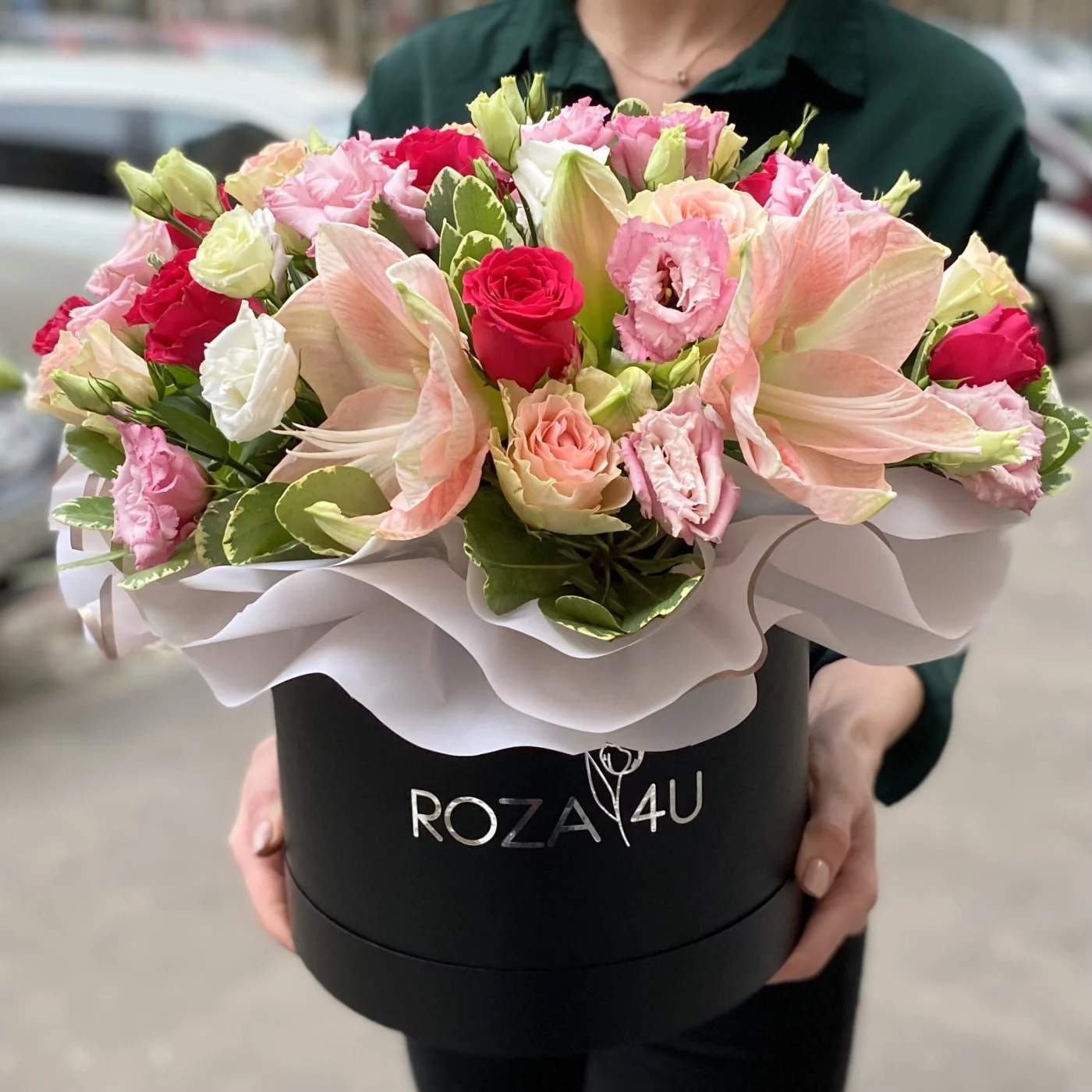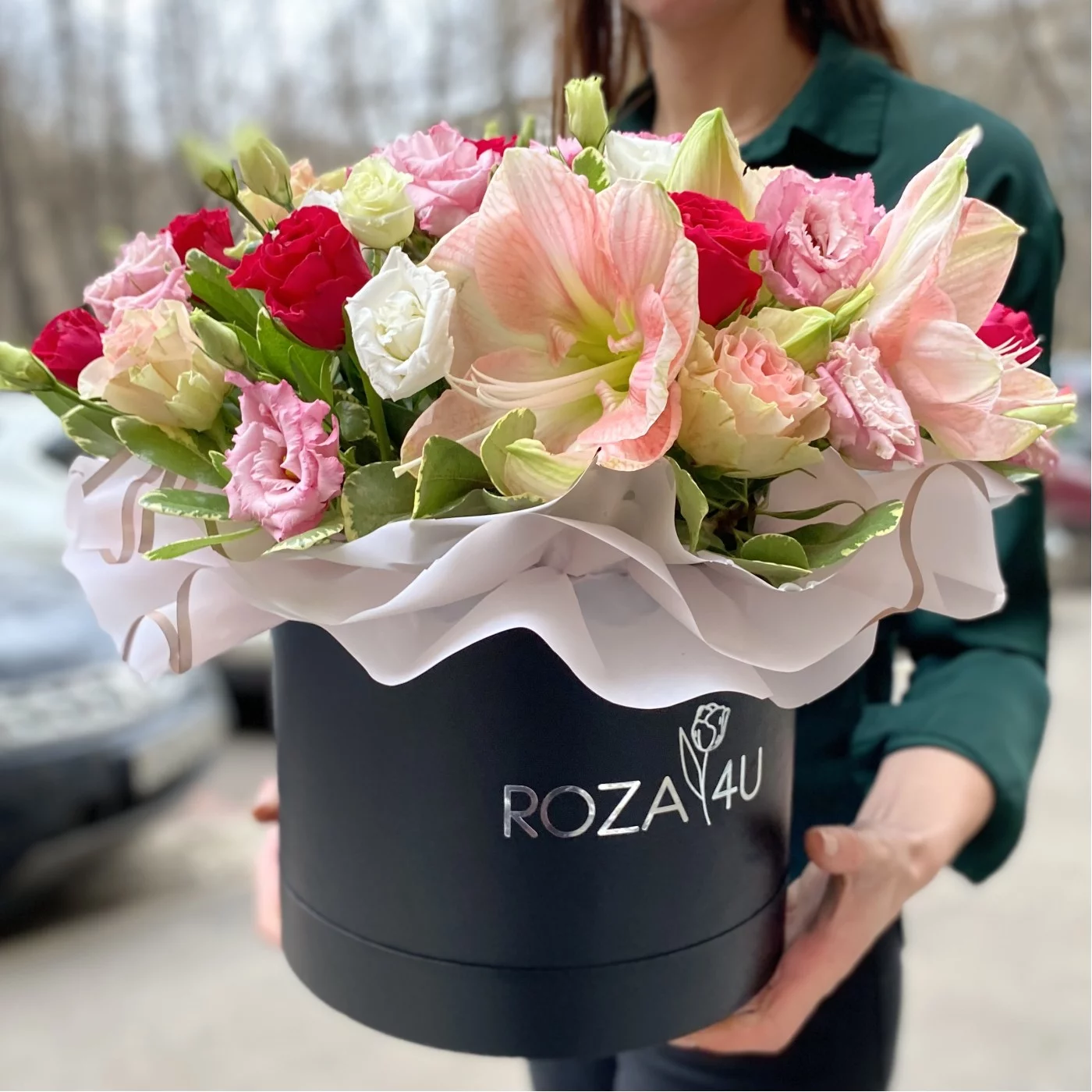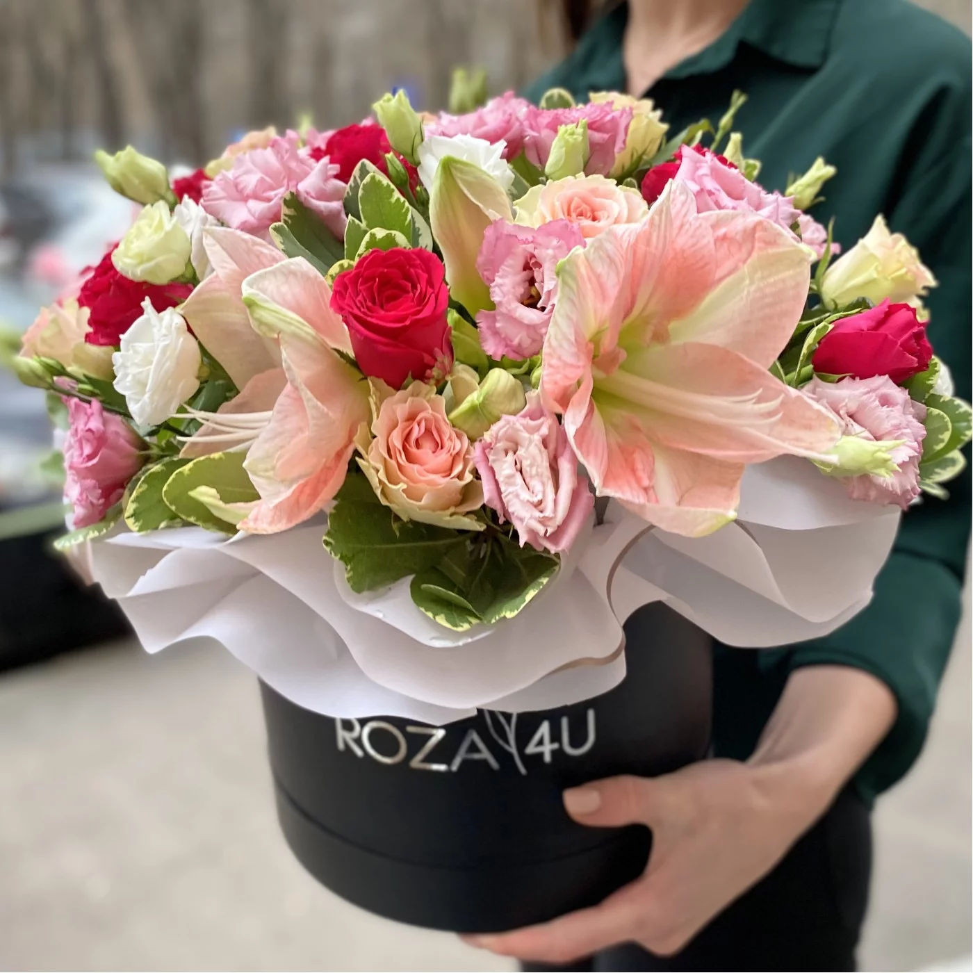 Большая и нежная коробка с цветами. В состав коробки входят эустомы и розы. Главным элементом является большой цветок амарилиса. Шикарный подарок на юбилей, свадьбу или день рождения!