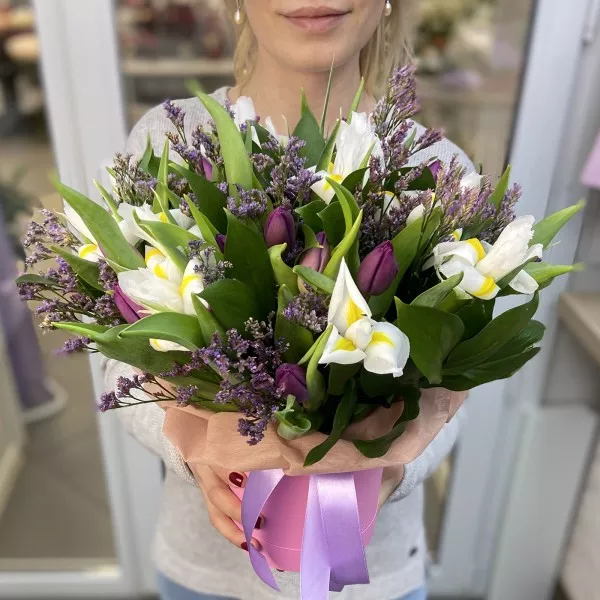 Тюльпаны и белые ирисы в шляпной коробке