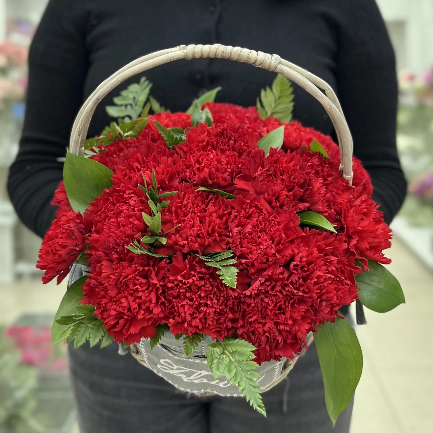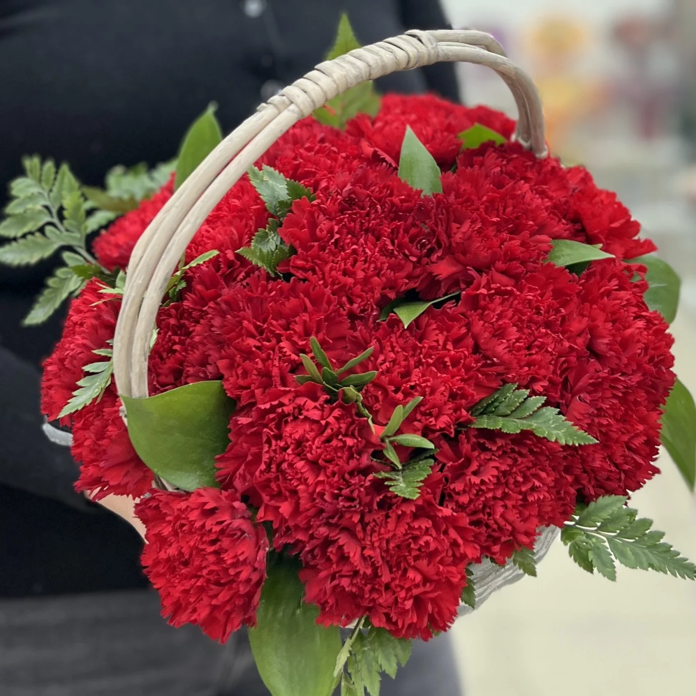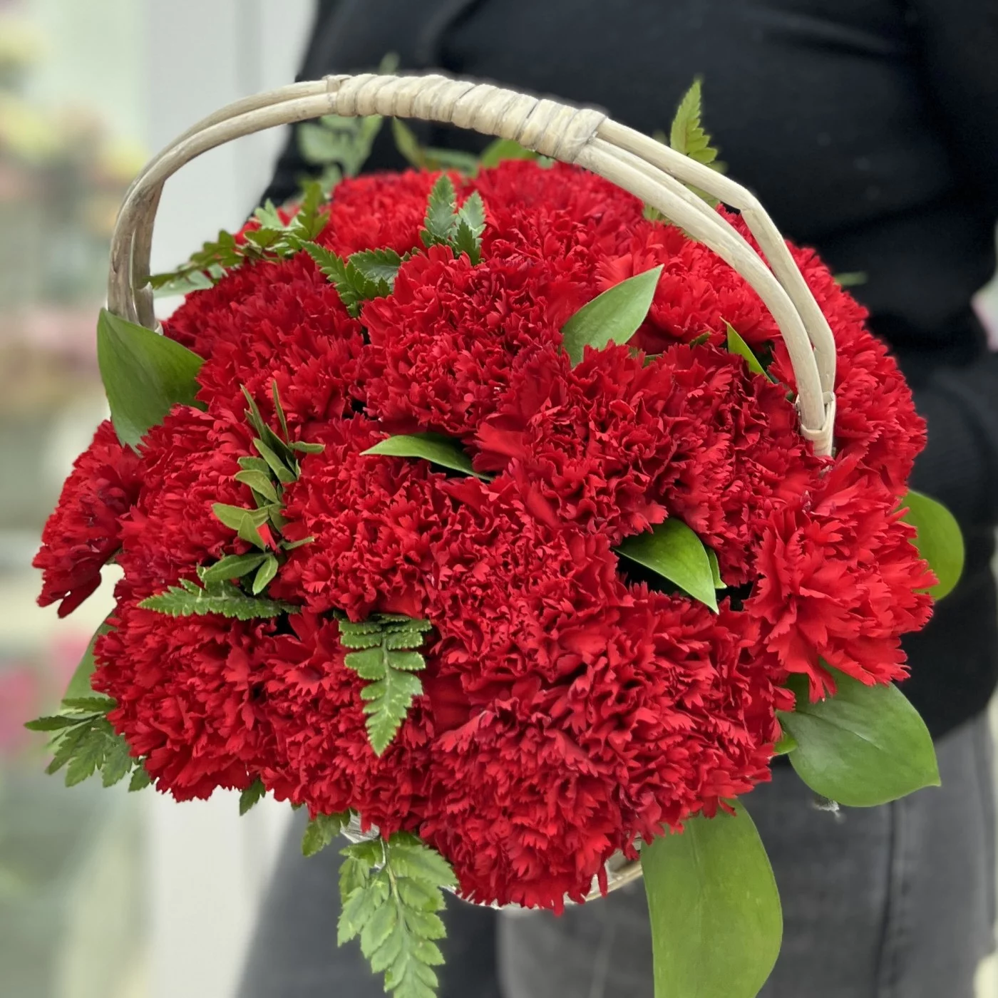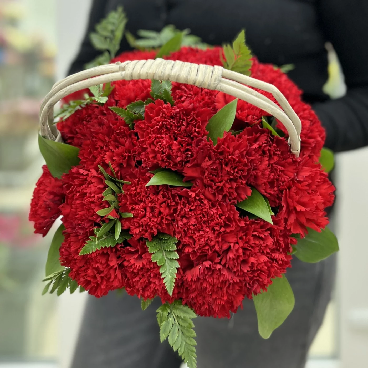Состав: корзина, оазис, гвоздика красная - 2 5 шт, рускус, папоротник.