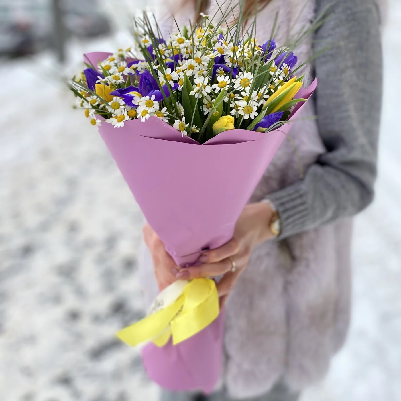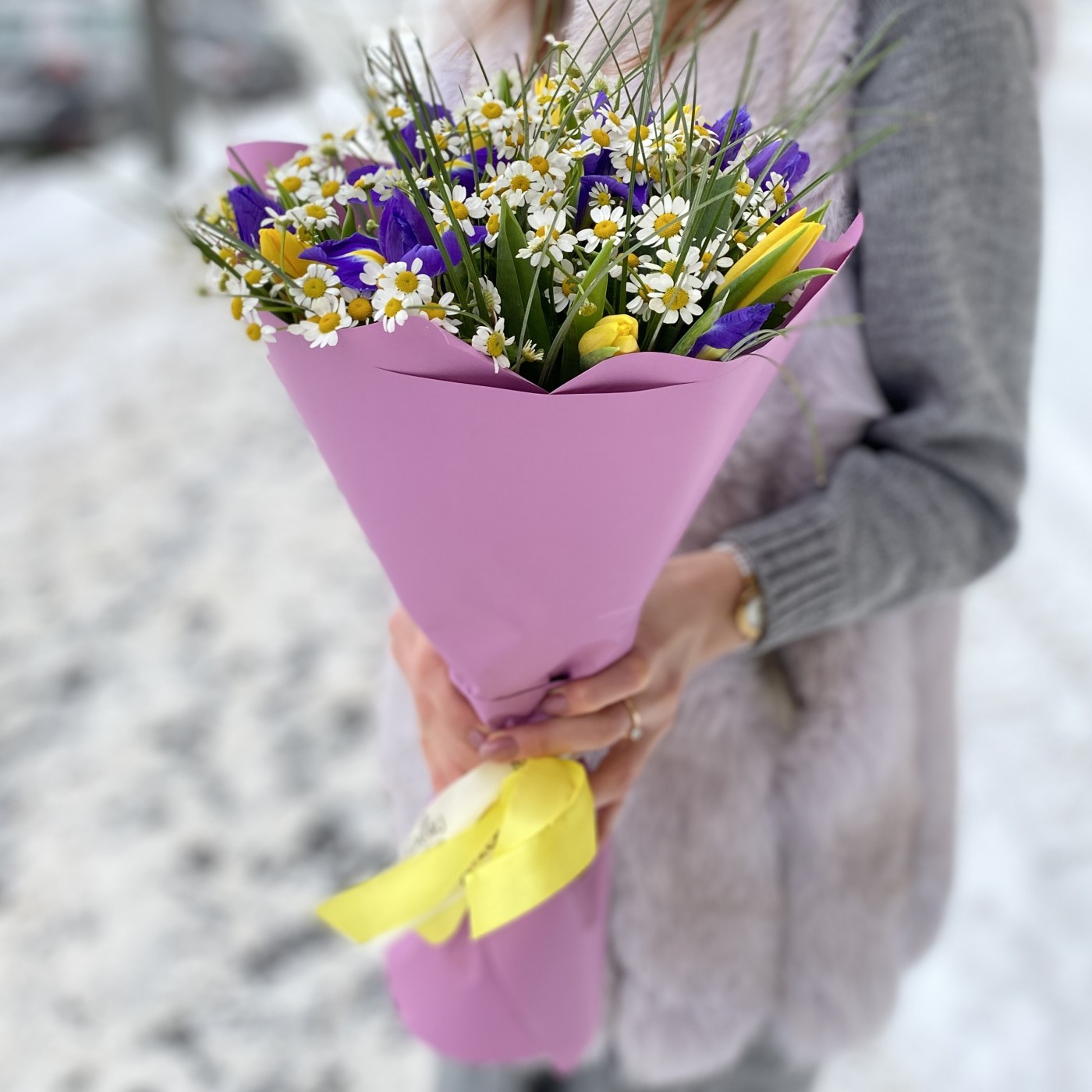 Праздничный недорогой букет на 8 Марта из ярких фиолетовых ирисов и солнечно-желтых тюльпанов станет великолепным подарком и самым приятным комплиментом как для возлюбленной, так и для членов Вашей семьи или друзей. Он напомнит о тёплых весенних днях, первых лучах солнца и великолепии окружающей природы, поднимет настроение и вызовет на лице улыбку даже в самую пасмурную погоду!