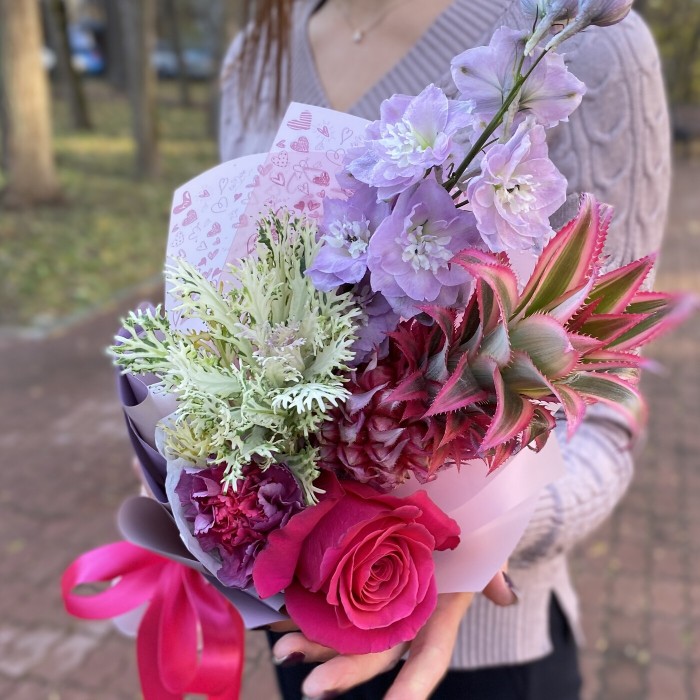 Небольшой детский букет в сиренево розовых тонах. Такой букет подойдет девочке на день рождения, в подарок учителю или любимой маме. В состав букета входит декоративный ананас который придает особую индивидуальность.