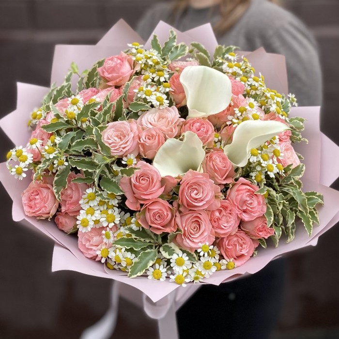 Букет Ассоль с каллами и кустовыми розами