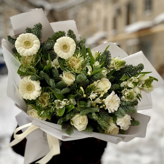 Рождественский букет с натуральным нобилисом, белыми герберами и розами.
