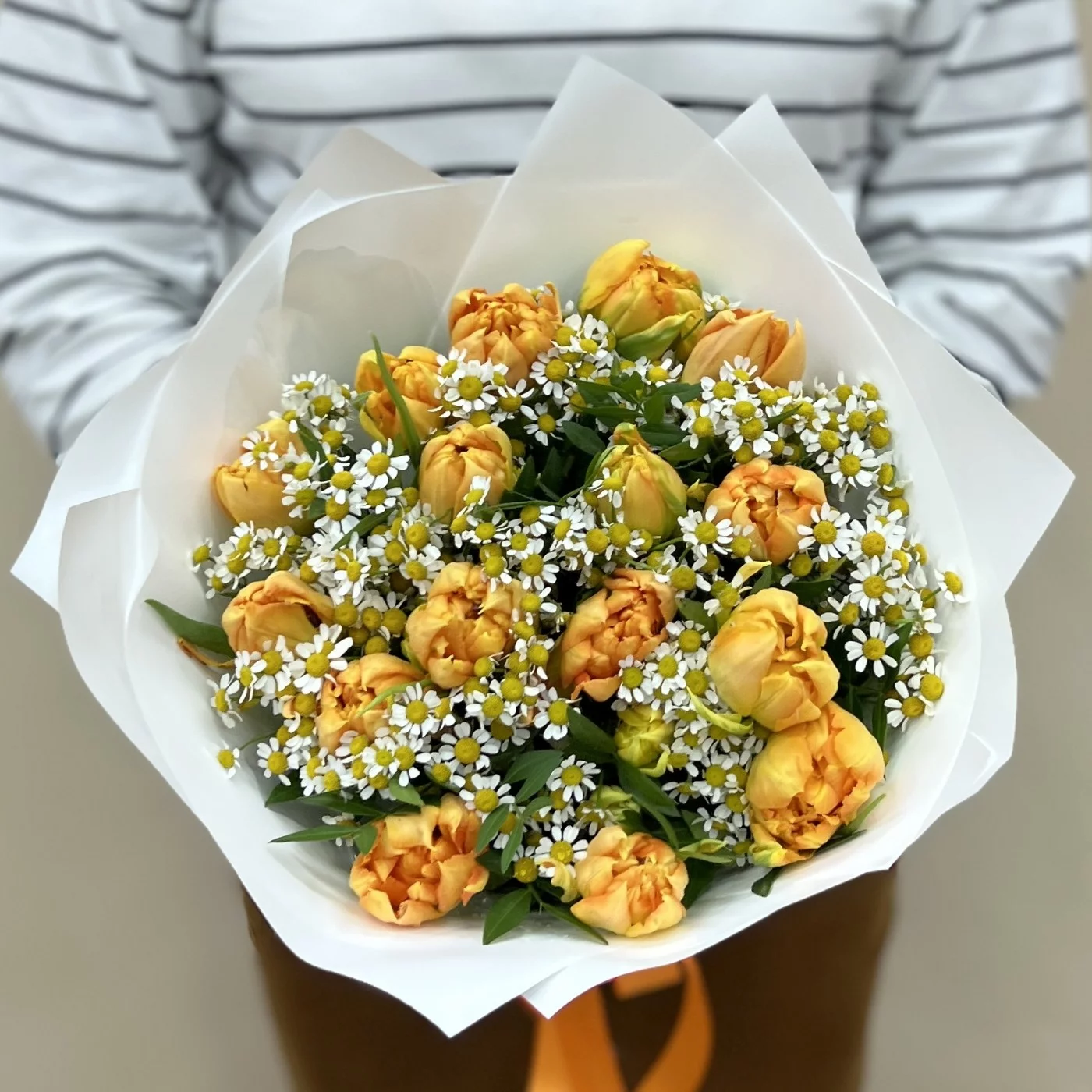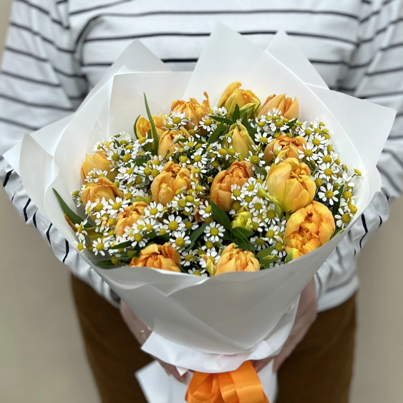 Состав: тюльпан пионовидный- 15 шт, танацетум- 6 шт, упаковка,каркас.