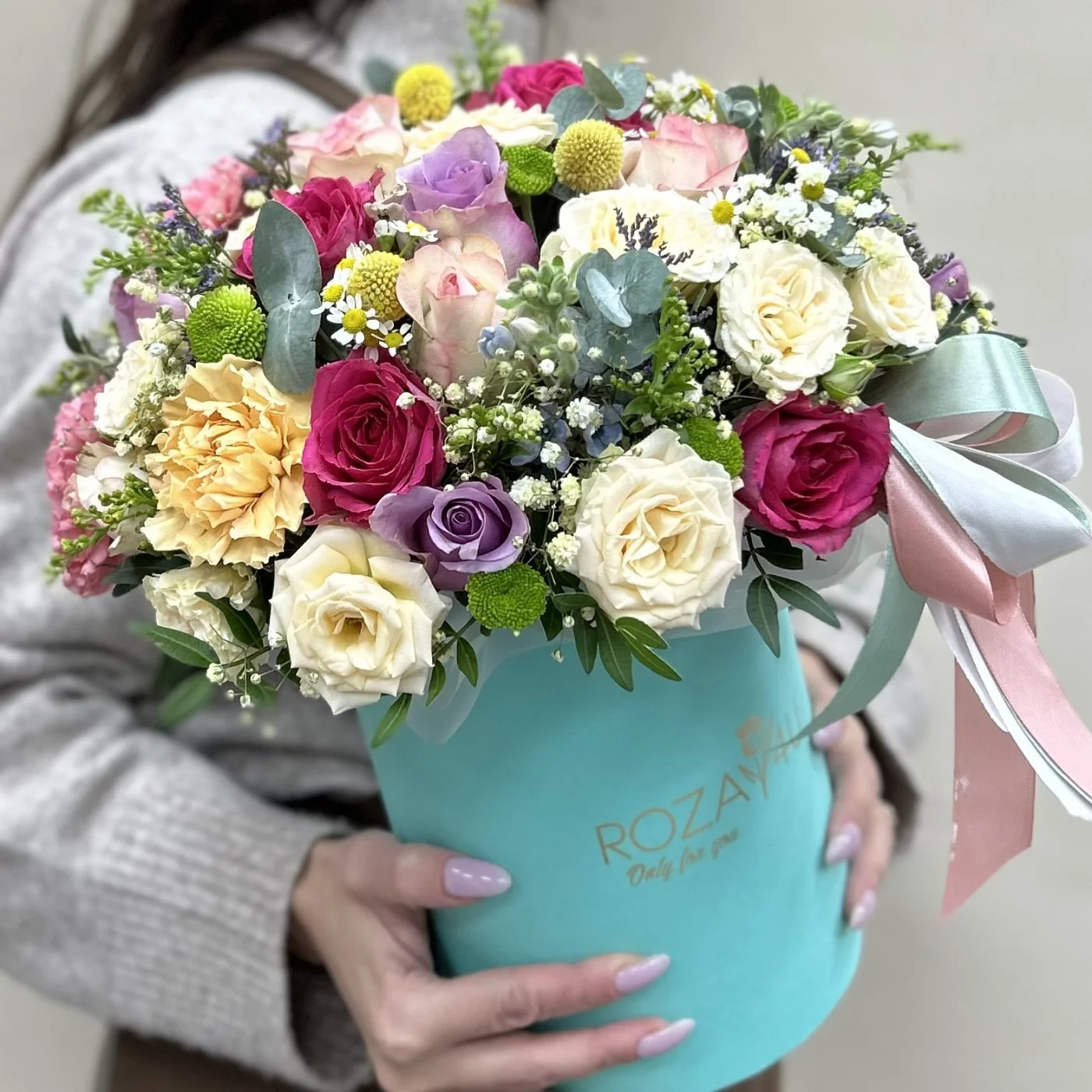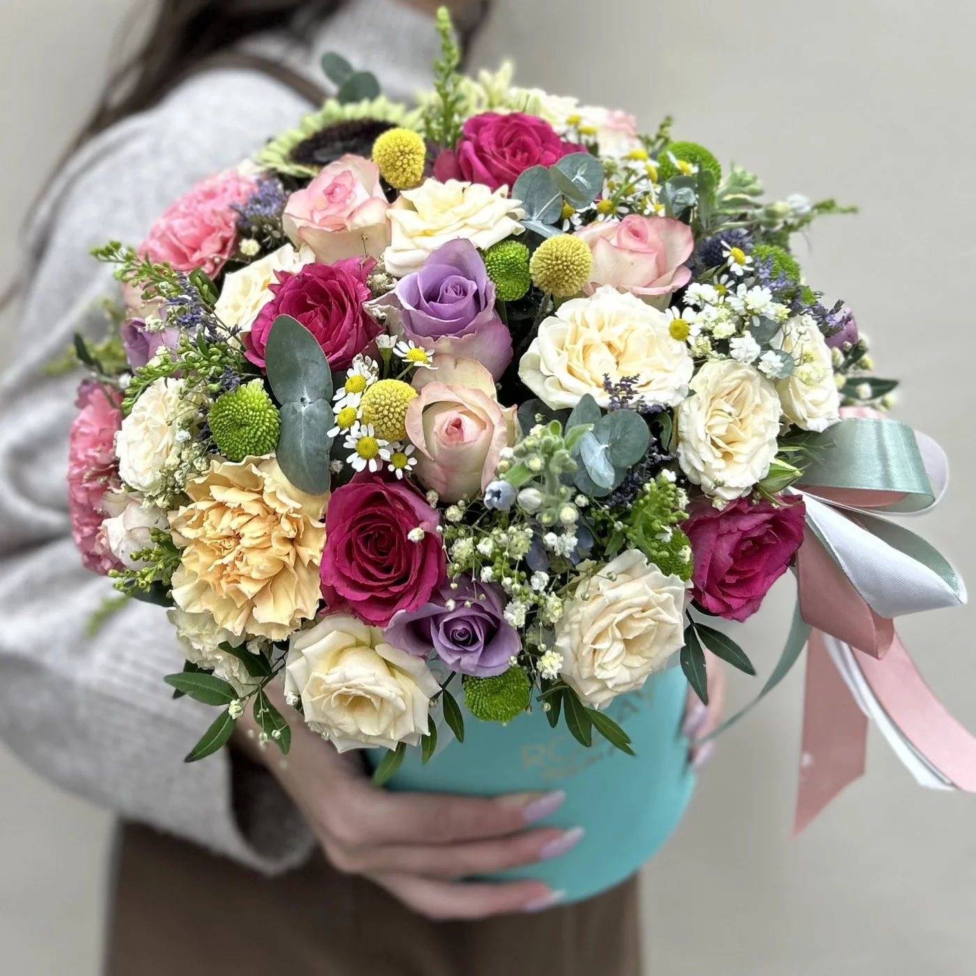 Состав : Коробк, оазис , роза 30 шт , гипсофила 1 шт , оксипеталум 2 шт , подсолнух 1 шт , роза куст 5 шт , краспедия 3 шт , гвоздика 6 шт , агапантус 1 шт , танацетум 1 шт , писташ , лента .