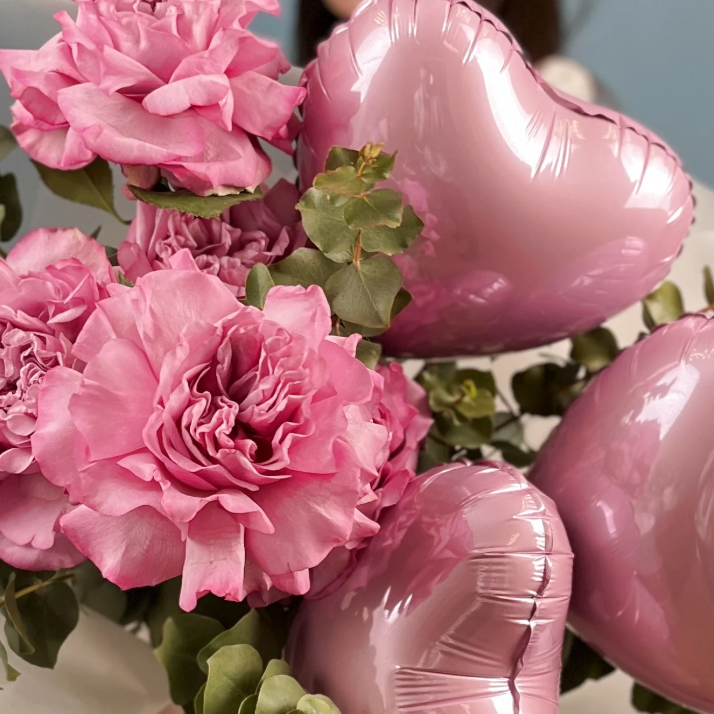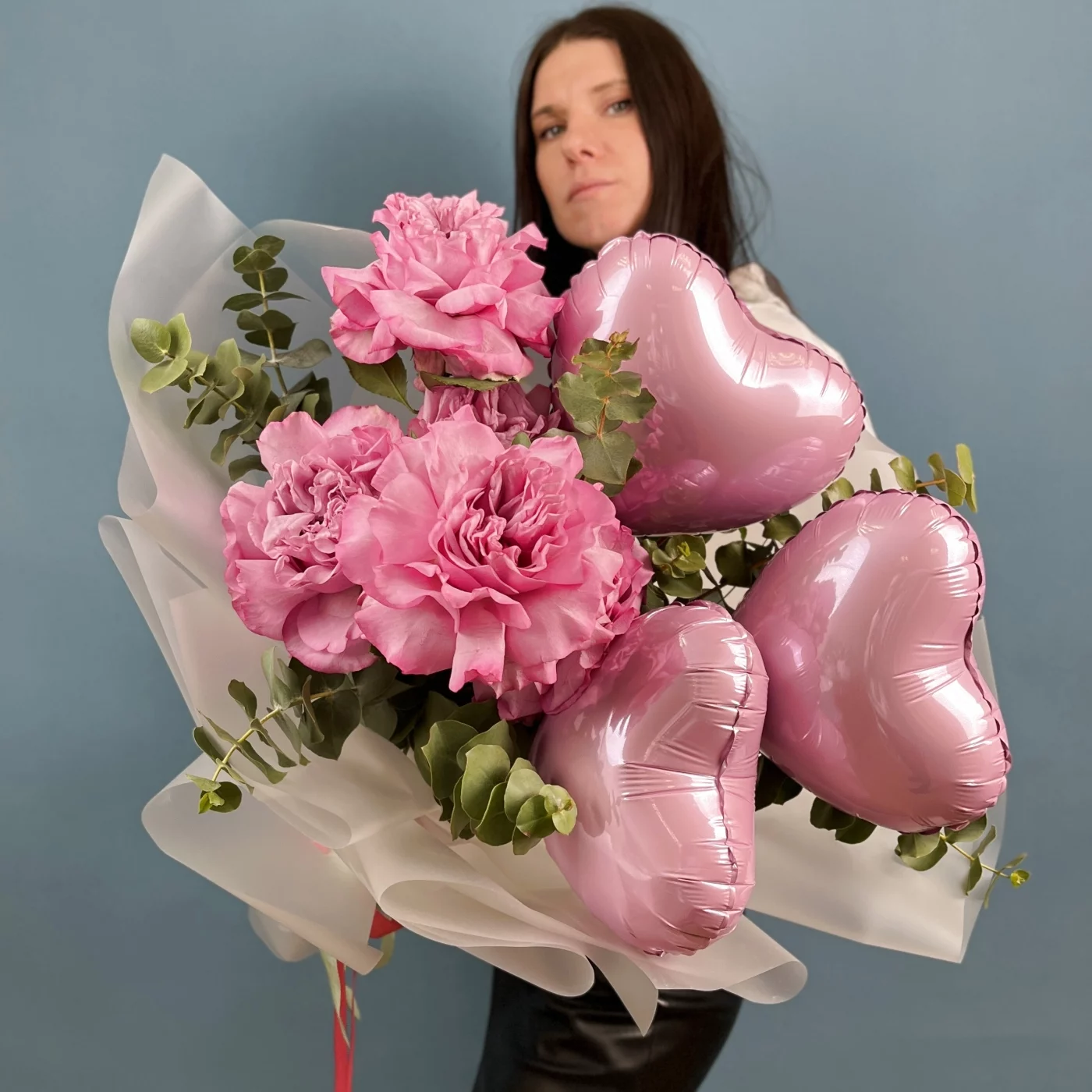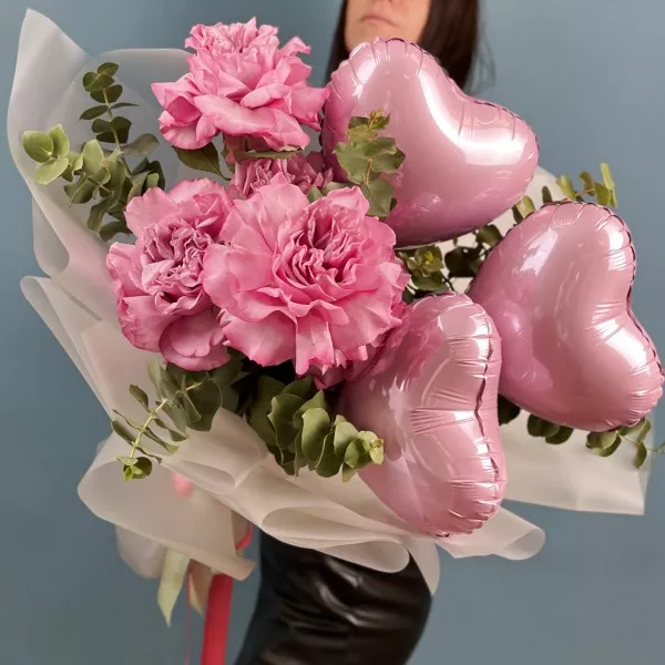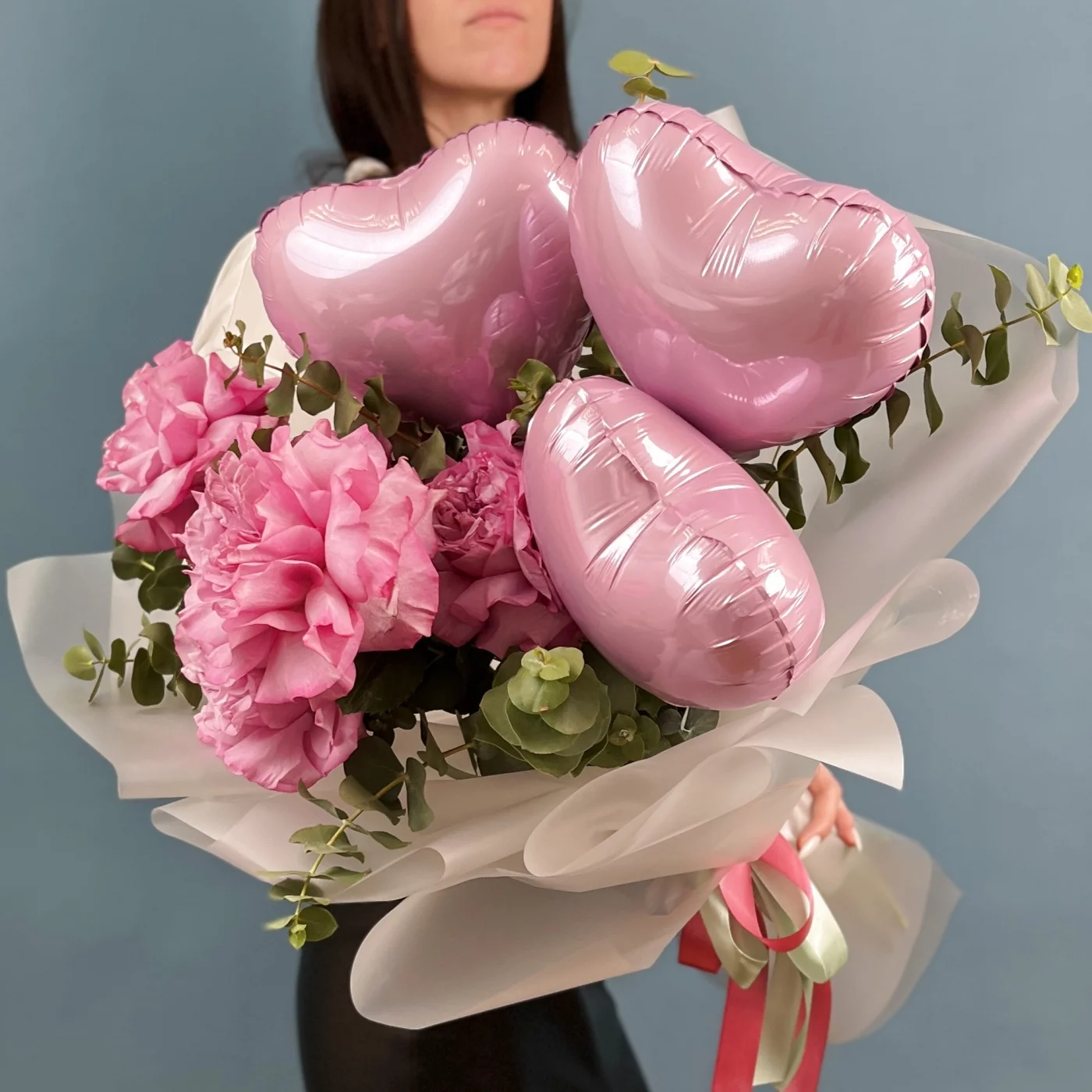 Букет для любимой с пионовидными розами и розовыми сердцами — это романтичный и трогательный подарок, который идеально подходит для выражения ваших чувств.