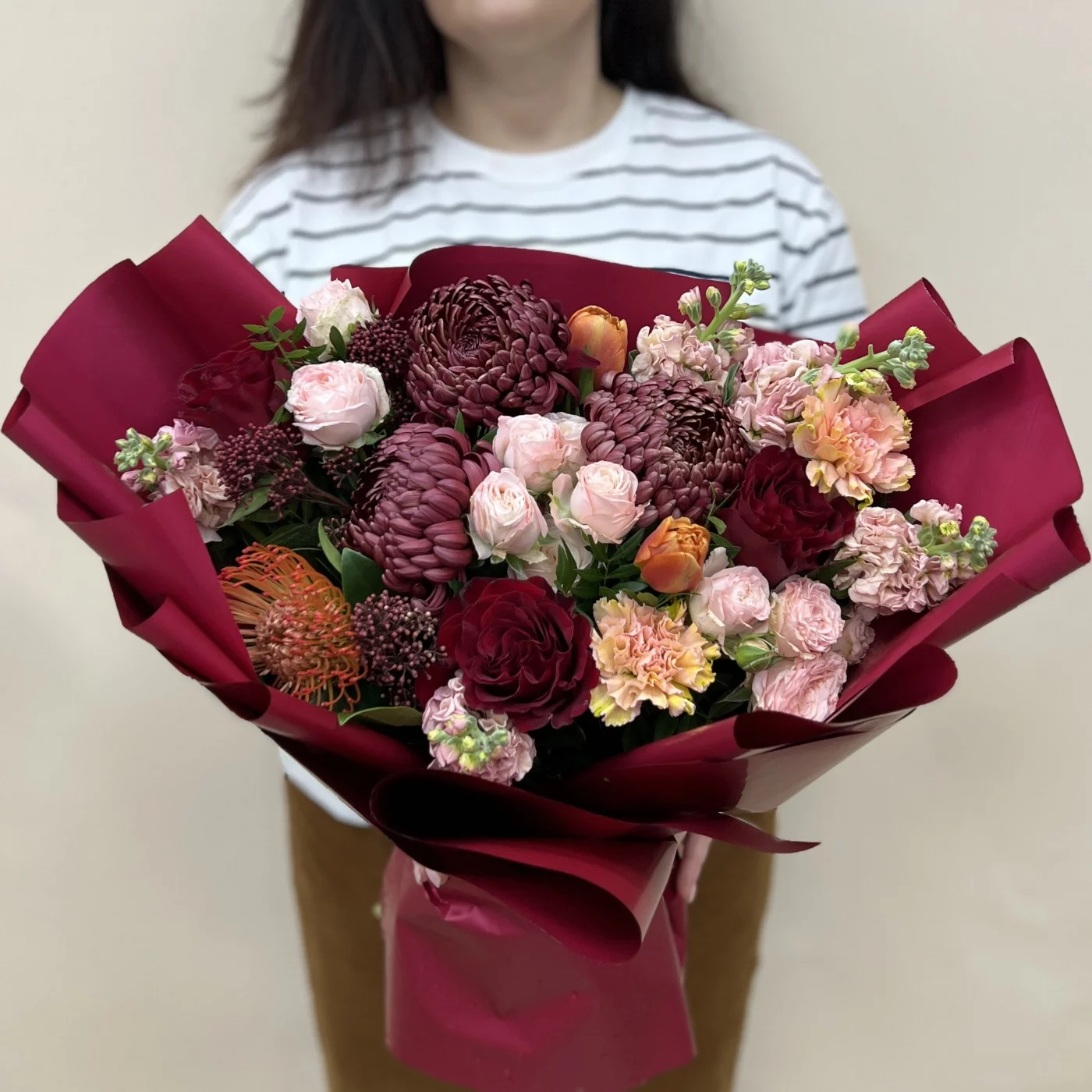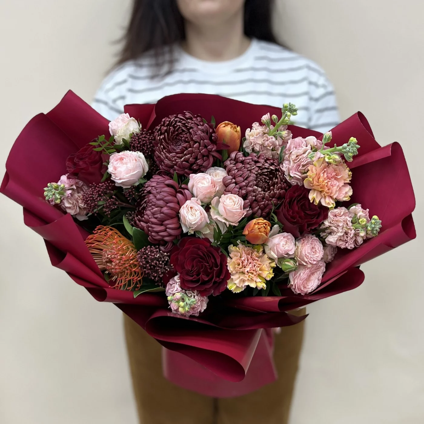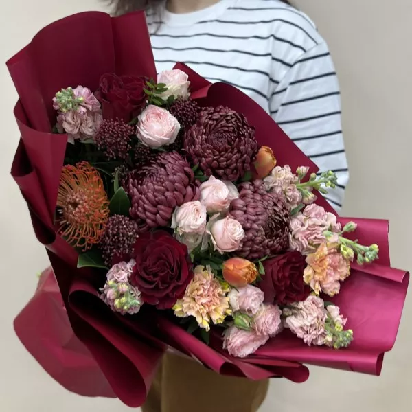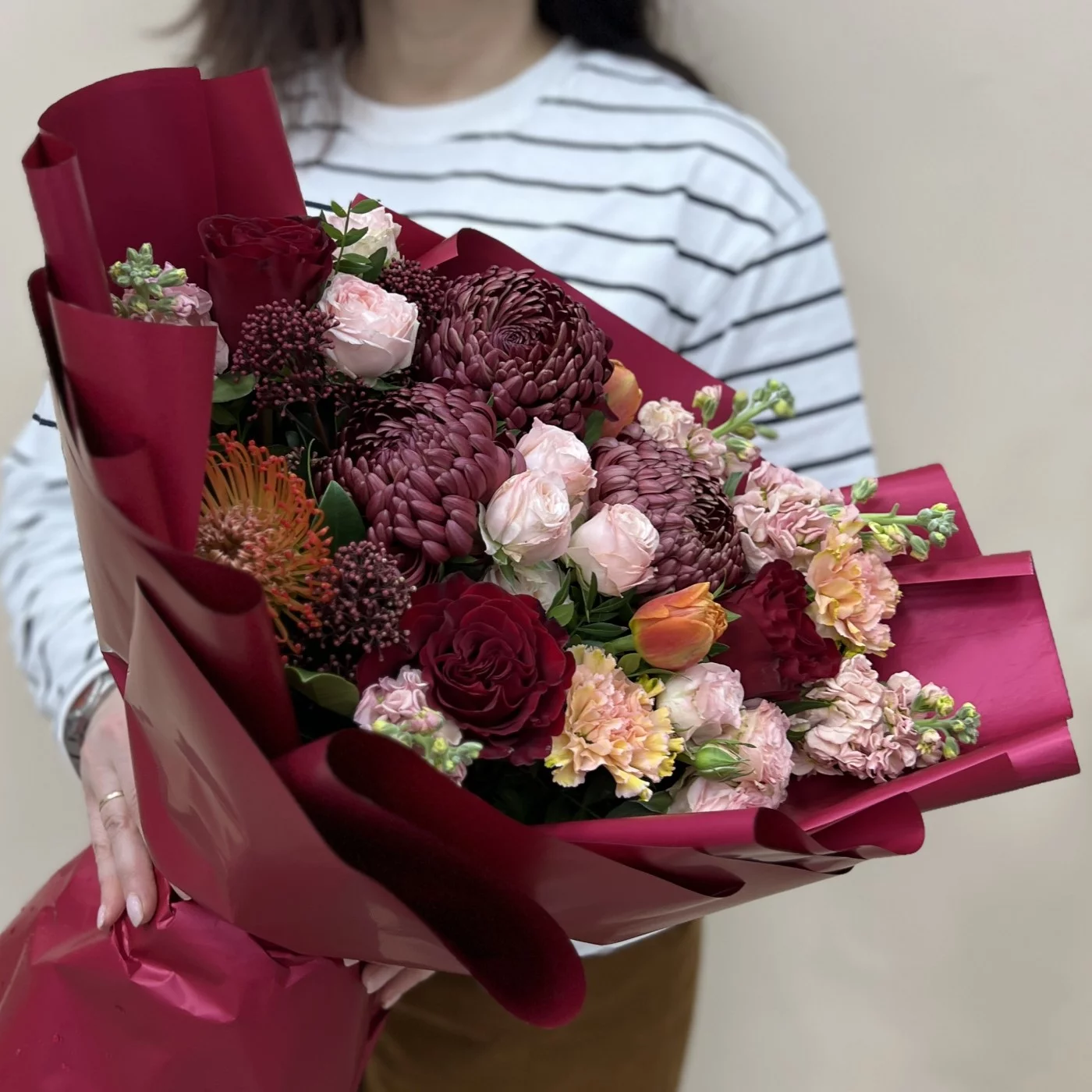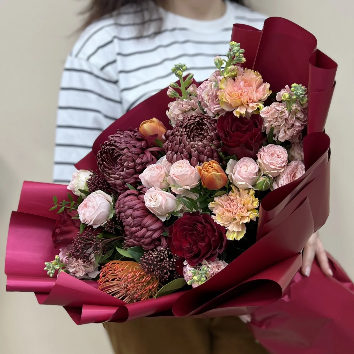 Состав: Хризантема- 3 шт, скимия- 2 шт,маттиола-5 шт,роза-3 шт,роза кустовая- 3 шт,гвоздика-3 шт,леукоспермум-,писташ,упаковка.