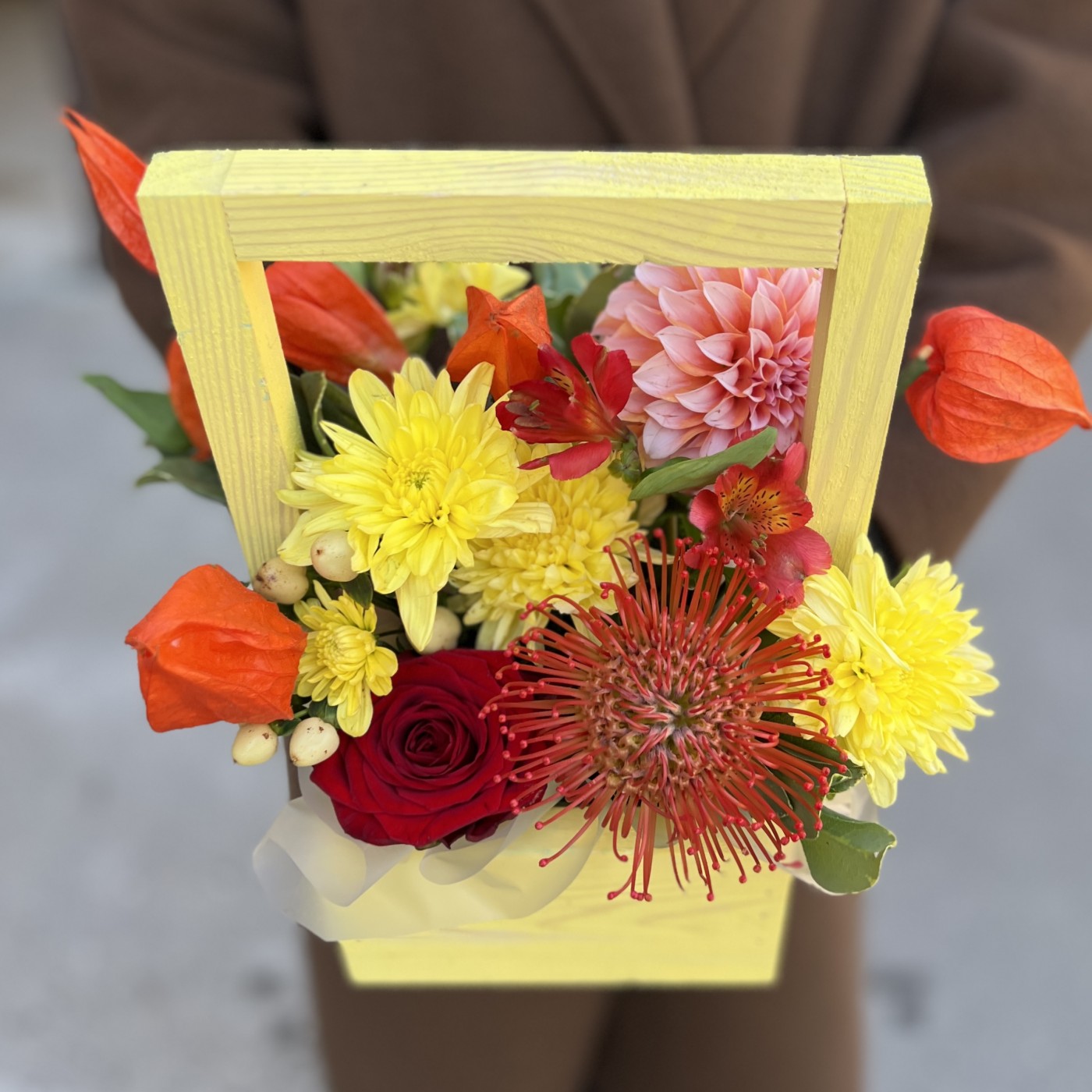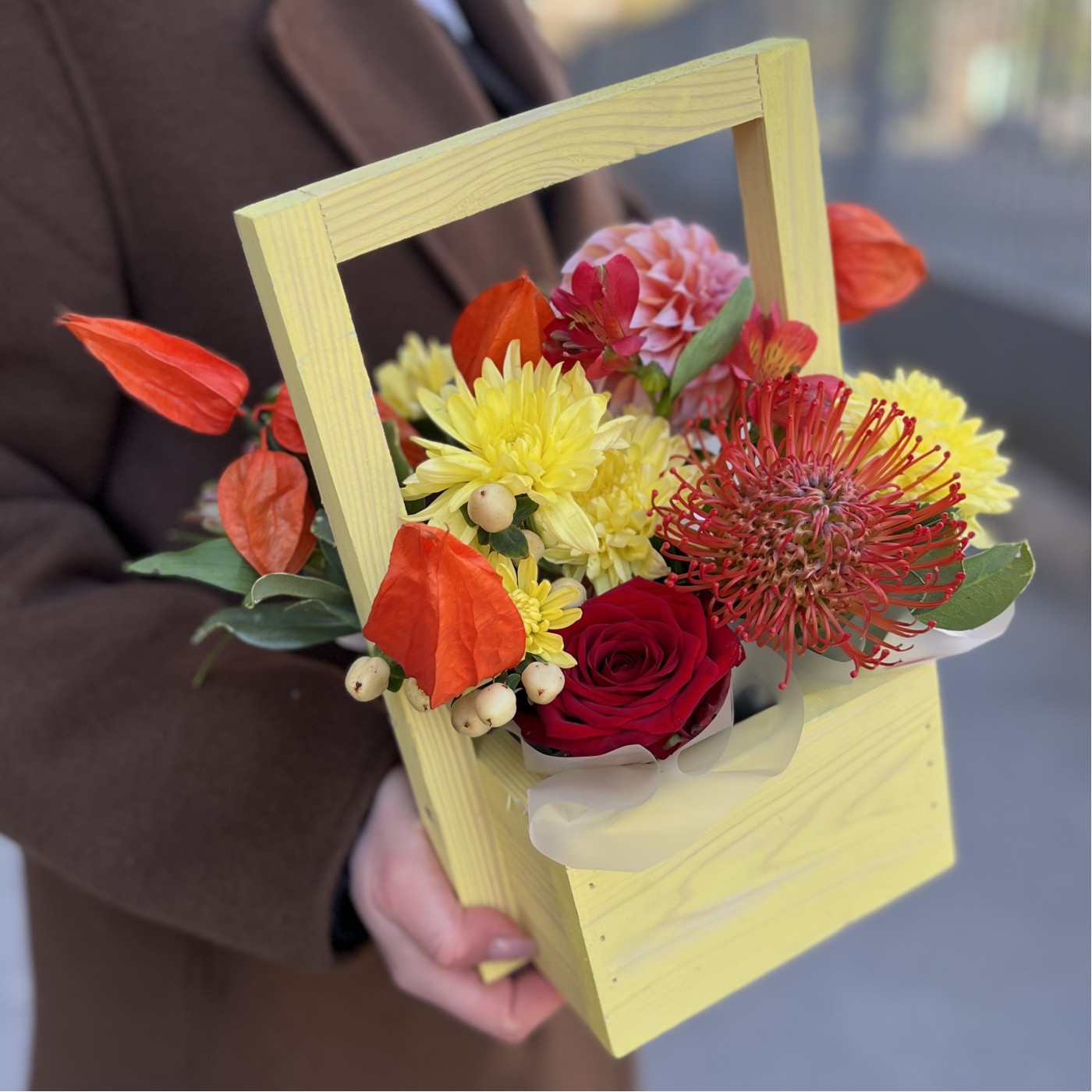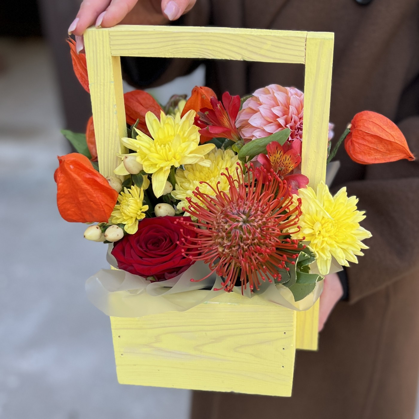 Состав: ящик, оазис, леукоспермум, хризантема куст-1,, физалис-1, гиперикум-1, георгин-1, альстромерия-1. роза ог-1, альстромерия-1, питтоспорум