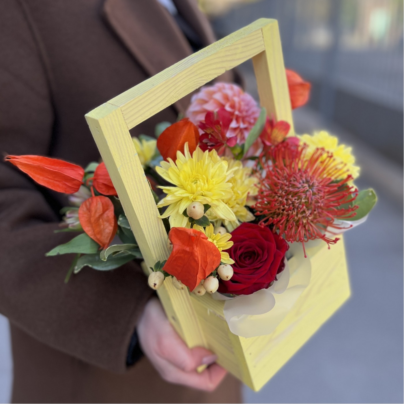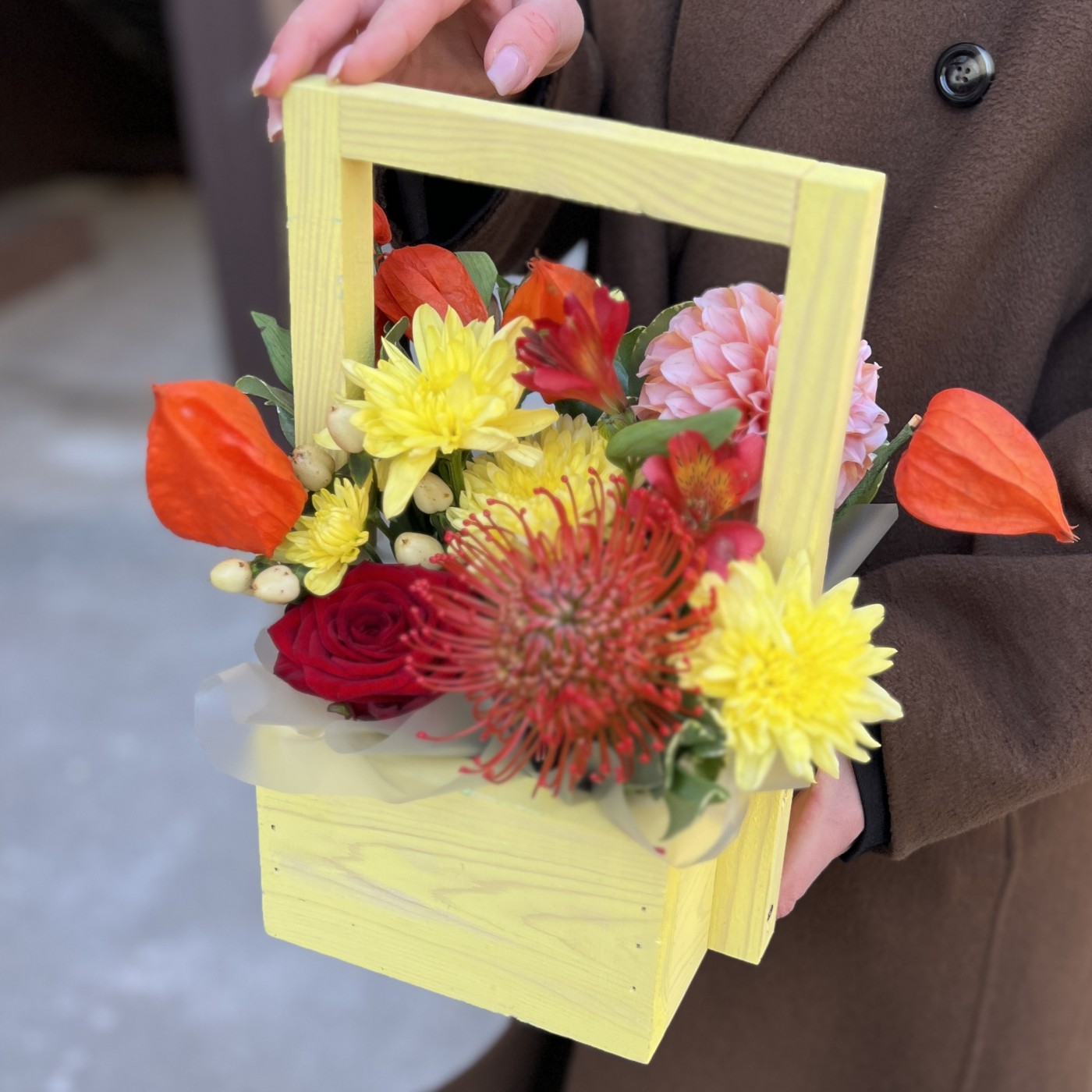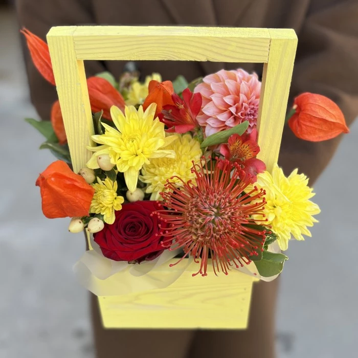 Состав: ящик, оазис, леукоспермум, хризантема куст-1,, физалис-1, гиперикум-1, георгин-1, альстромерия-1. роза ог-1, альстромерия-1, питтоспорум