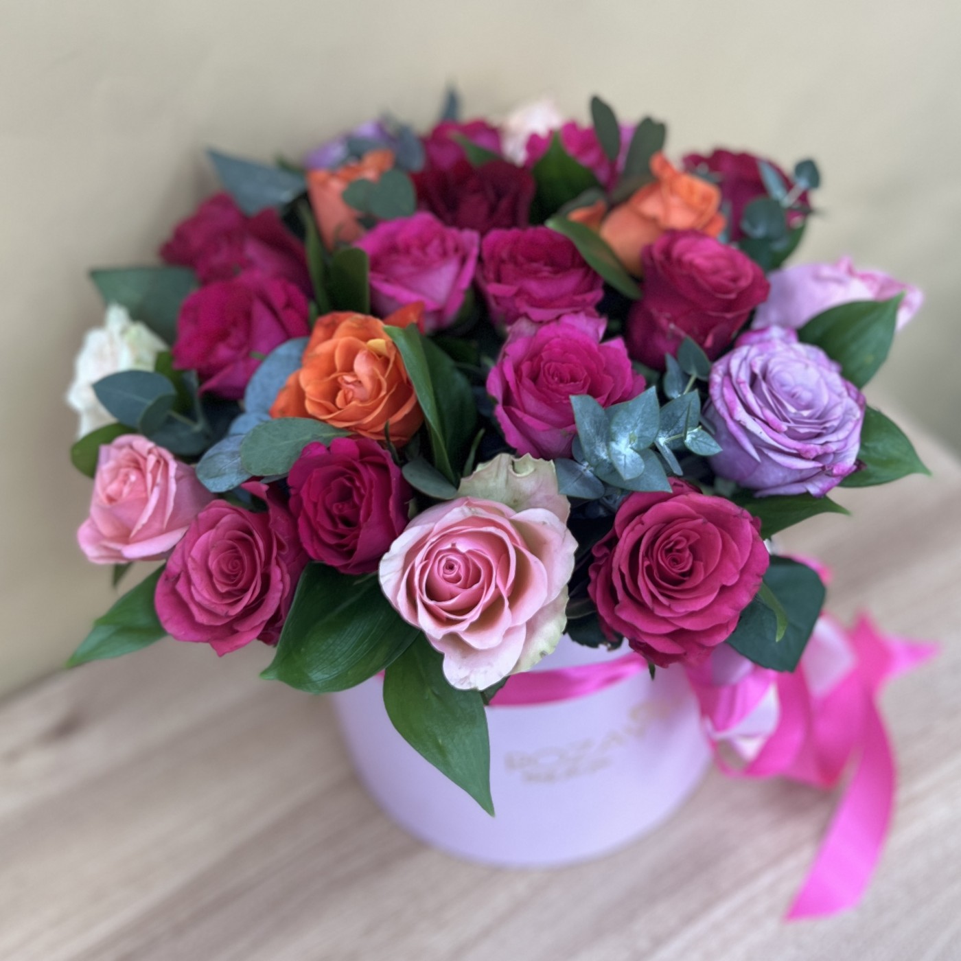Состав: коробка , оазис, роза ог-26, рускус, эвкалипт
