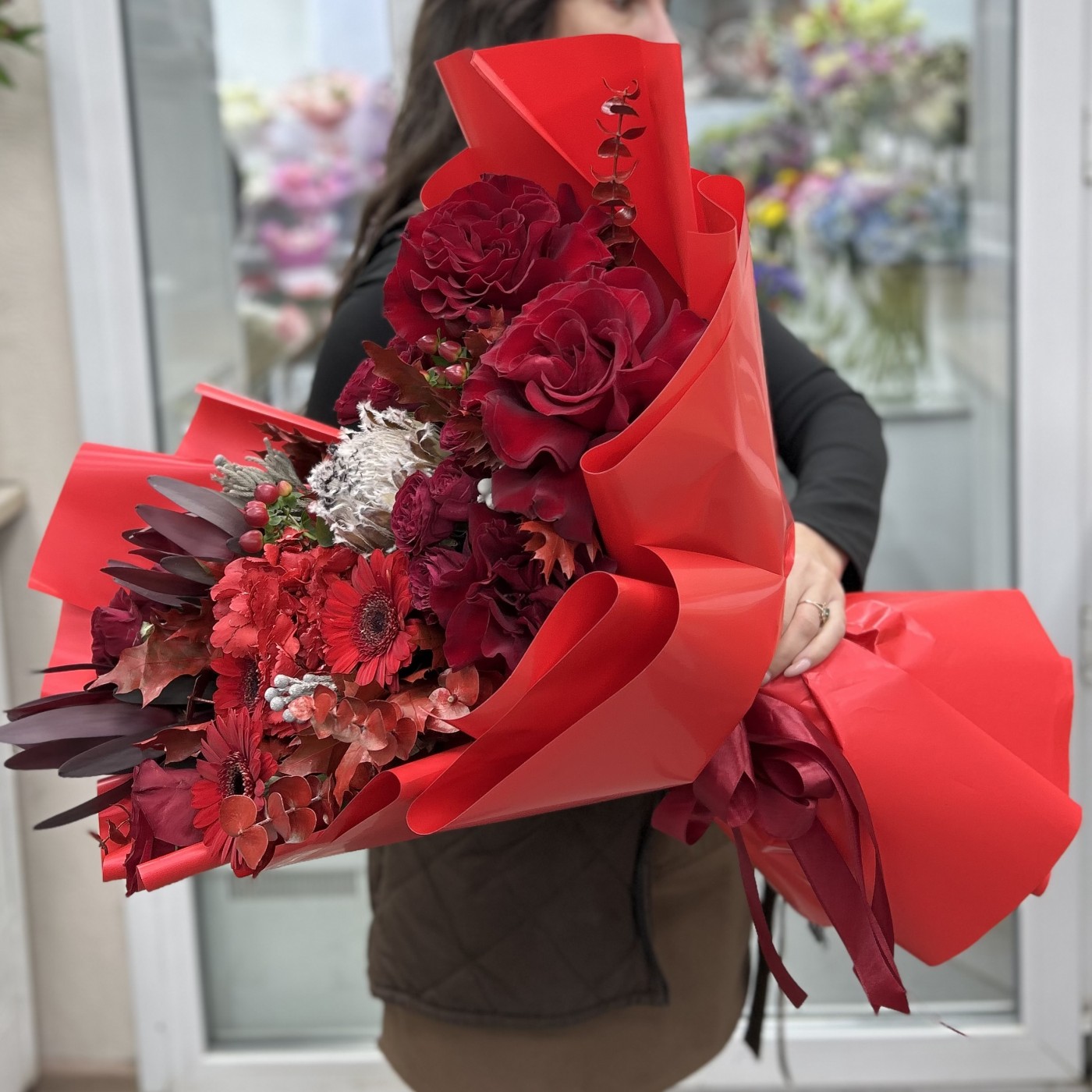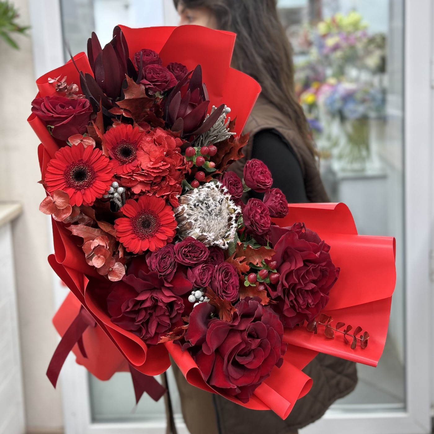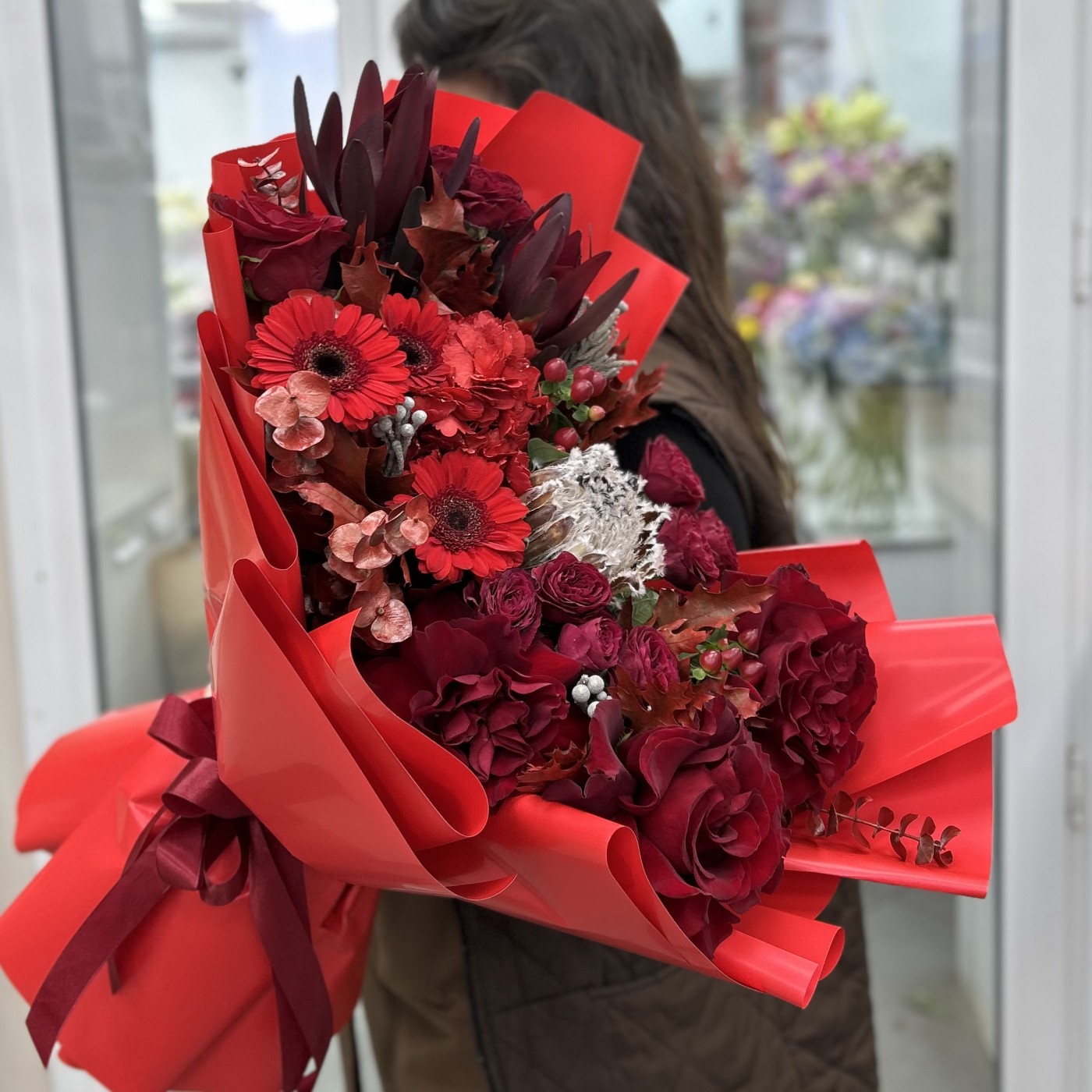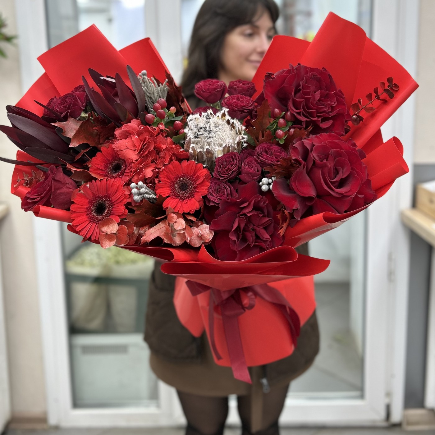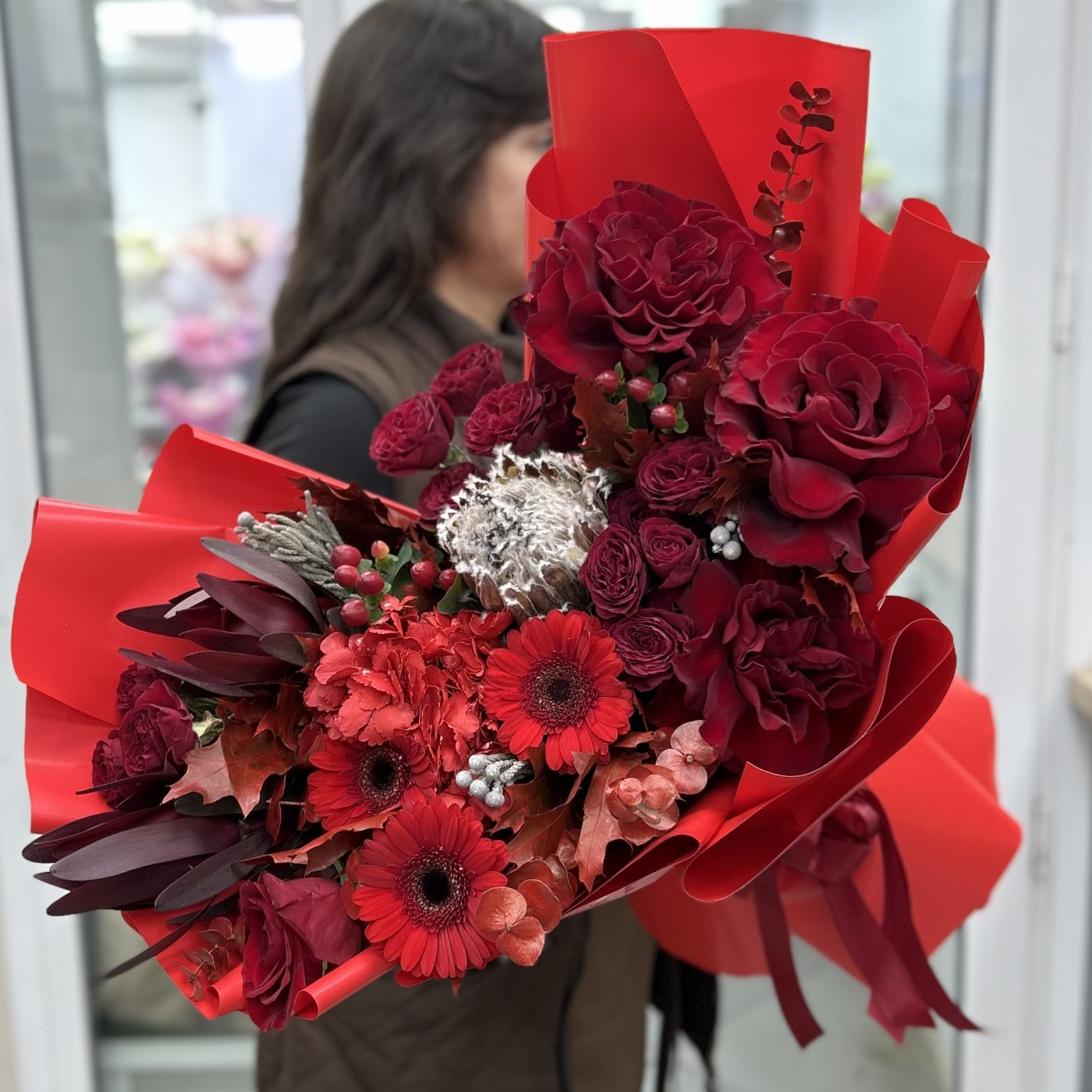 Состав: гермини 3 шт , протея 1 шт , эвкалипт , лист дуба 5 шт , сафари 2 шт , гиперикум 2 шт , писташ , бруния 3 шт , роза куст 3 шт , роза 4 шт , гортензия 1 шт , упаковка .