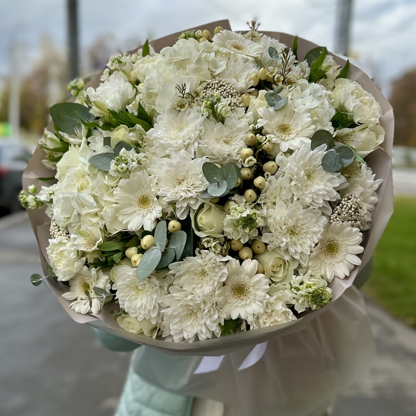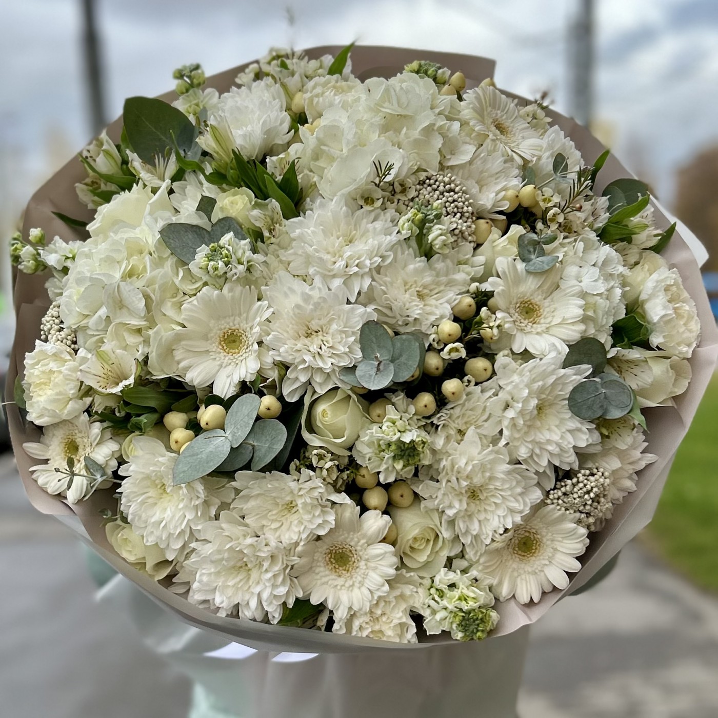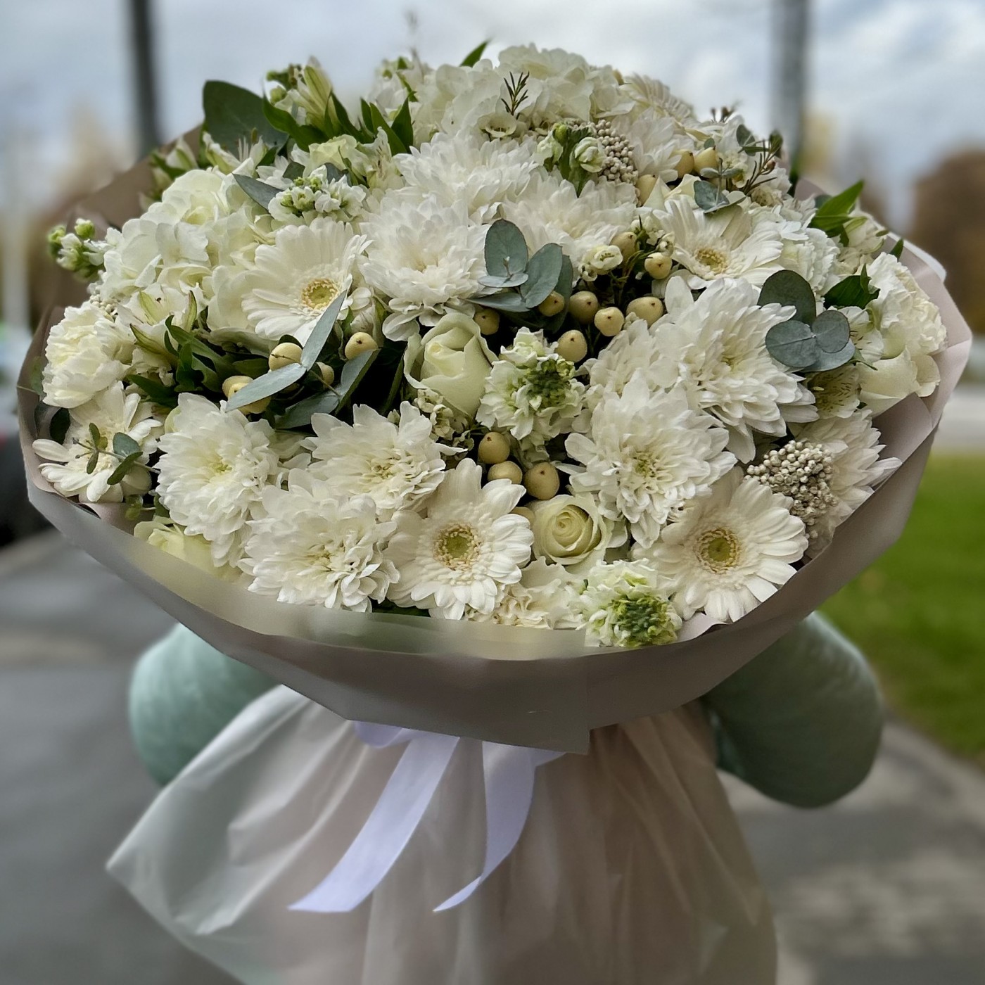 Состав: Гвоздика белая 5 шт , альстромерия белая 8шт , озотамнус 3 шт , эвкалипт , гиперикум белый 7 шт , роза белая 9 шт , маттиола белая 7 шт , упаковка, гермини 5,балтика 5.