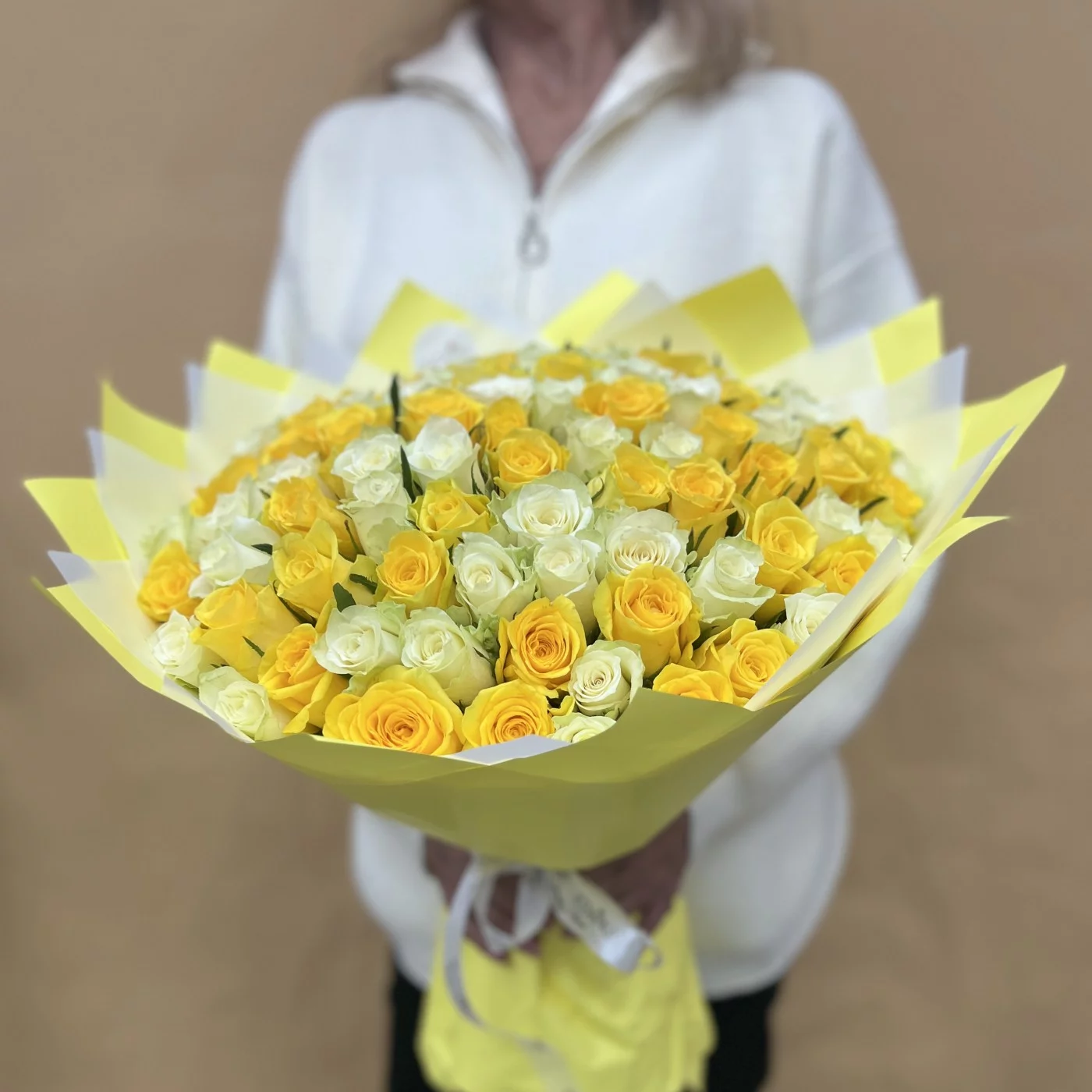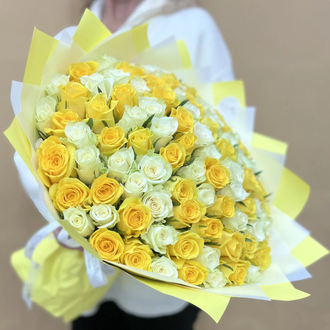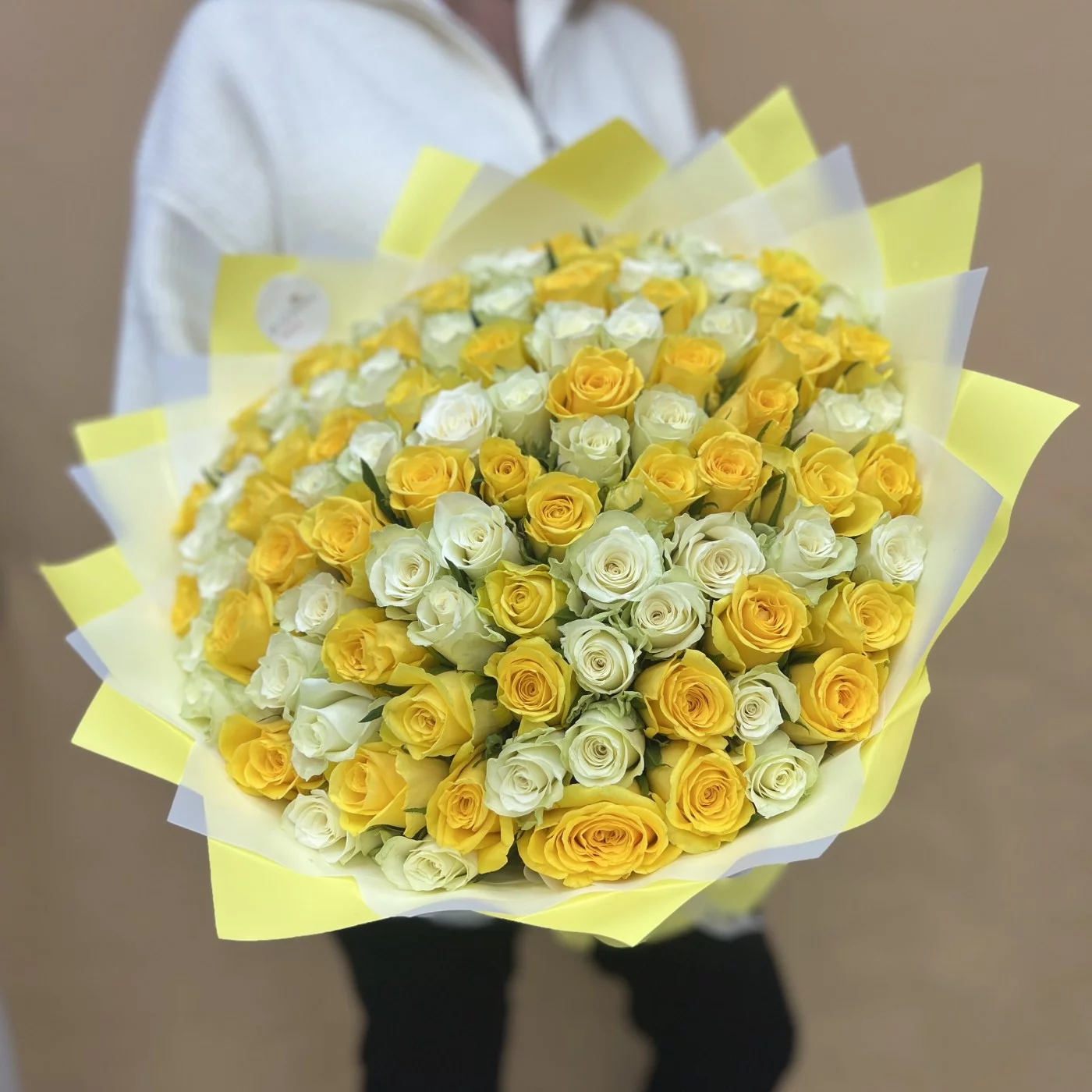 Состав: роза белая - 50 шт, роза желтая - 51 шт, упаковка.