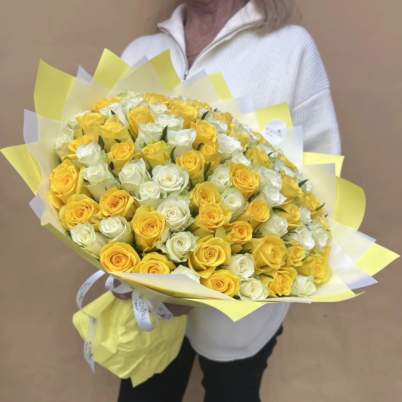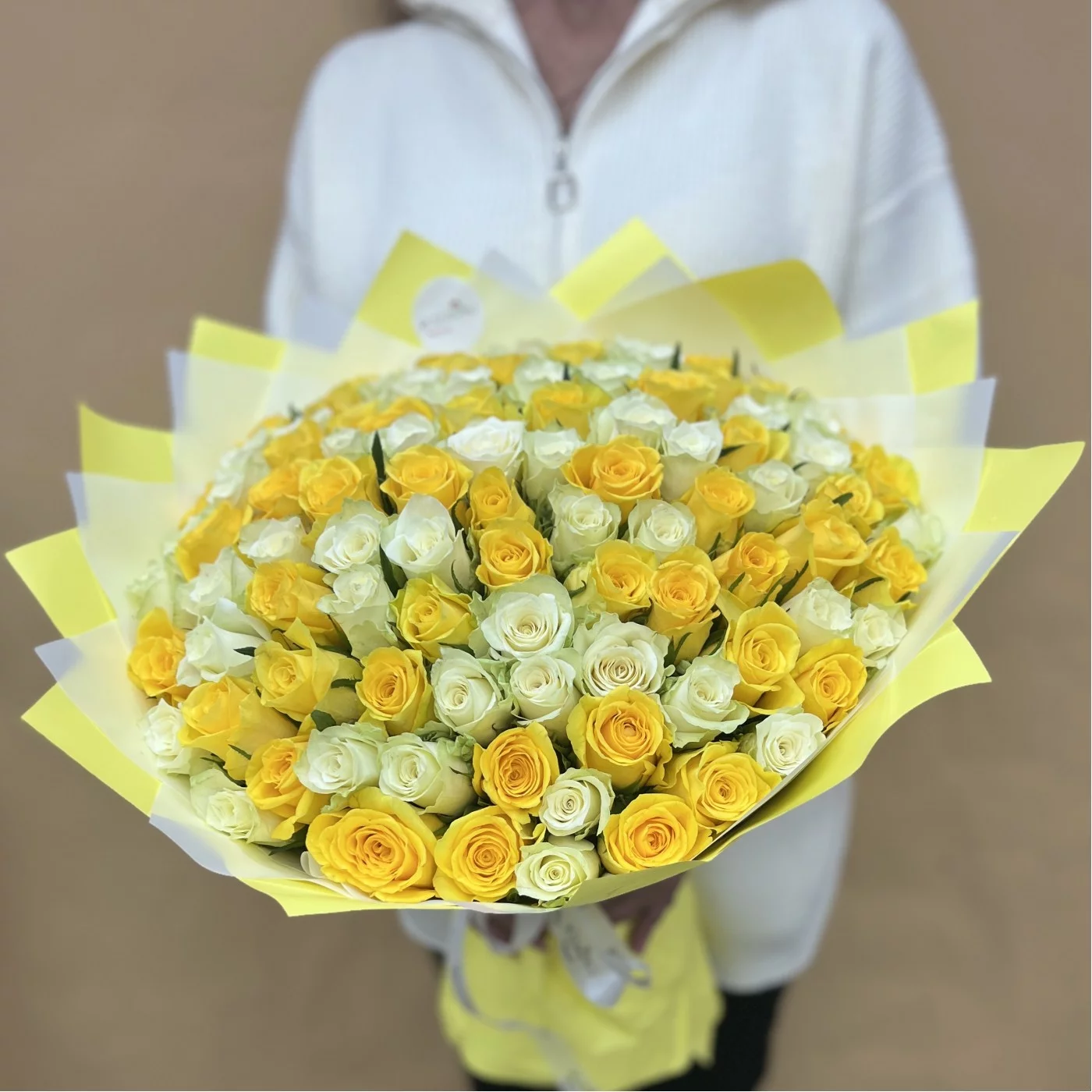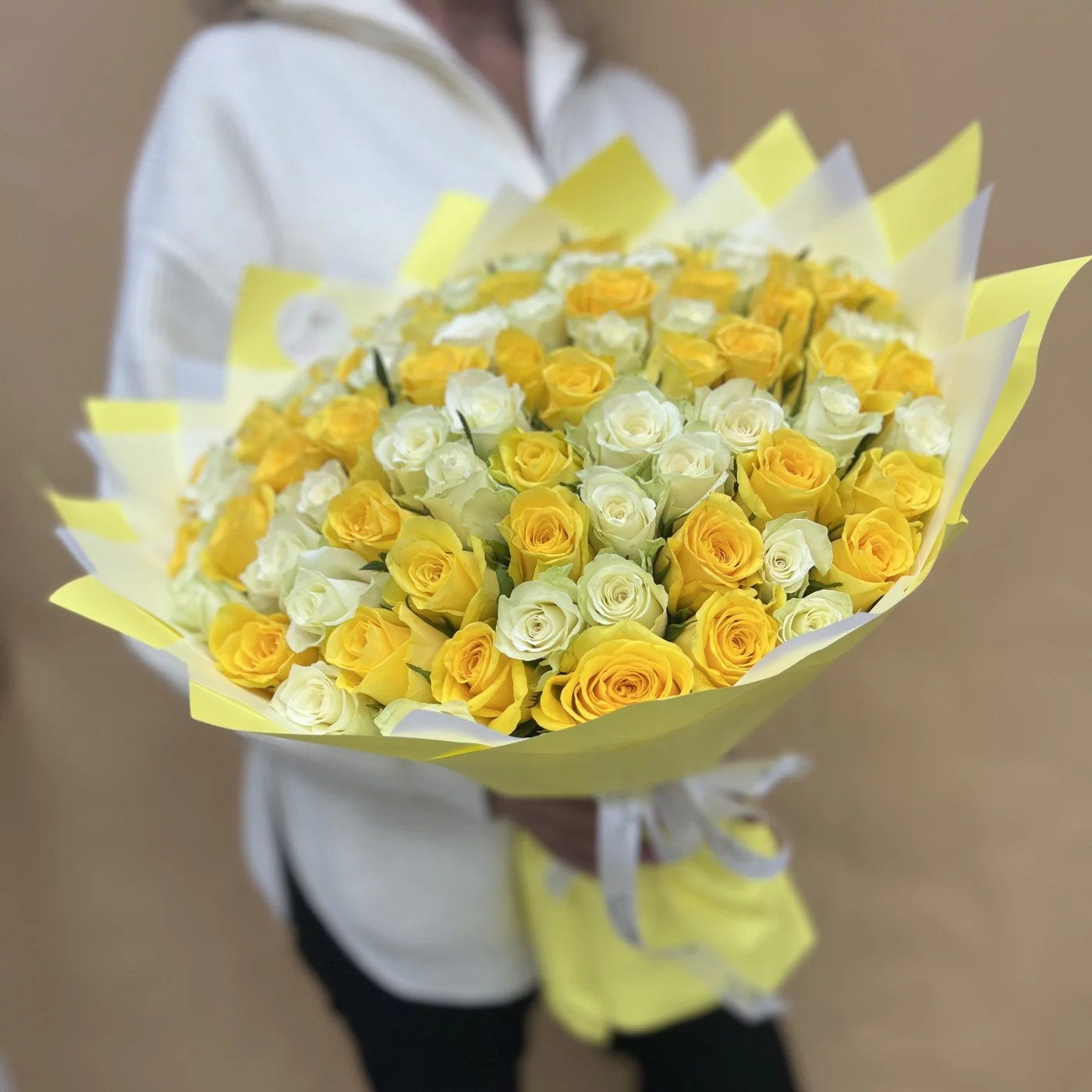 Состав: роза белая - 50 шт, роза желтая - 51 шт, упаковка.