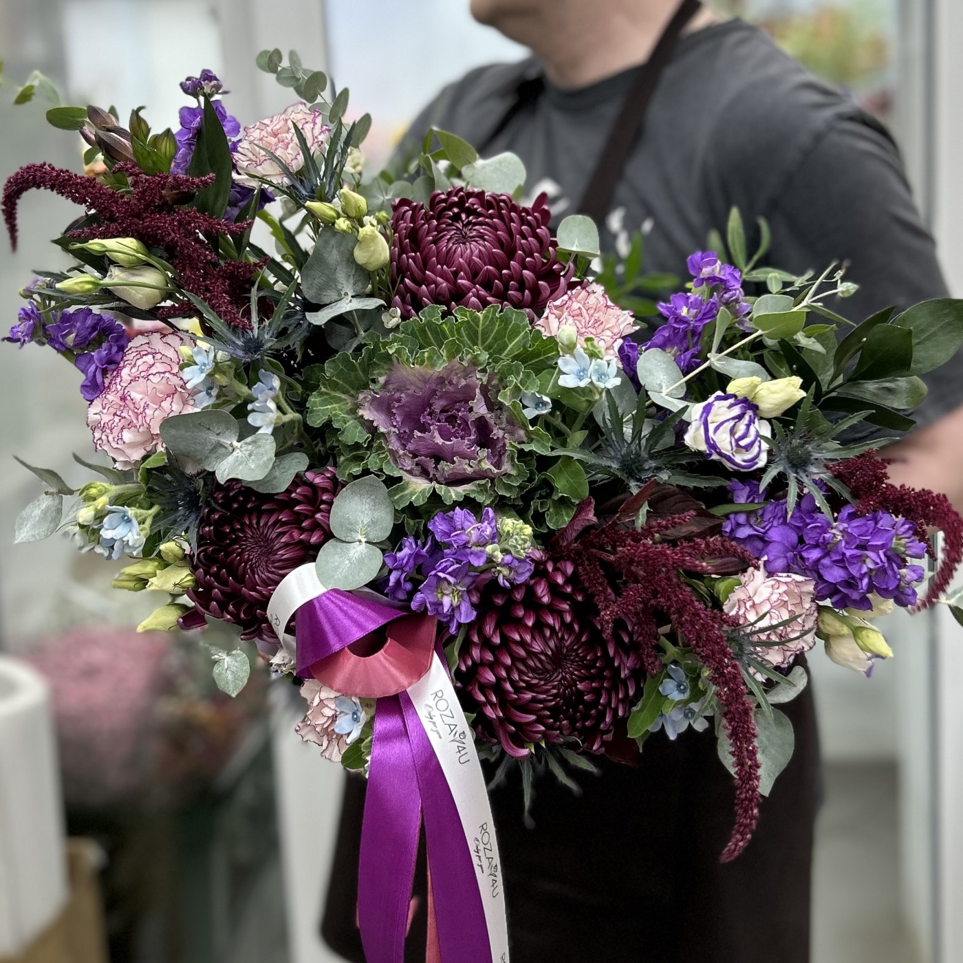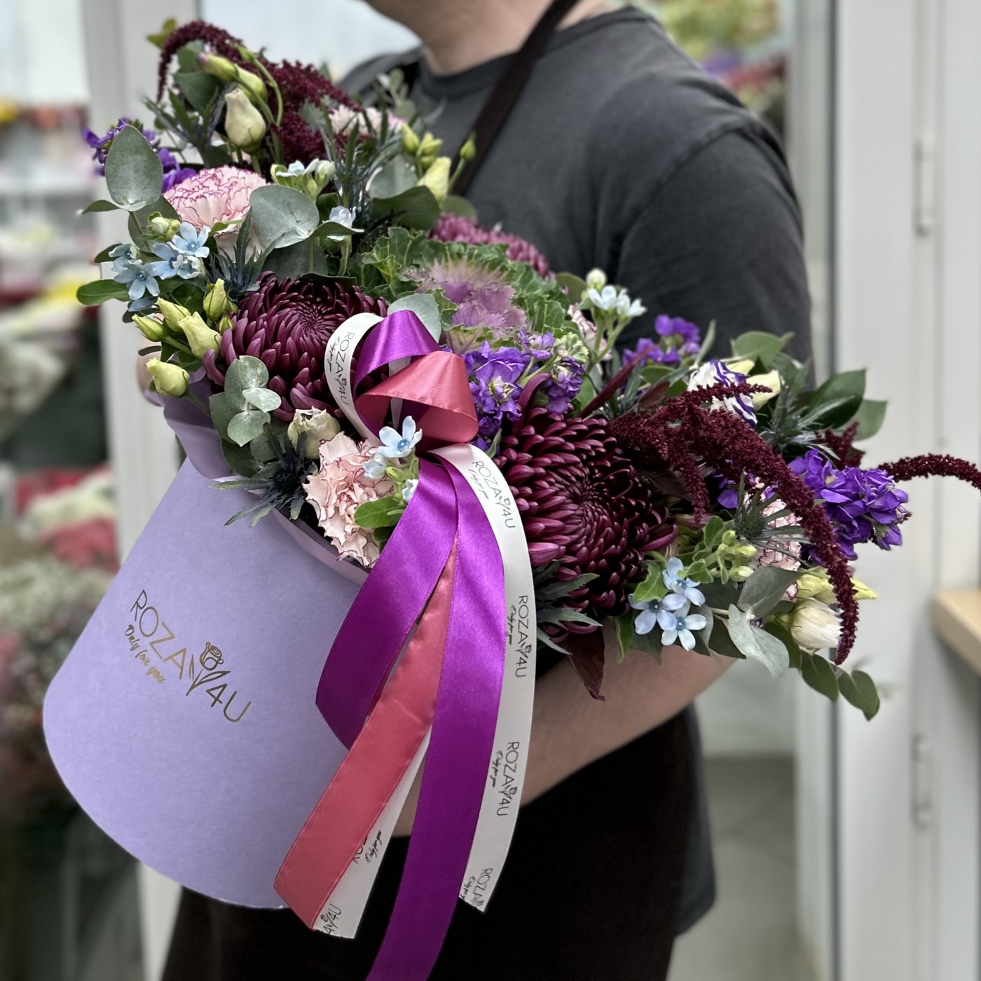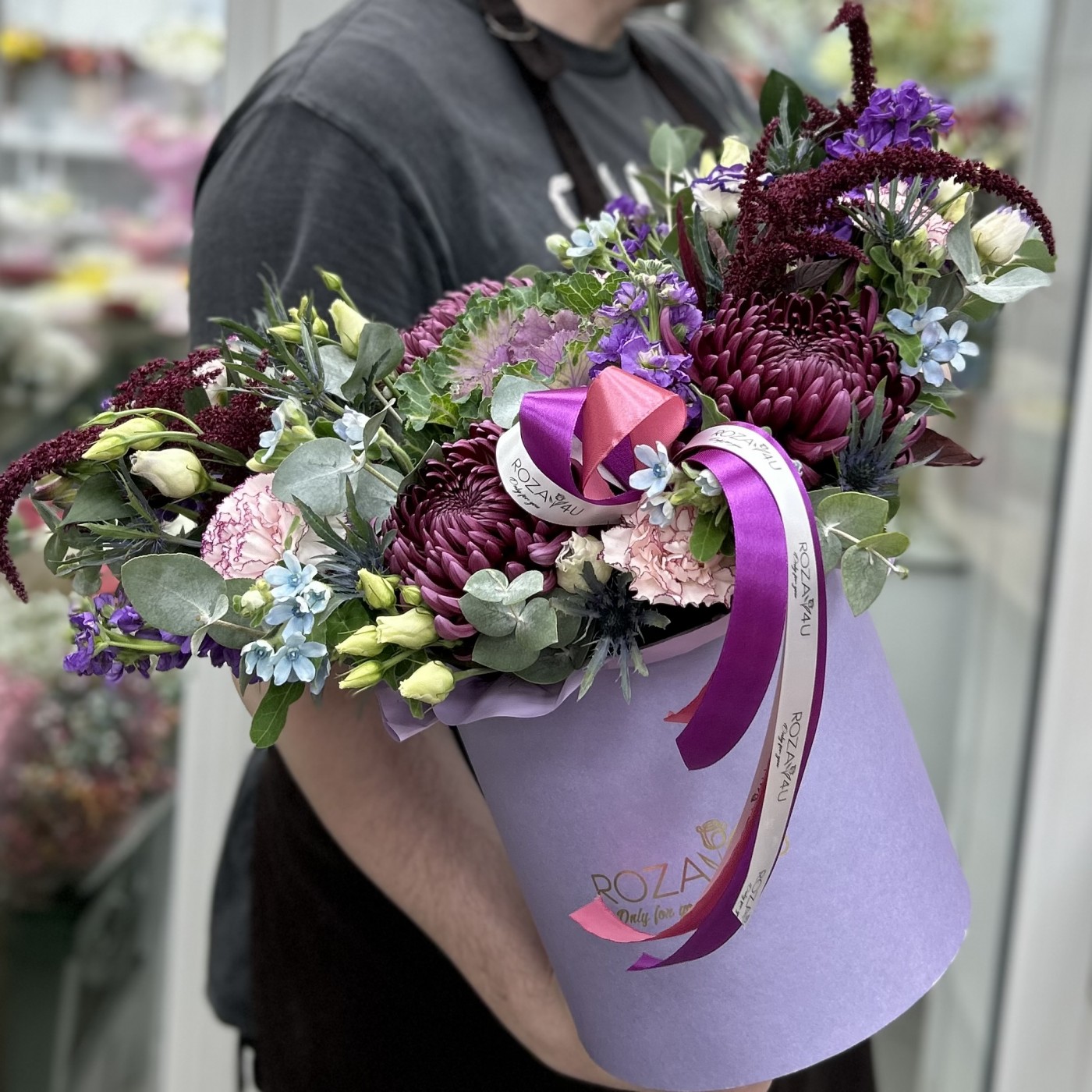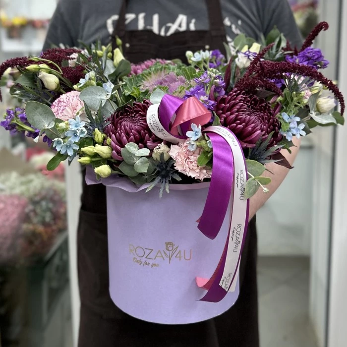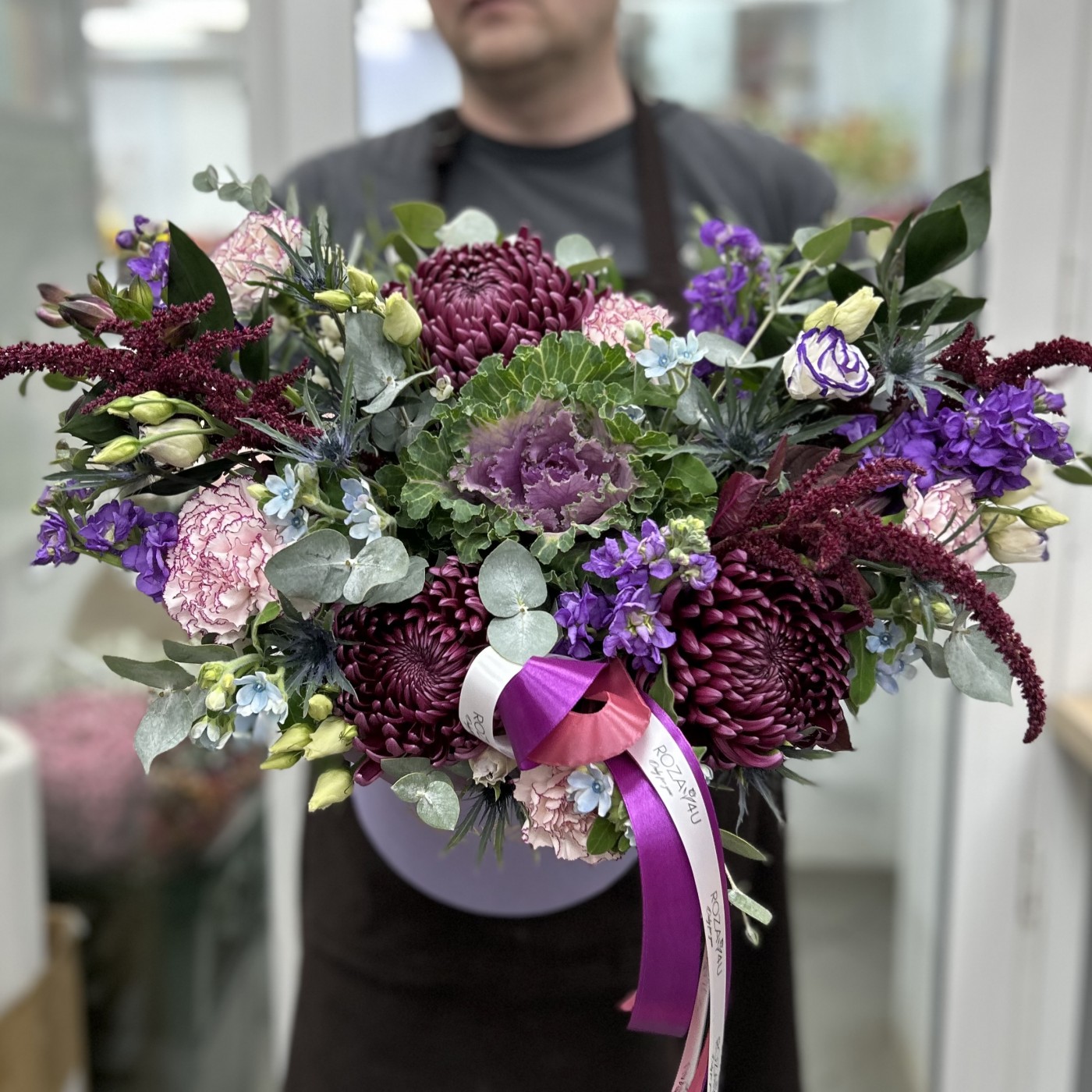 Состав: коробка, оазис , брассика 1 шт , хризантема ог 3 шт , амарант 3 шт , маттиола 5 шт , гвоздика белая 5 шт , оксипеталум 5 шт , альстромерия 3 шт , эустома 2 шт , эрингиум 6 шт , рускус 1 шт , эвкалипт , писташ , лента.