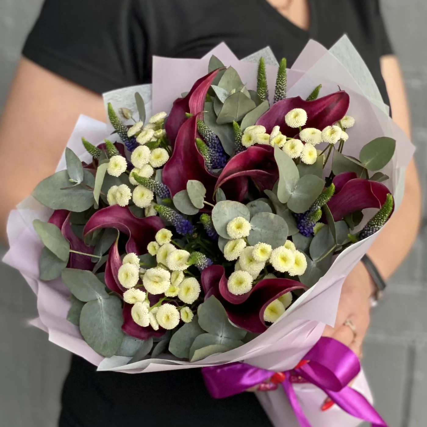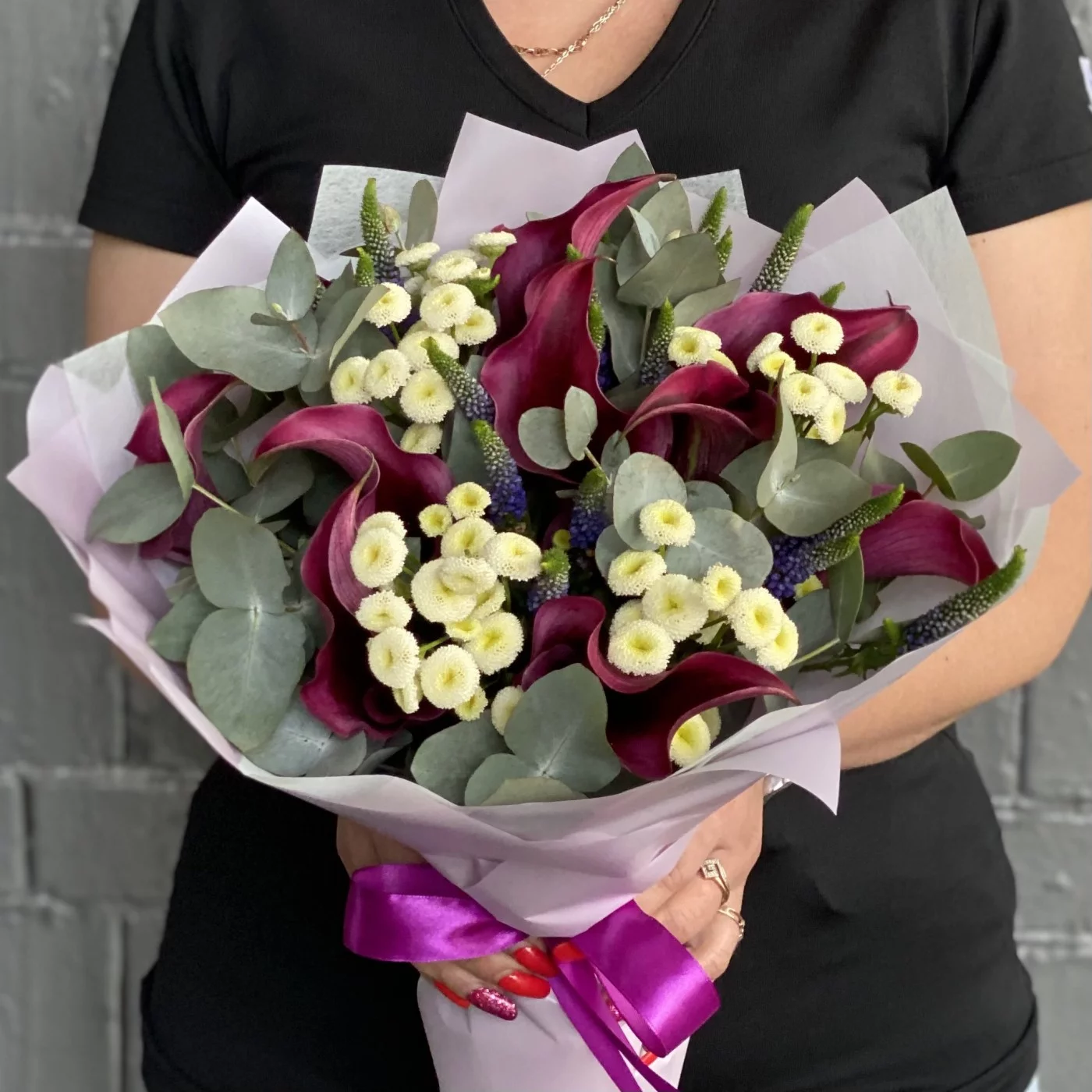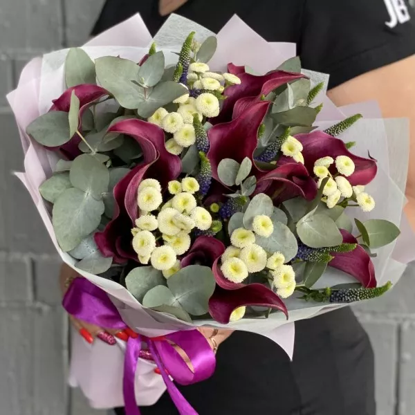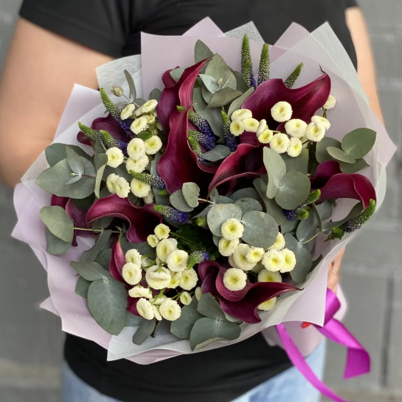 Оригинальный сборный букет из фиолетовых калл с танацетумом Па рио и вероникой. Такой букет можно преподнести как мужчине, так и женщине в качестве дополнения к основному подарку.