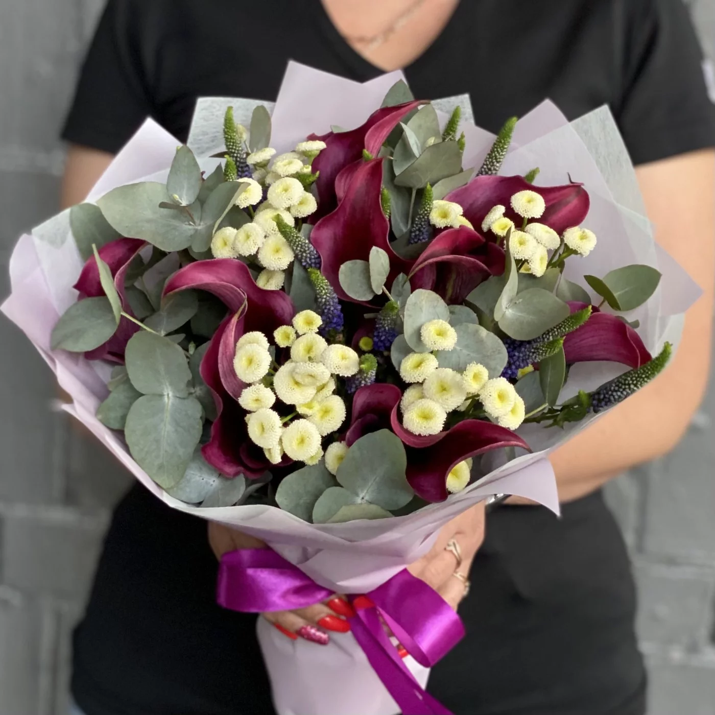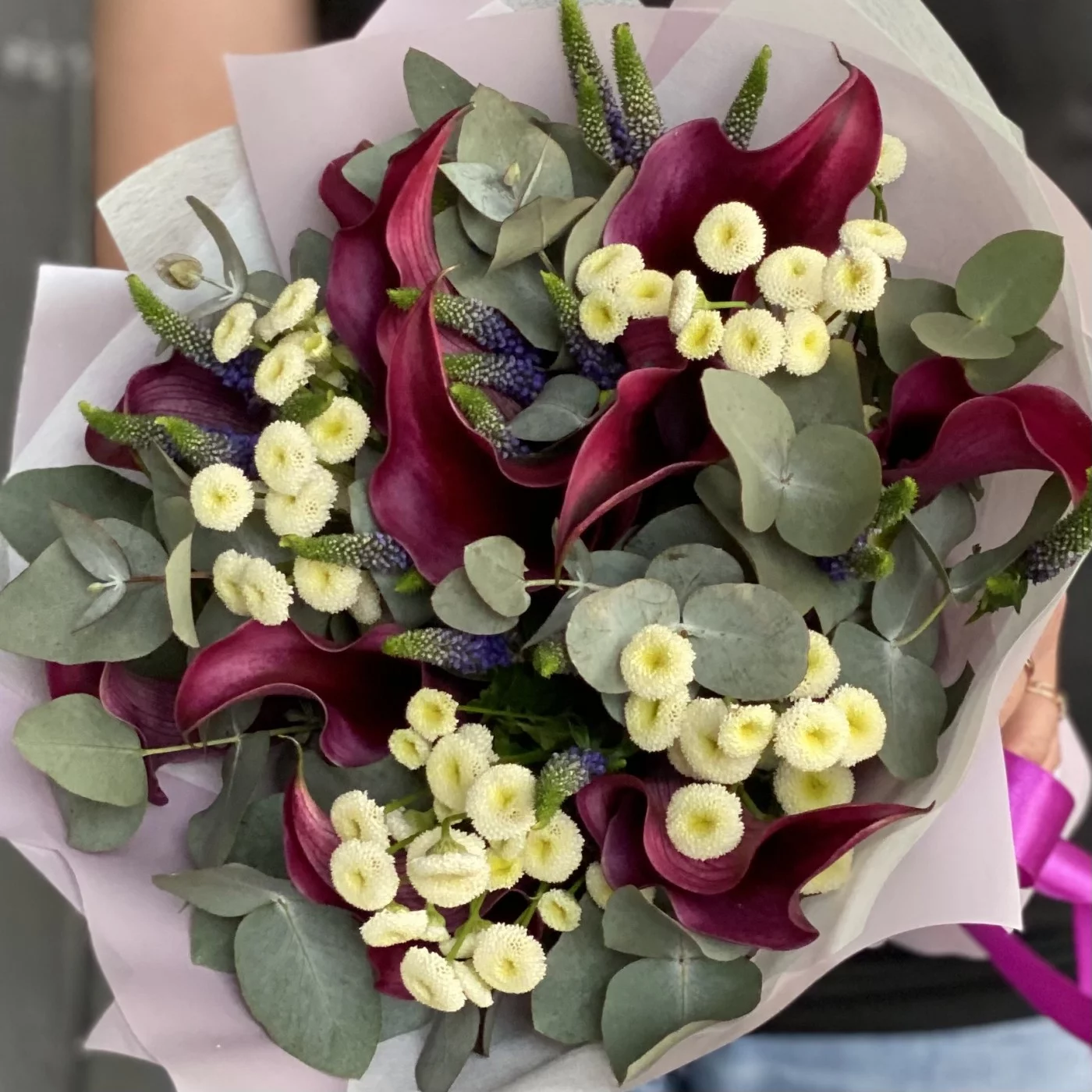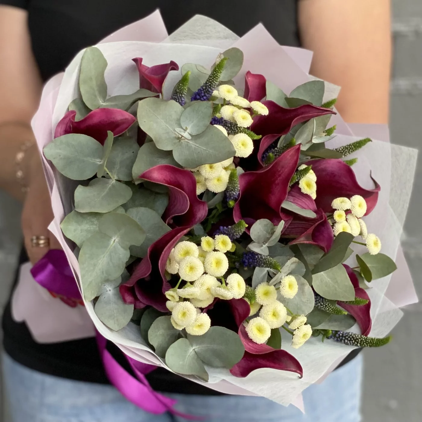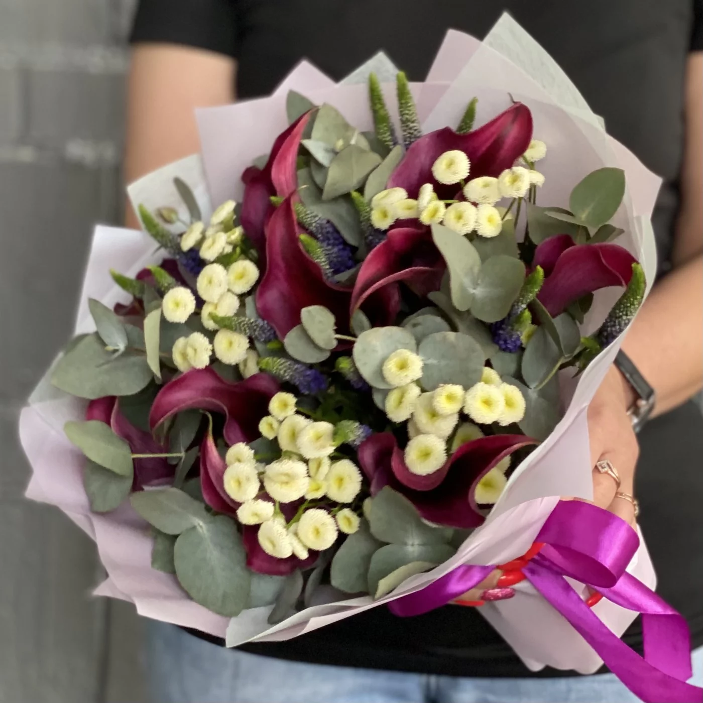 Оригинальный сборный букет из фиолетовых калл с танацетумом Па рио и вероникой. Такой букет можно преподнести как мужчине, так и женщине в качестве дополнения к основному подарку.