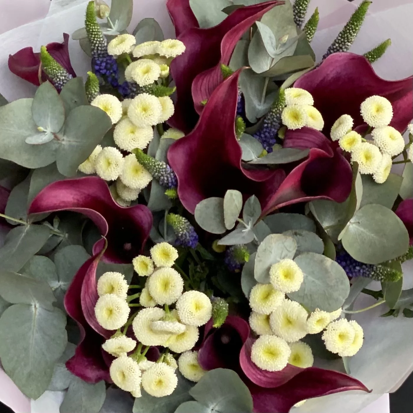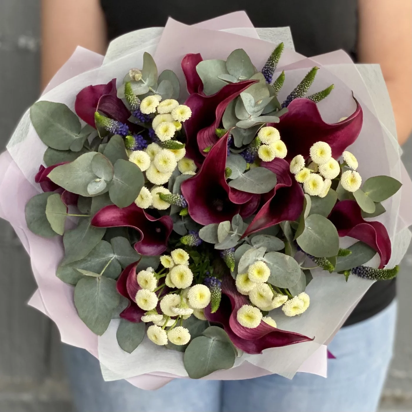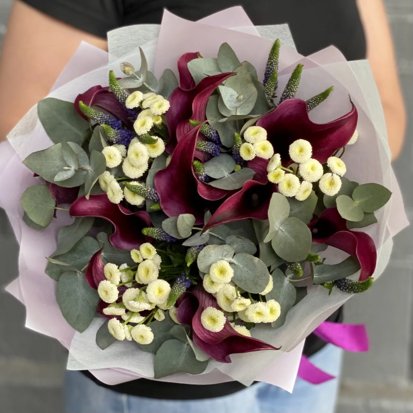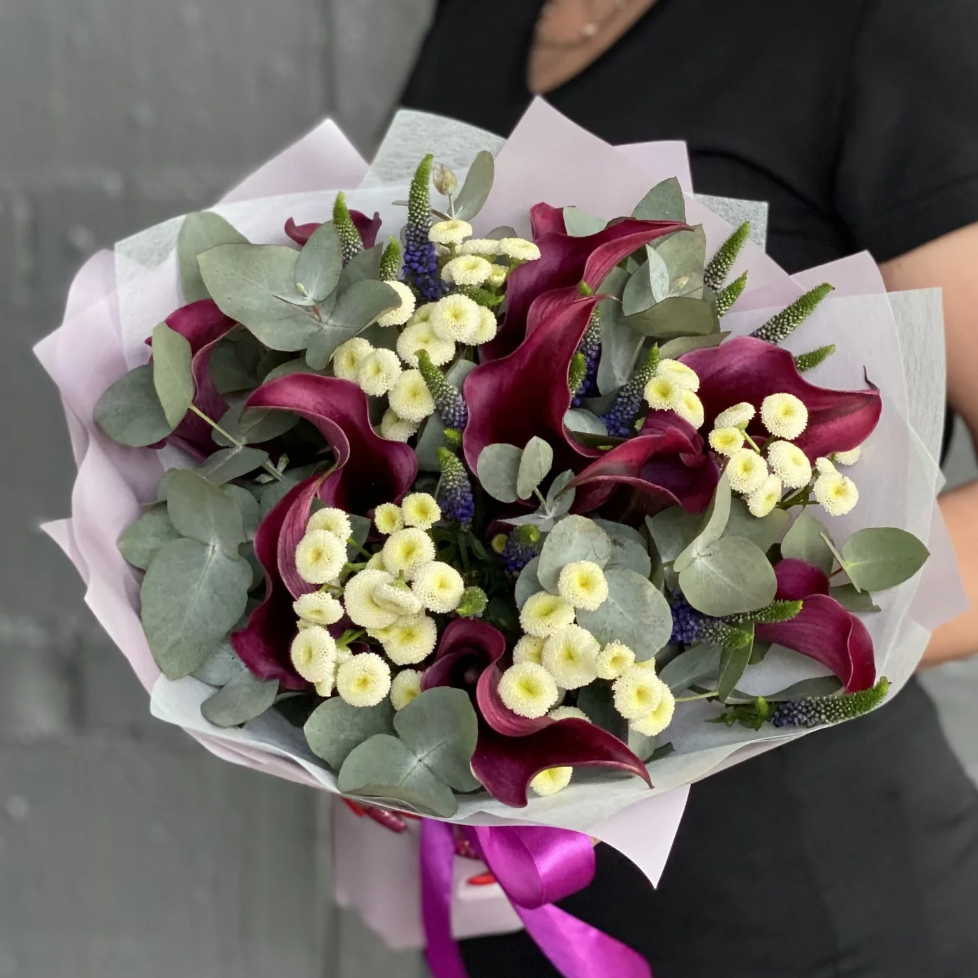 Оригинальный сборный букет из фиолетовых калл с танацетумом Па рио и вероникой. Такой букет можно преподнести как мужчине, так и женщине в качестве дополнения к основному подарку.