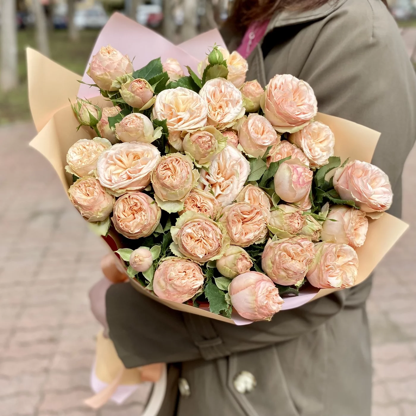 Букет персиковых пионовидных роз Джентл Трендсеттер. Роза имеет пышные ветки с крупными и фактурными бутонами. Цвет розы переходит от зеленого к кремовому. Таким букетом вы точно сможете удивить получателя.