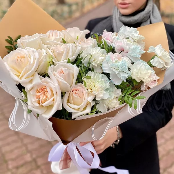 Нежный букет из пионовидных, ароматных роз White O`Hara и радужных гвоздик. Трогательный и нежный букет на любой случай.