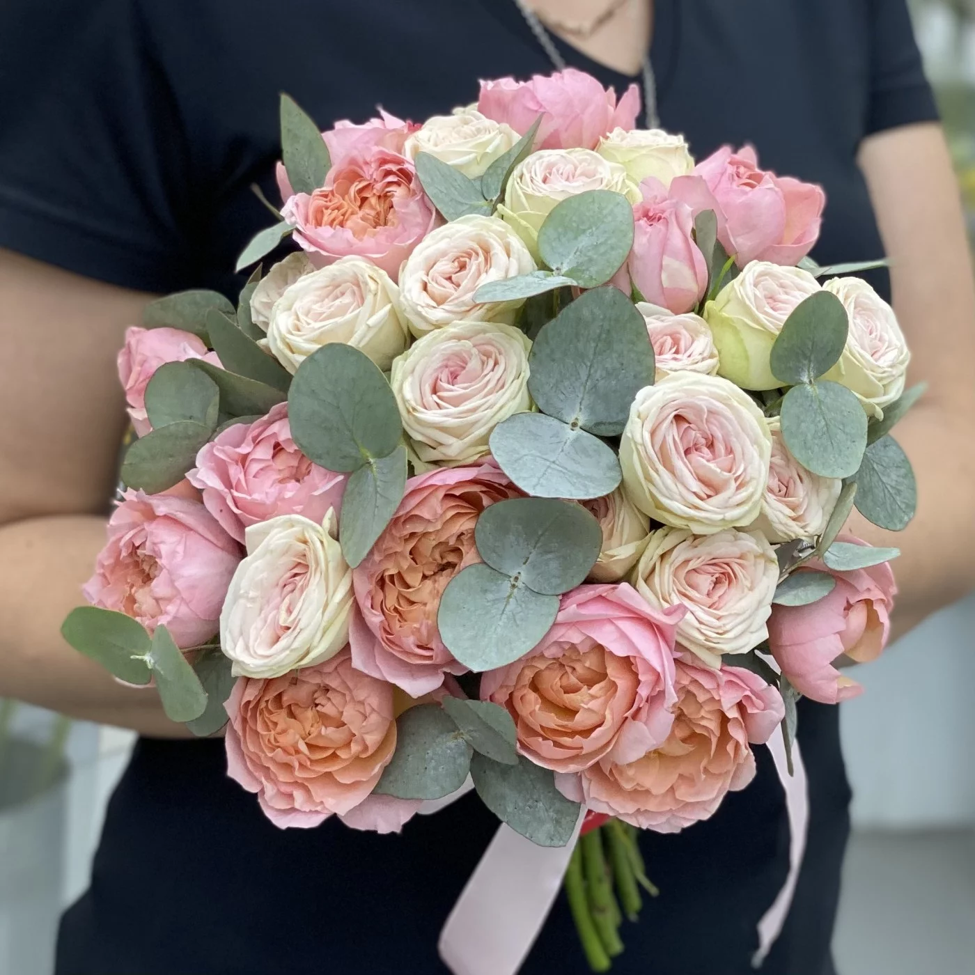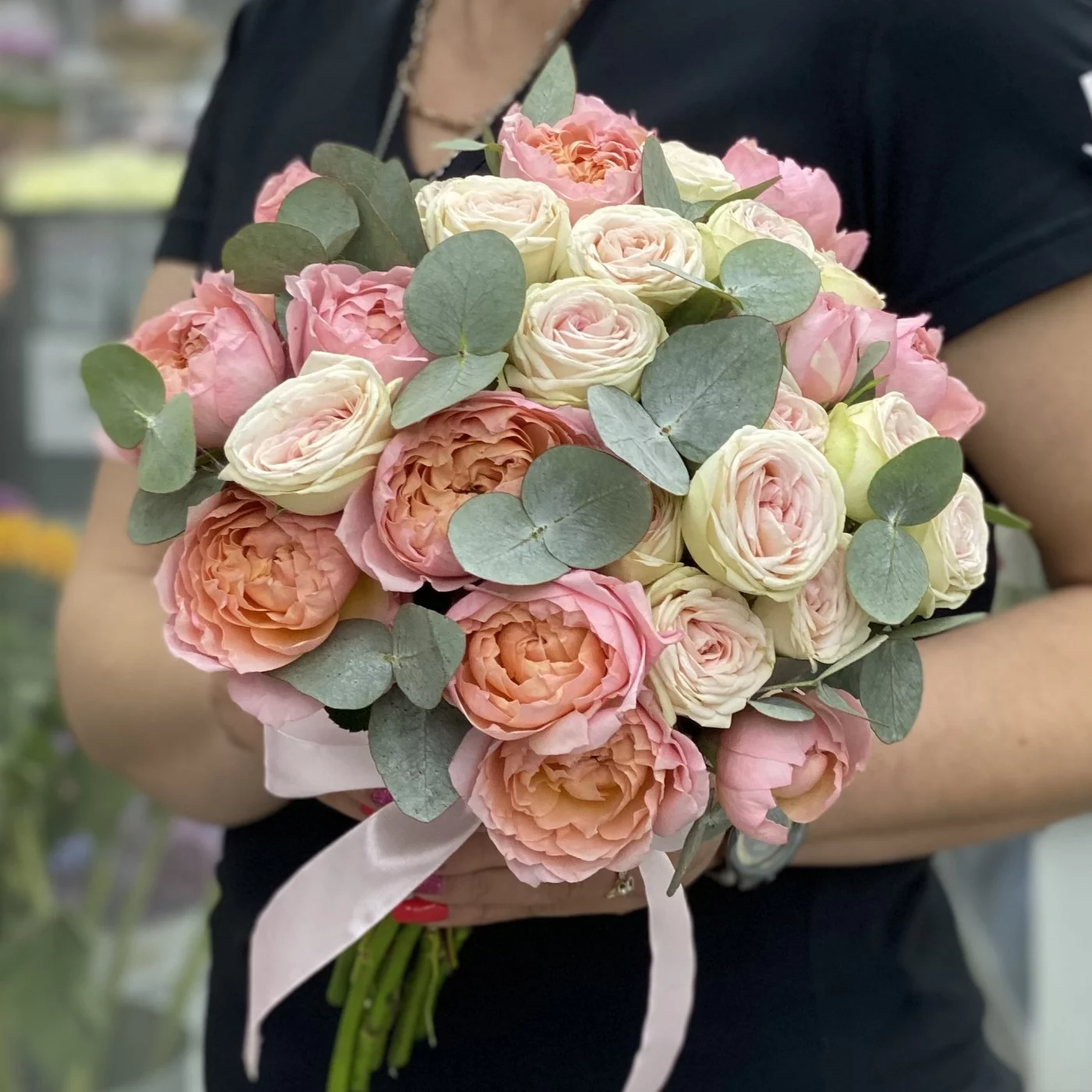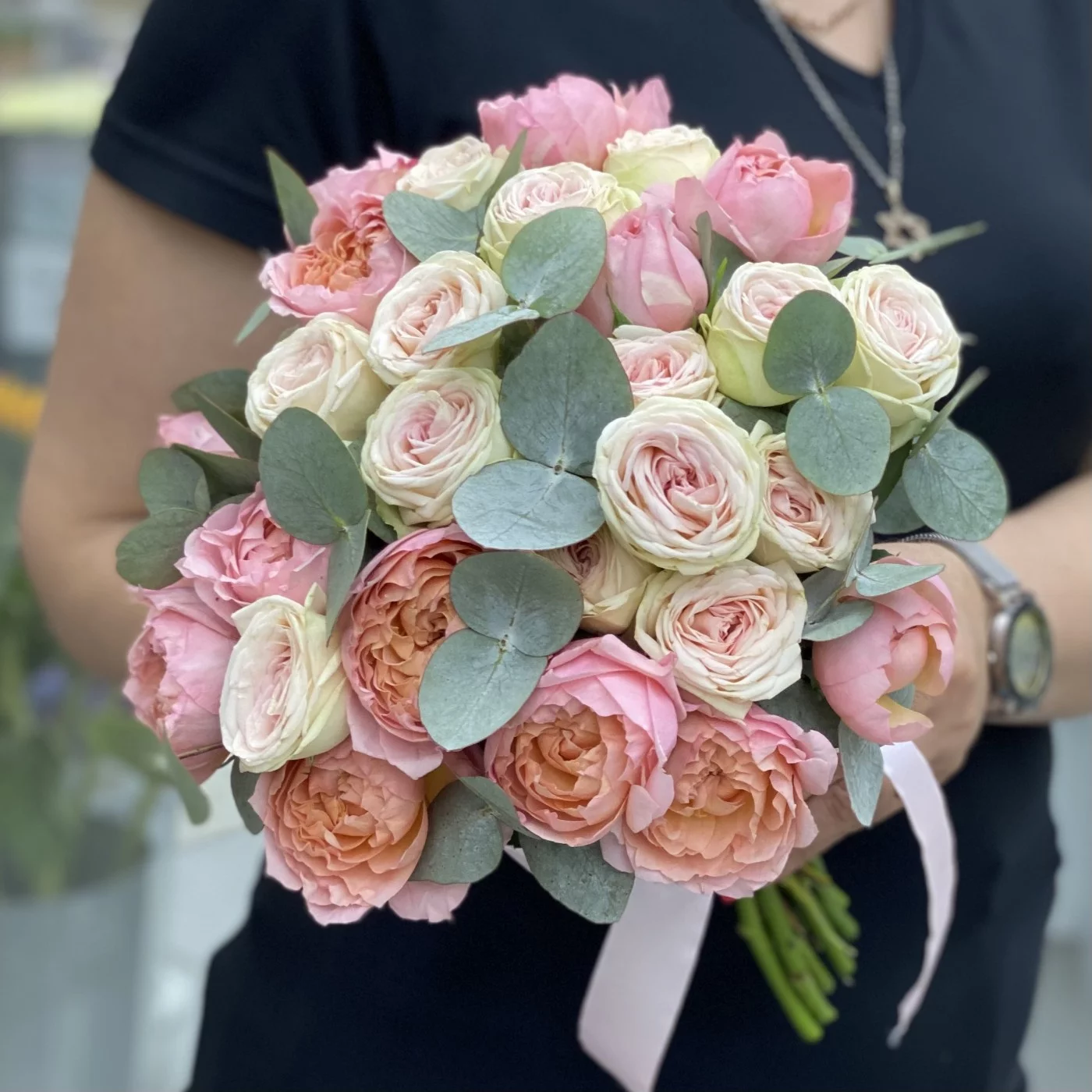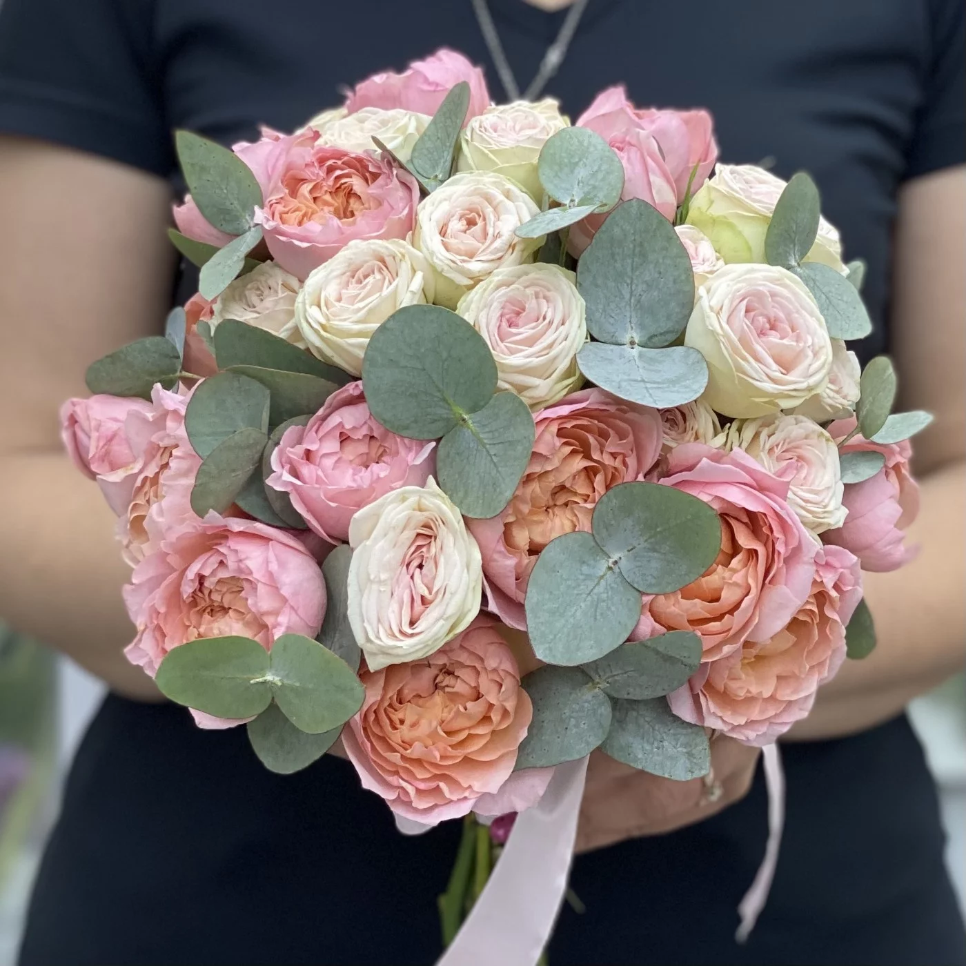 Букет невесты из кустовых пионовидных роз разного сорта. Такой букет будет изюминкой Вашего свадебного образа.