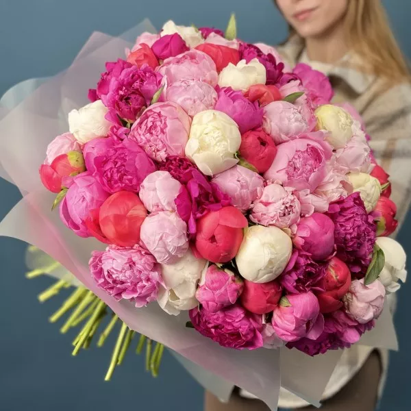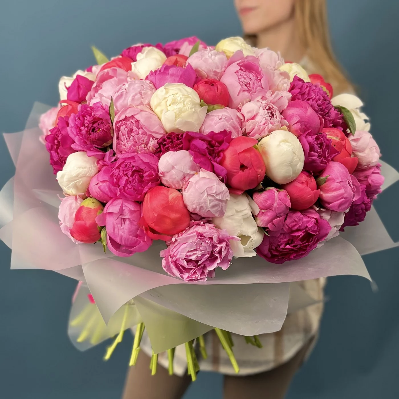 Букет из 101 яркого пиона MIX — настоящее воплощение яркости, роскоши и праздничного настроения.