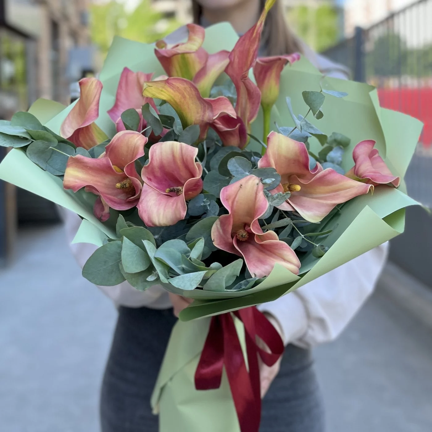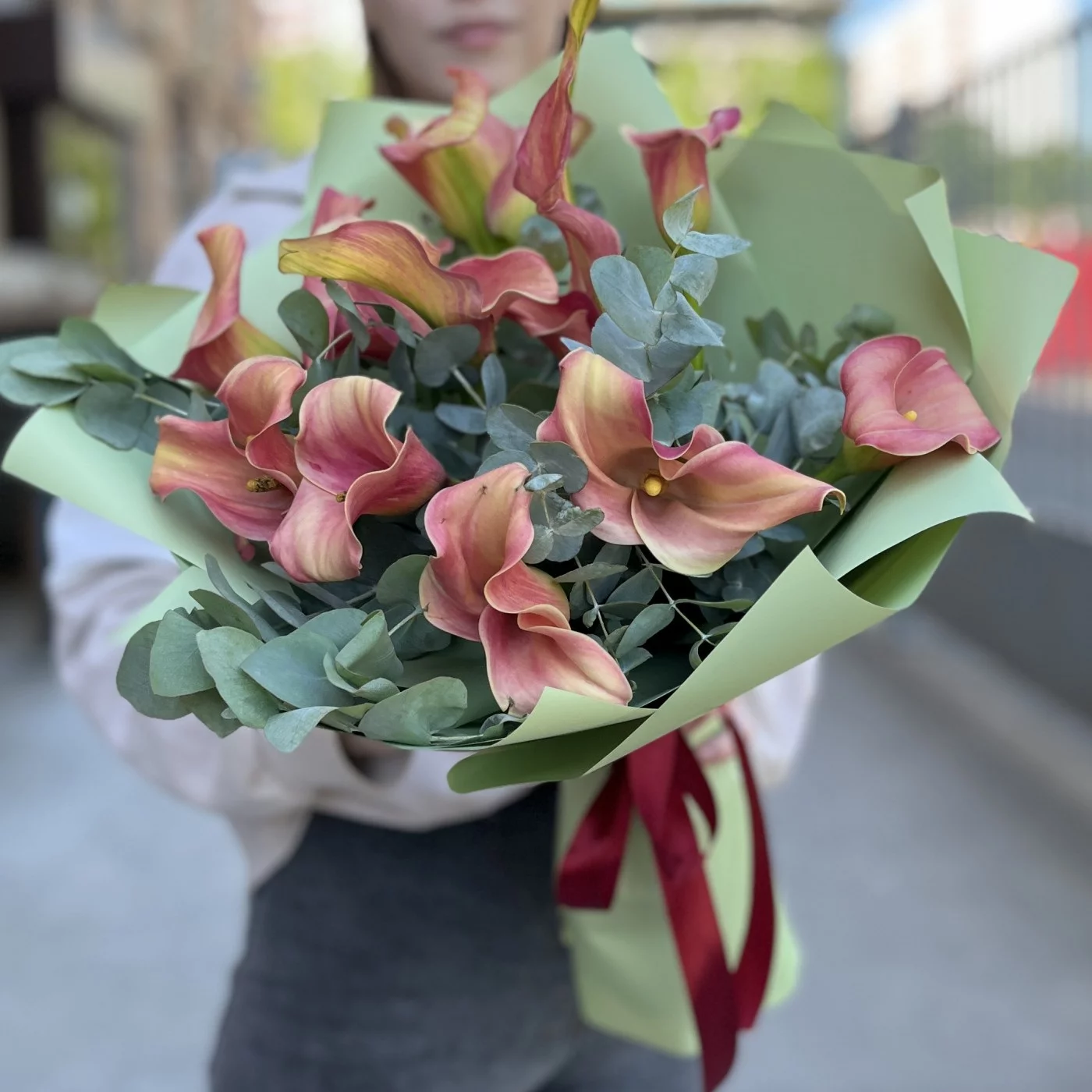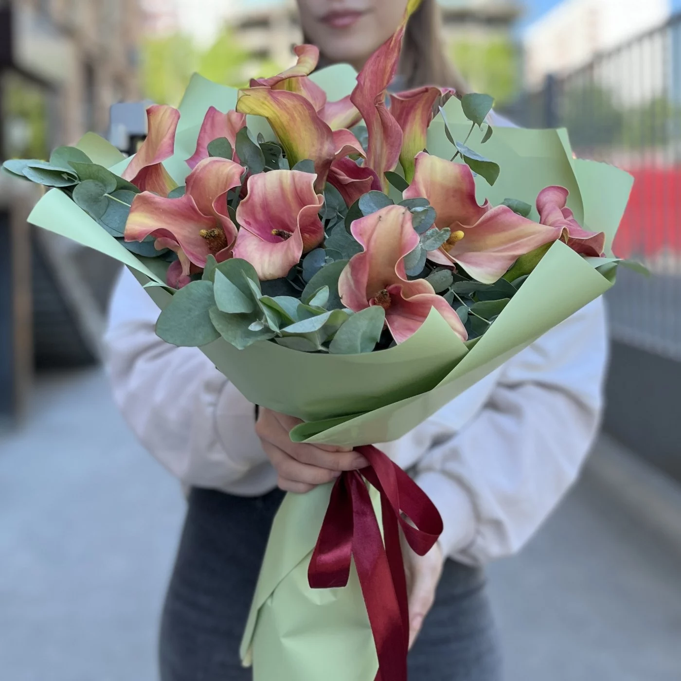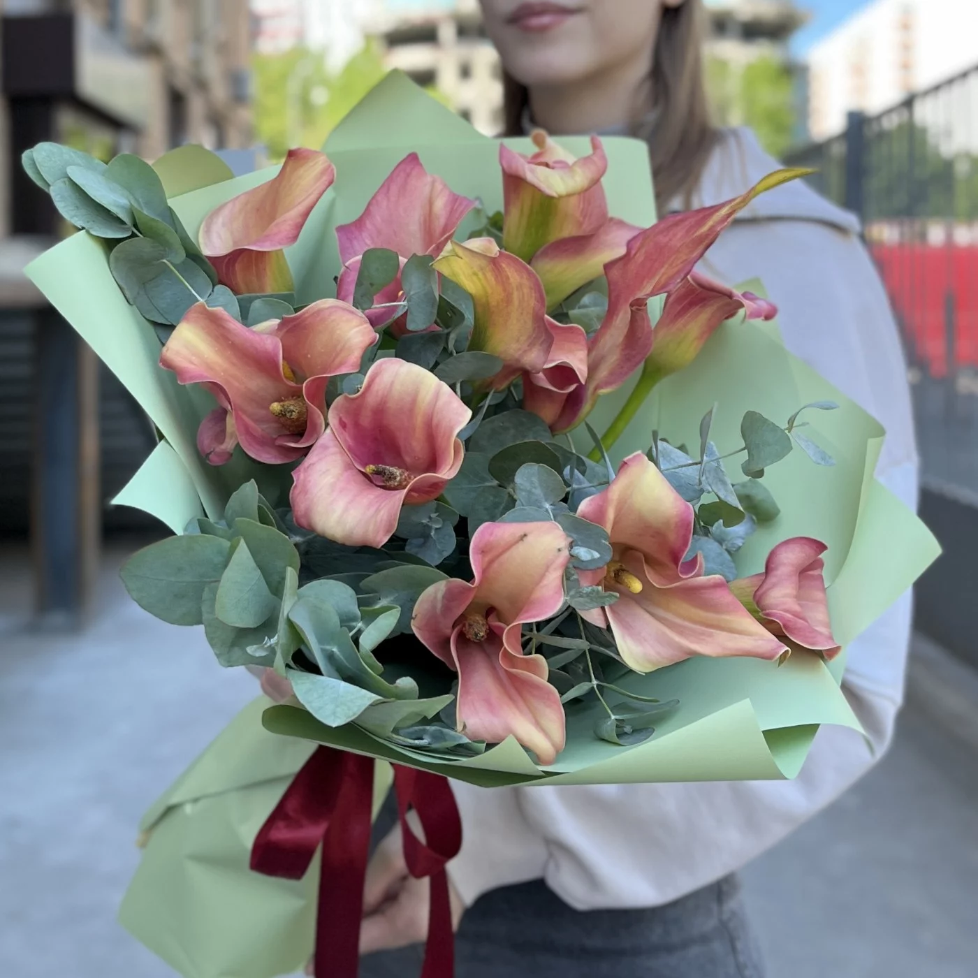 Очаровательный букет из 11 калл с добавлением свежего эвкалипта — идеальный выбор для особых моментов. Элегантные белые цветы в сочетании с ароматным эвкалиптом создают атмосферу нежности и свежести. Подарите красоту и гармонию с этим изысканным букетом, который подчеркнет ваши чувства.