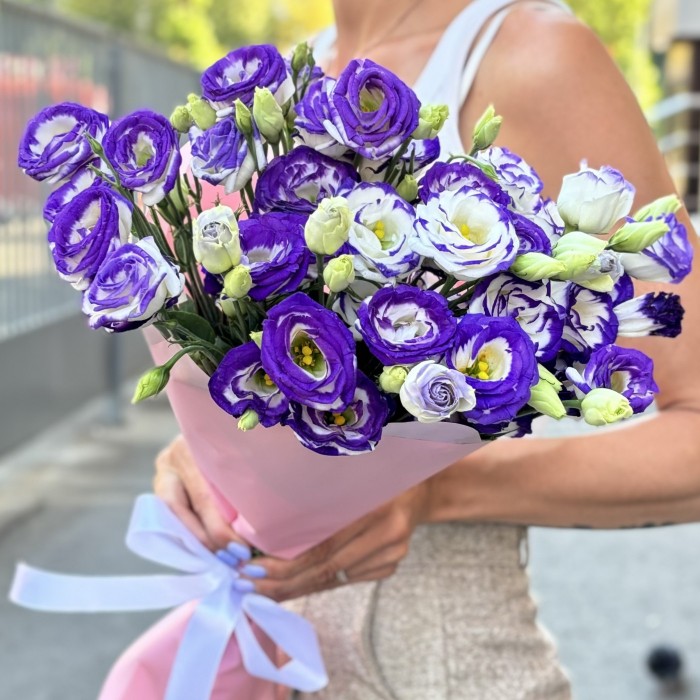 Нежная и романтичная бело - фиолетовая эустома в стильной упаковке.