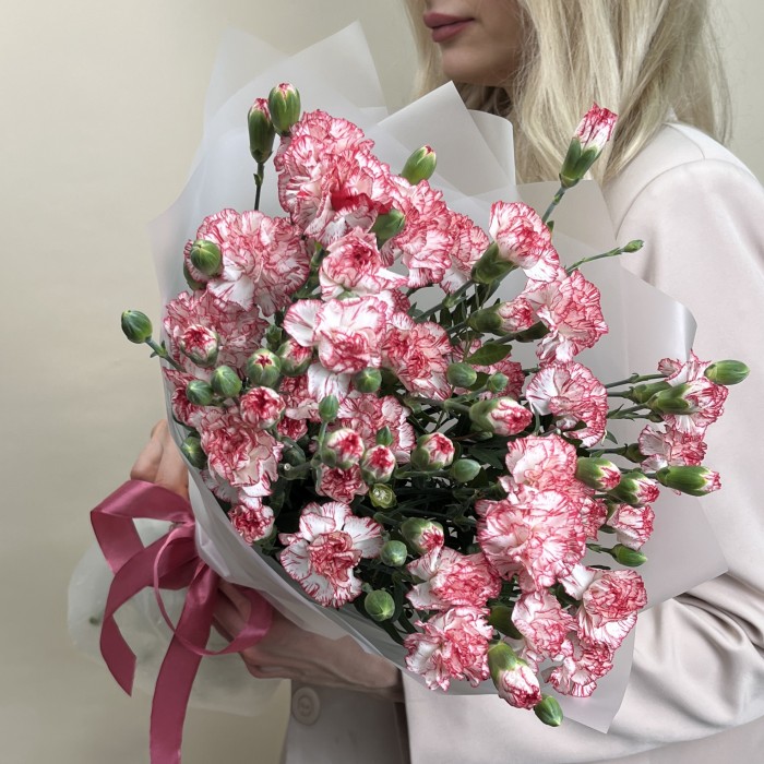 Этот элегантный букет состоит из 15 белых гвоздик с красной каймой. Их нежные белоснежные лепестки с яркой каймой придают композиции изысканность и свежесть. Такой букет отлично подойдет для подарка на праздник, выражения благодарности или просто для того, чтобы подчеркнуть особое настроение. Он символизирует чистоту, нежность и искренние чувства, создавая приятную атмосферу тепла и радости.