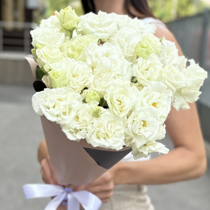 Нежная и романтичная махровая белая эустома в стильной упаковке.