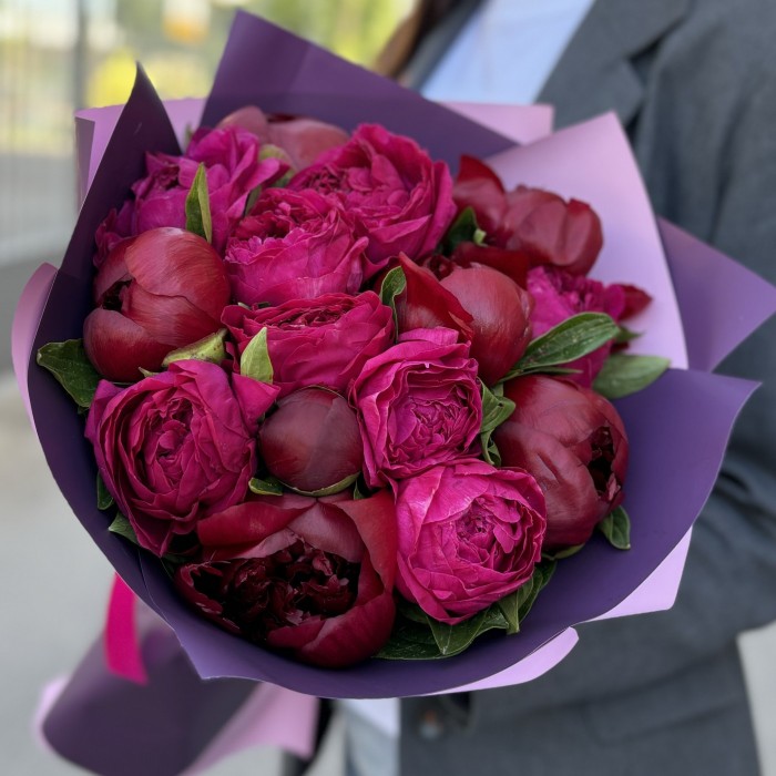Состав букета: пион Канзас - 8 шт, пион Ред Шарм - 7 шт, упаковка.