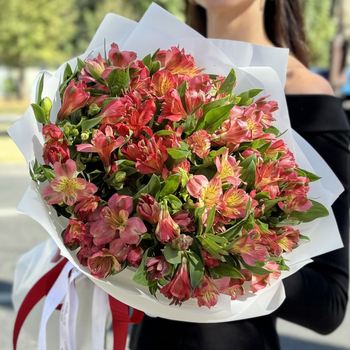 Букет из 25 красных альстромерий — это восхитительная композиция, которая излучает элегантность, страсть и радость. Альстромерии имеют яркие и разнообразные цветовые оттенки, а красный цвет символизирует любовь и страсть. Такой букет станет великолепным подарком для тех, кого вы активно цените и хотите порадовать.