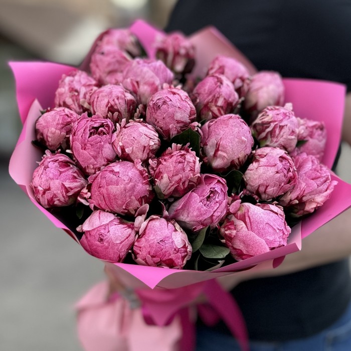 Роскошный букет из 25 розовых пионов-символ любви и восхищения. Благородные ароматные пионы-самые желанные и любимые цветы для многих.