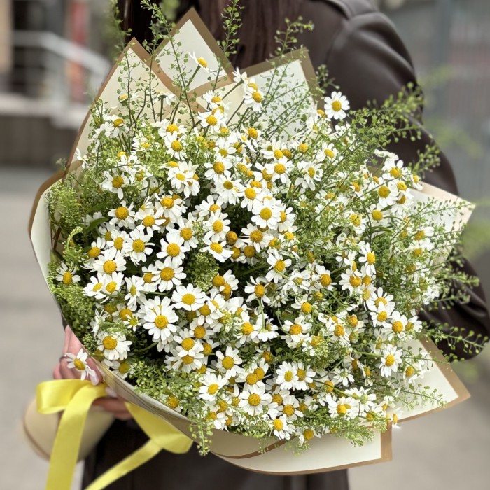 Нежный букет из кустовых ромашек с тонким пряным ароматом. Такой букет прекрасно подойдет в качестве подарка на день рождения или сюрприза на свидание. Доставляем цветы по городу Москве и городам Подмосковья.